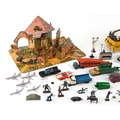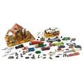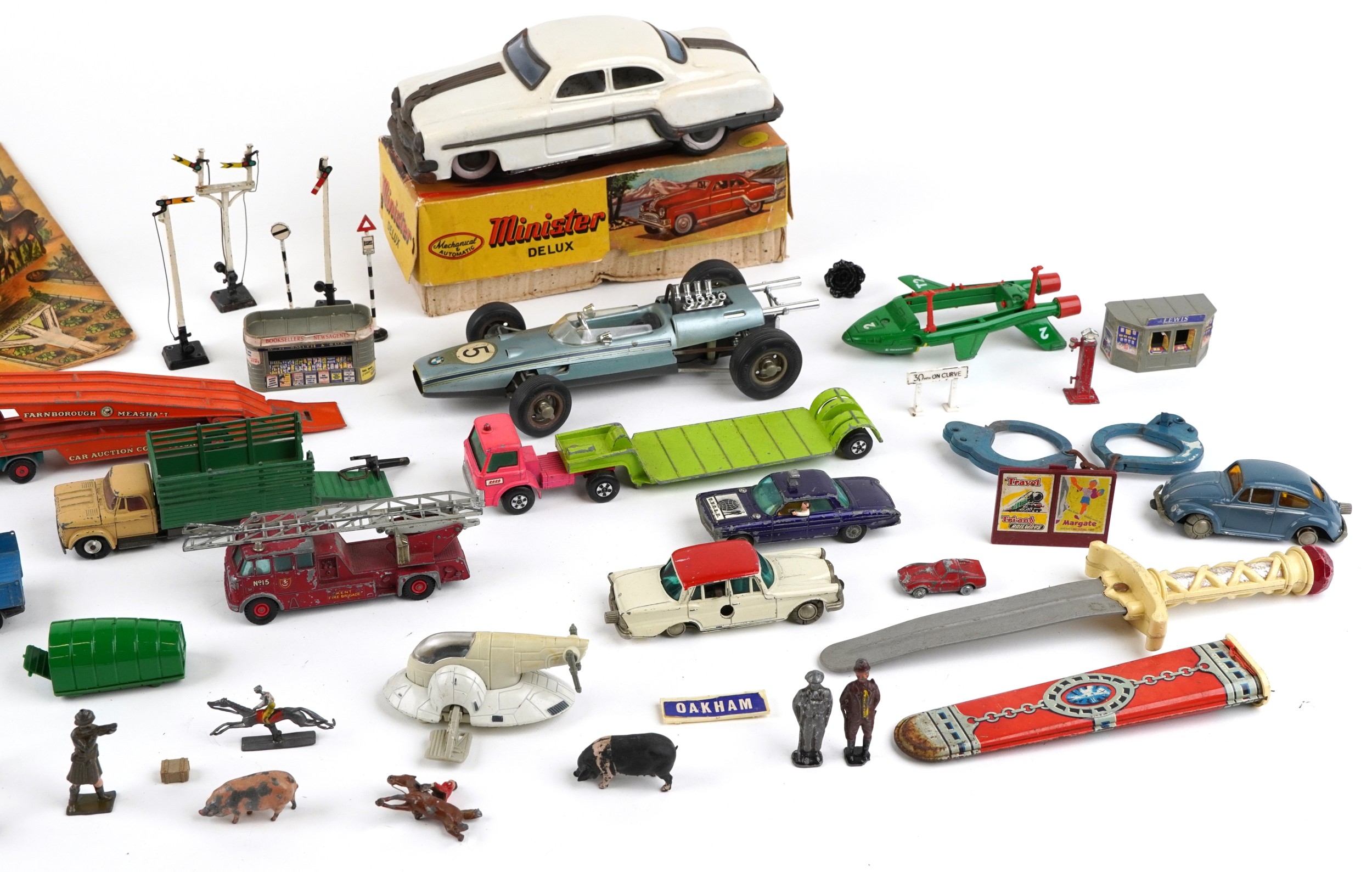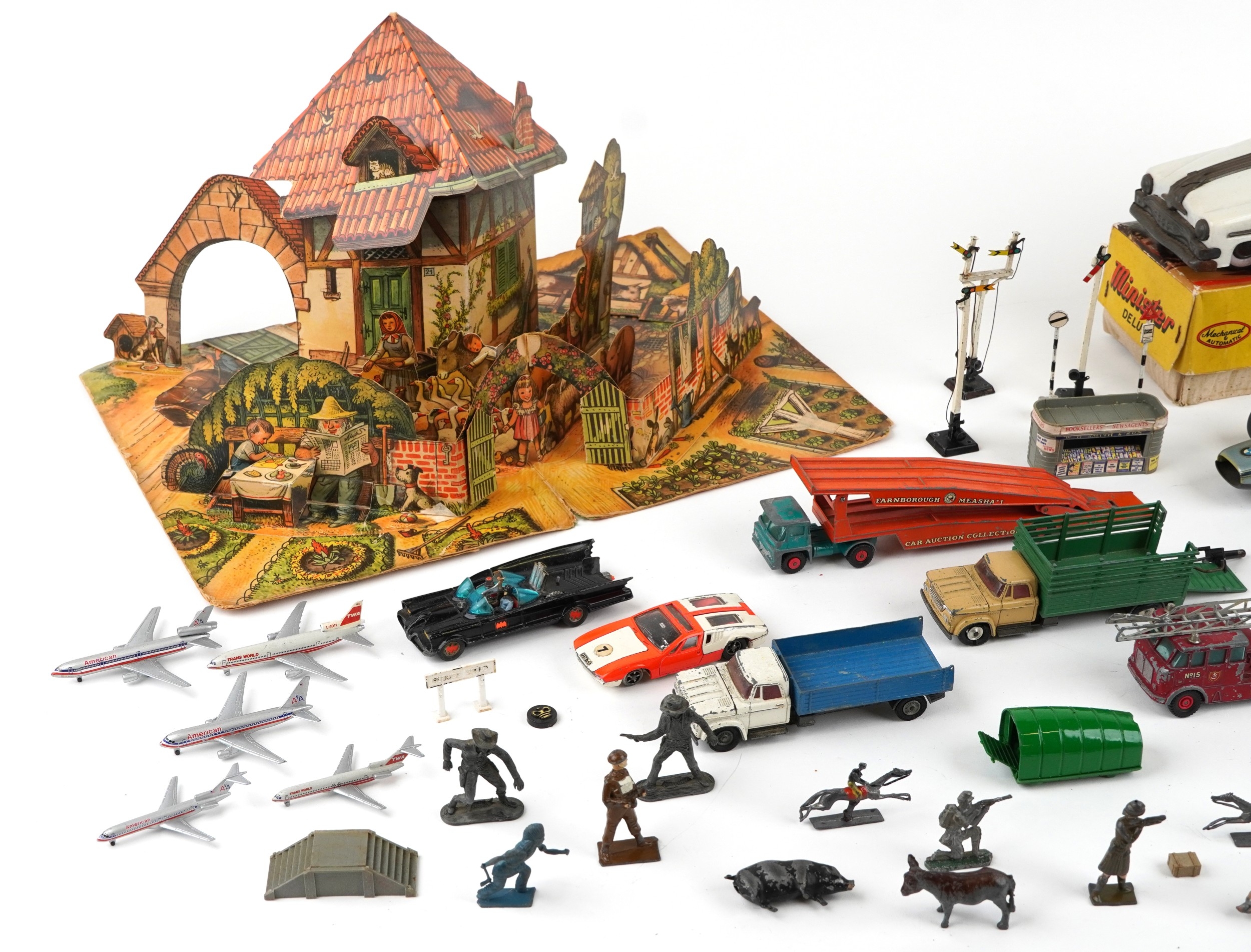 Vintage toys including a Minister Deluxe tinplate car, Corgi diecast vehicles, lead figures and a pop up farmyard, the largest 32cm high.