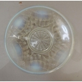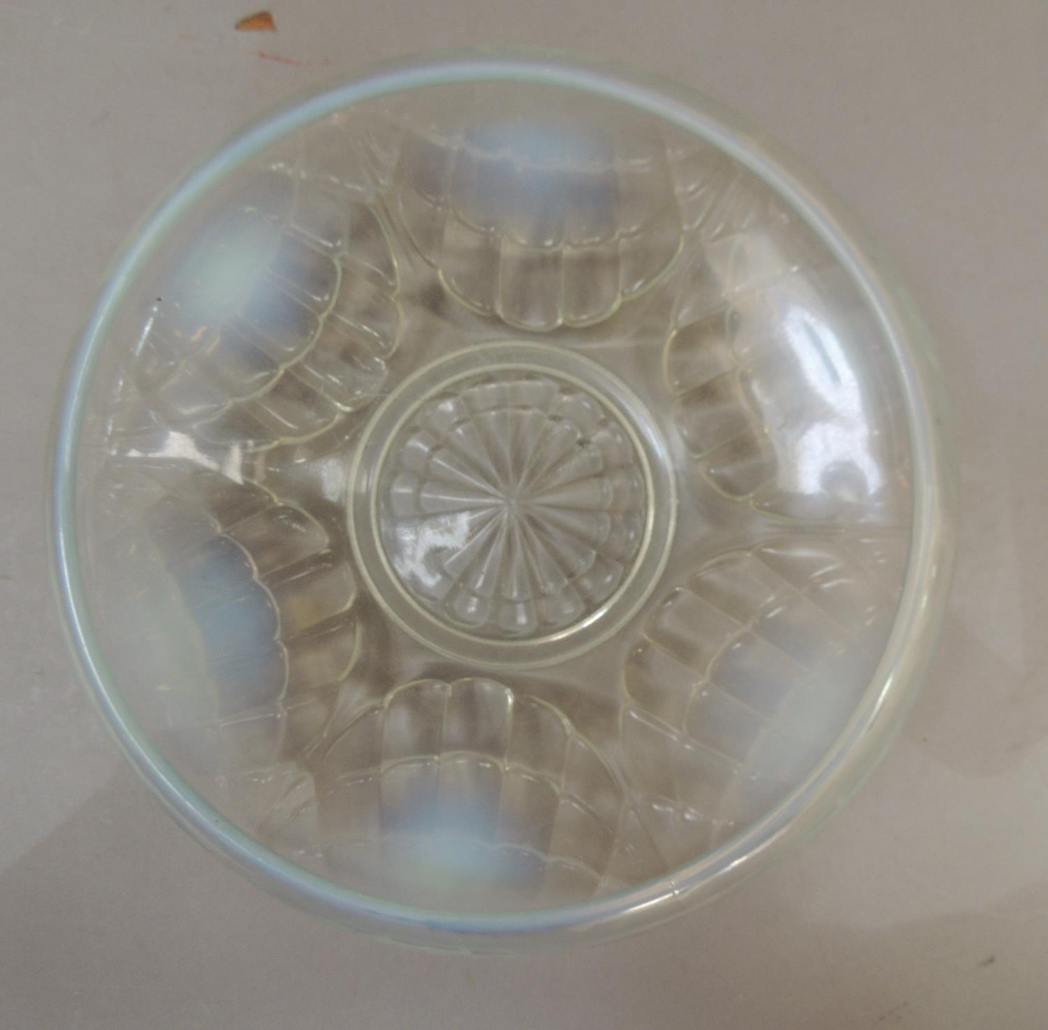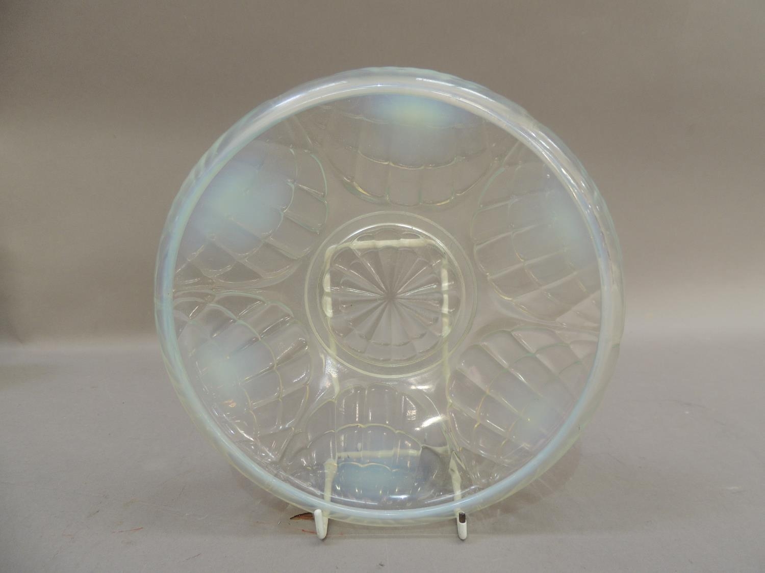 An English opalescent glass bowl, moulded in relief with stylised shells, 20cm diameter, indistinct impressed mark