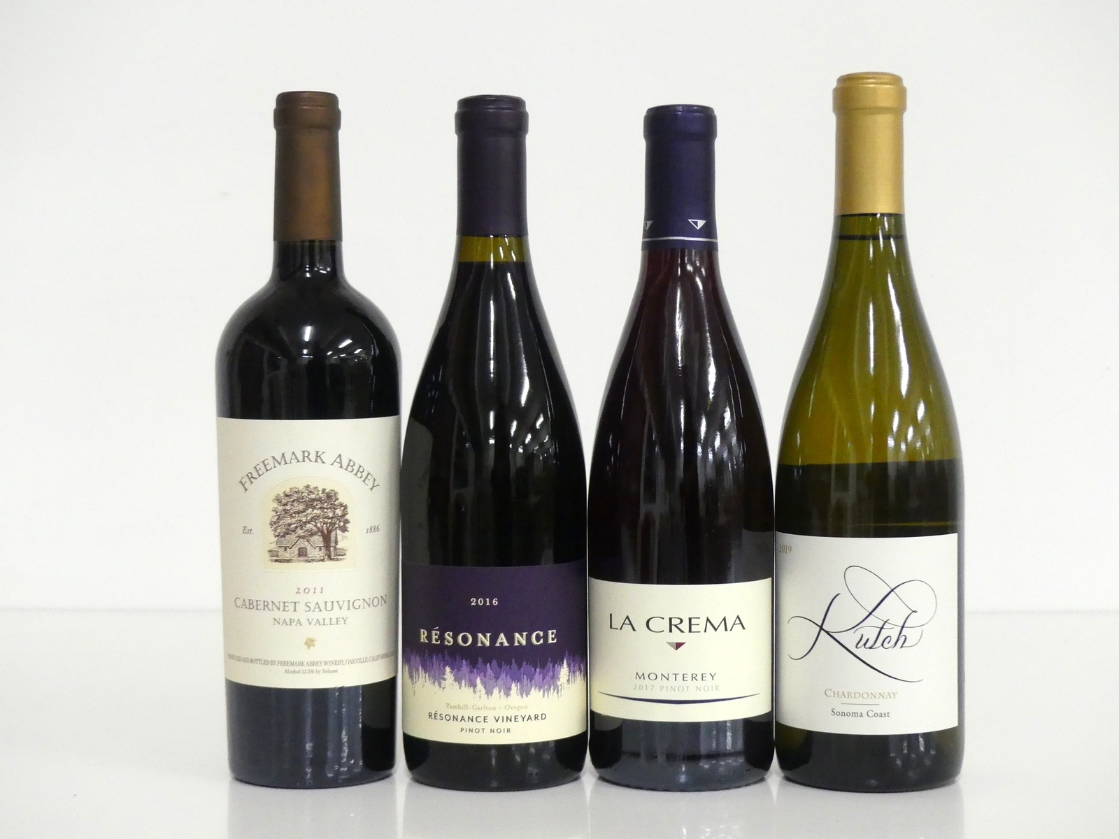 1 bt Freemark Abbey Cabernet Sauvignon 2011 Napa Valley i.n 1 bt Résonance Vineyard Pinot Noir 2016 Yamhill-Carlton 1 bt La Crema Pinot Noir 2017 Monterey 1 bt Kutch Chardonnay 2019 Sonoma Coast Above 4 bottles