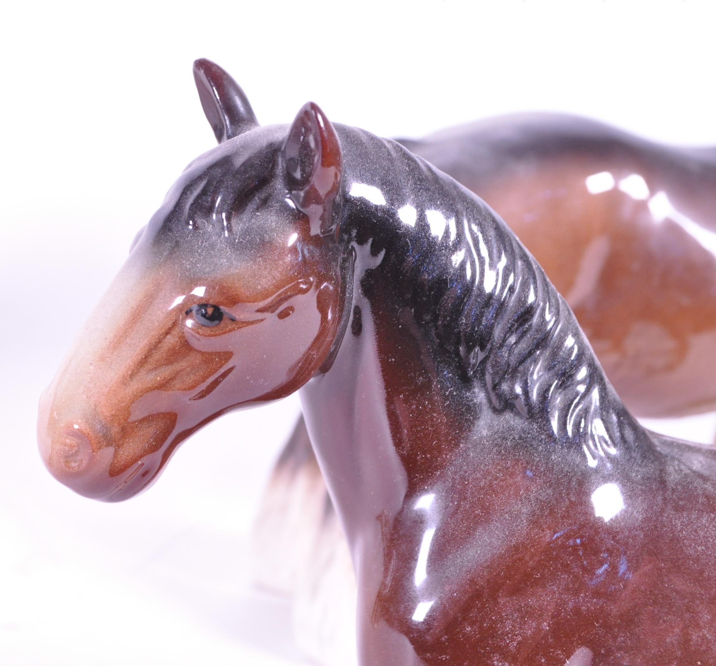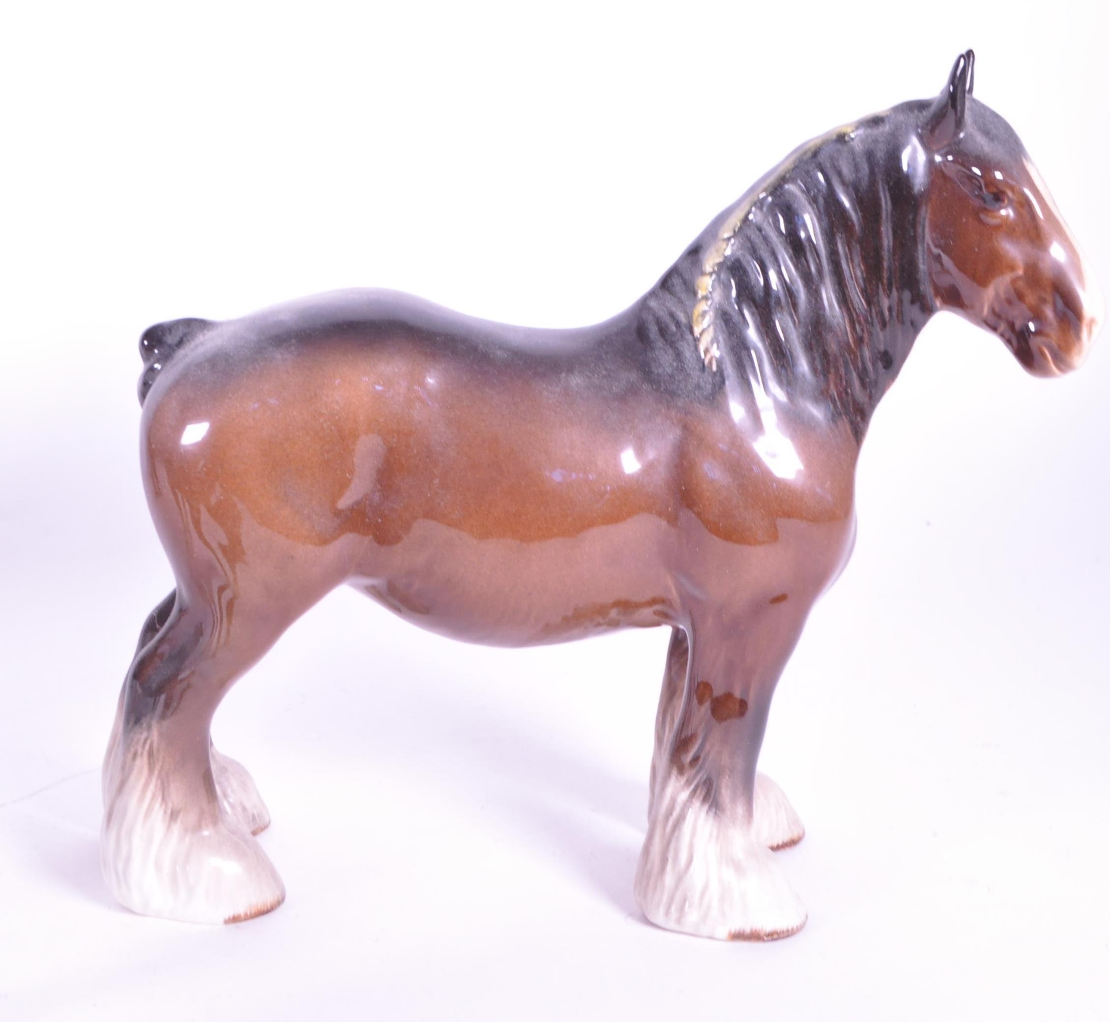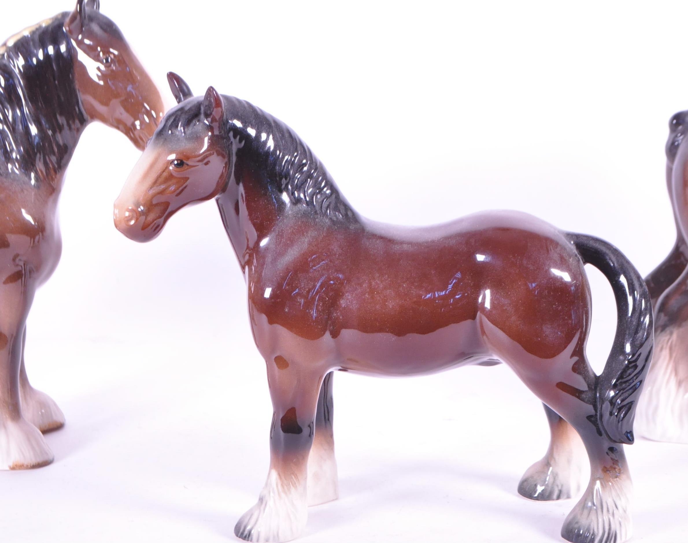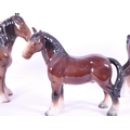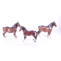 John Beswick - A collection of three china porcelain Shire horse figurine / statues. Two with braids, standing positions with makers mark to underside.