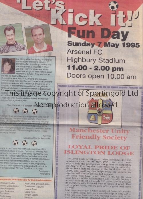 FUN DAY AT ARSENAL Newspaper programme for "Let's Kick It" Fun Day 7/5/1995 at Highbury. Good
