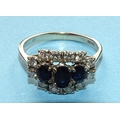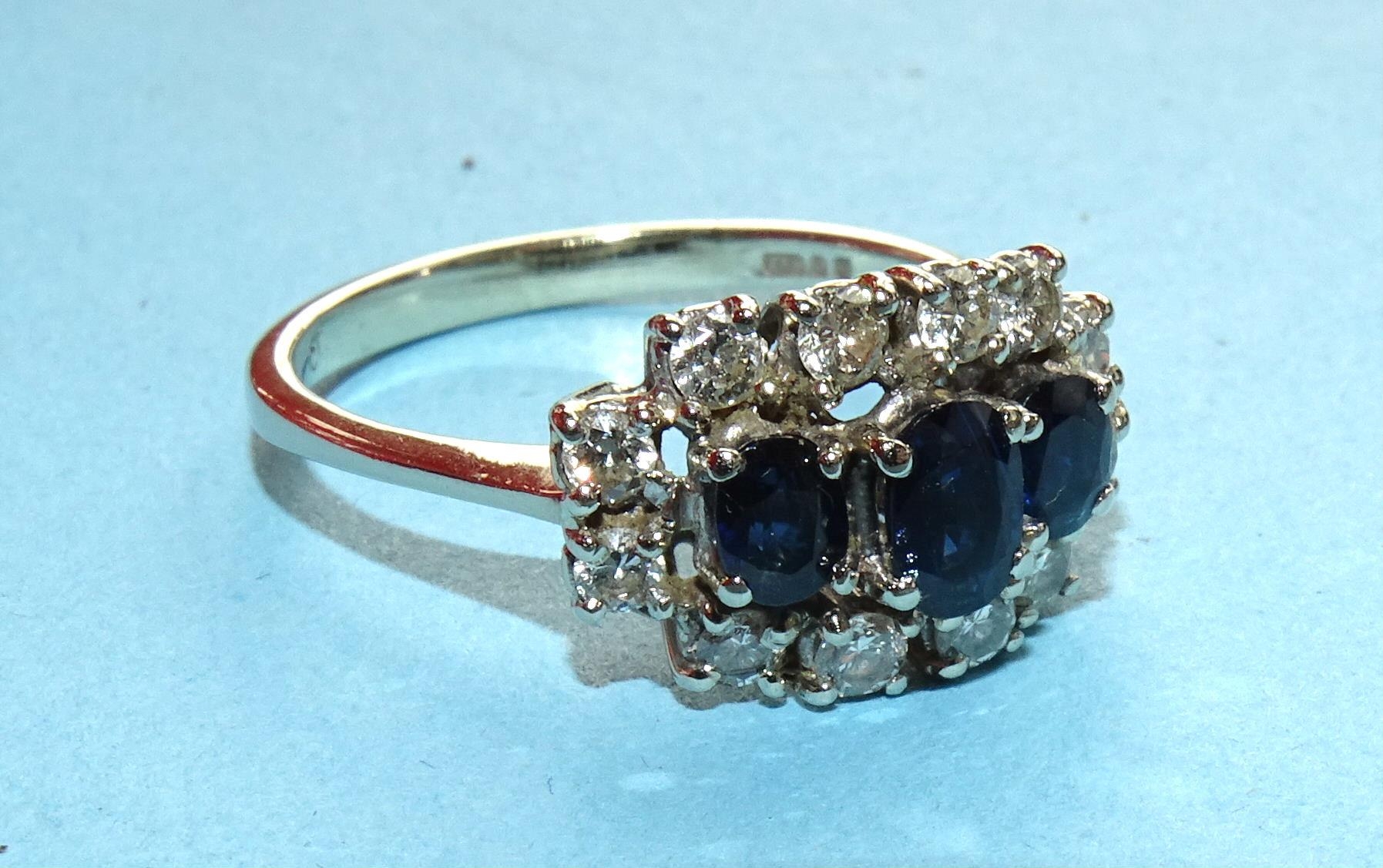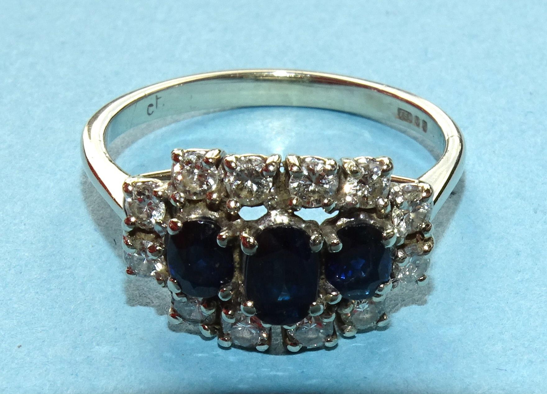 A sapphire and diamond cluster ring claw-set three oval sapphires within border of twelve brilliant-cut diamonds, in 18ct white gold mount, size O, 3.6g.