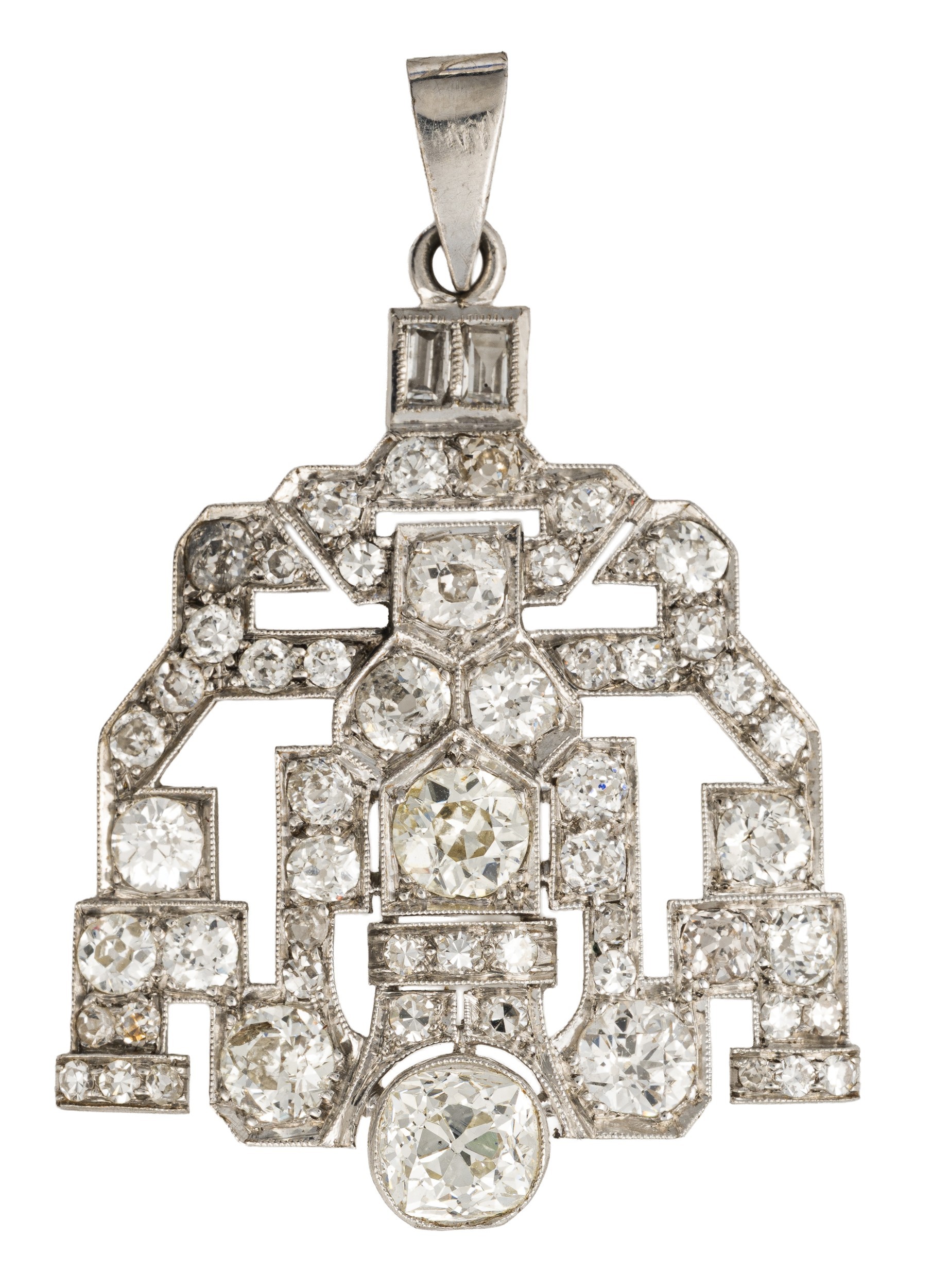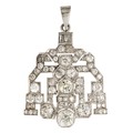 Tiara shaped, pave set with 51 old cut diamonds and 2 baguette cut diamonds with a combined weight of 7.70 carats, colour F-G, clarity VS, in an 18ct white gold hand pierced pendant, length 5,5cm, width 3,5cm, 9,1g all in