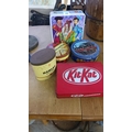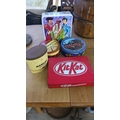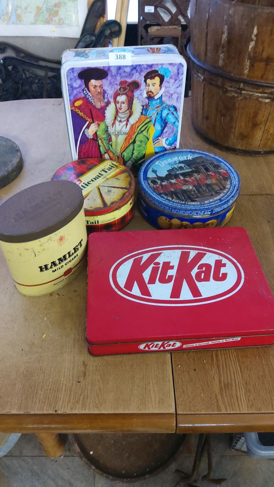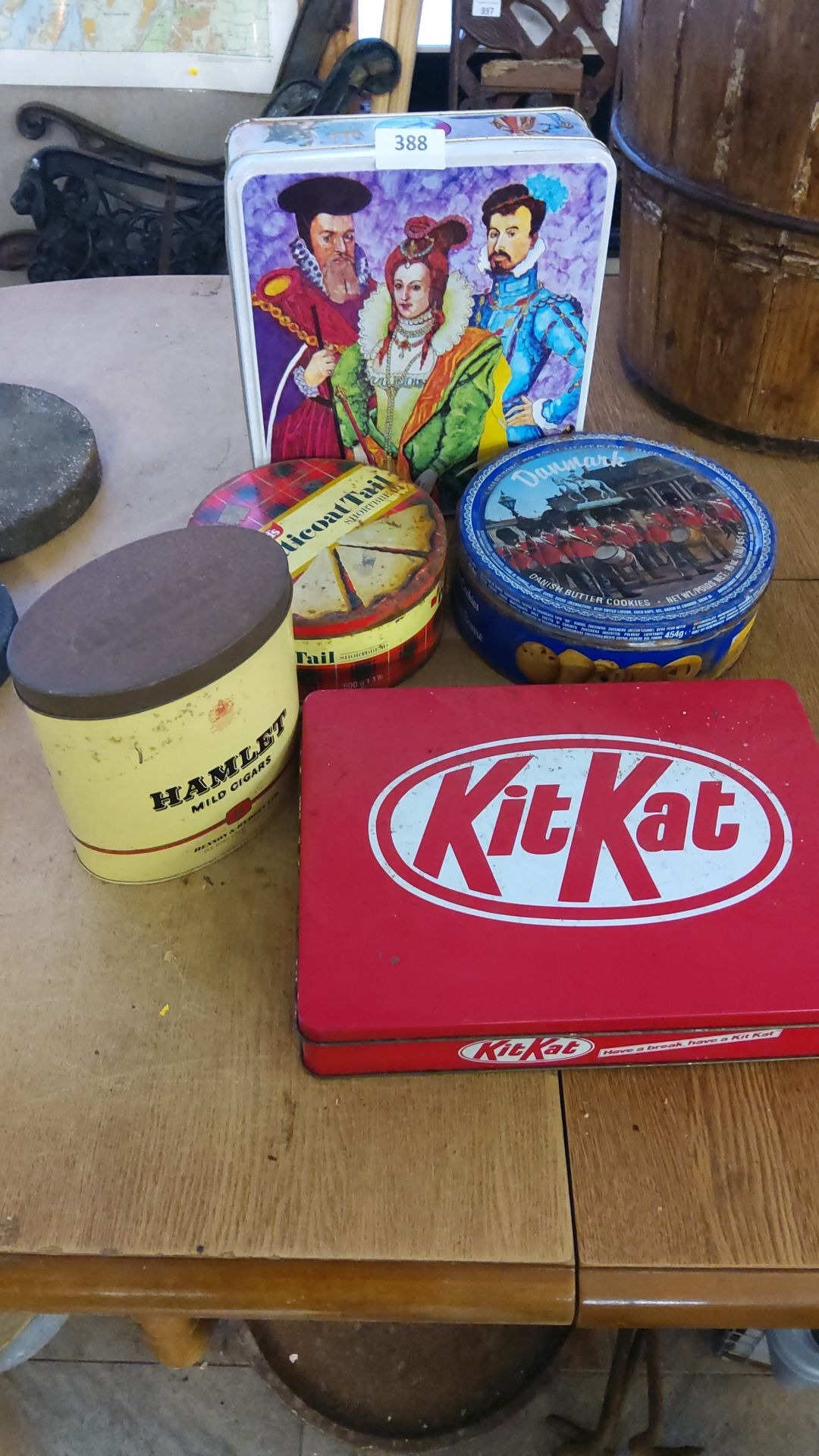 Mixed lot of vintage collectible tins, featuring KitKat, Hamlet Cigars, Ducal Tail, Danish Butter Cookies, and a colorful family portrait design.