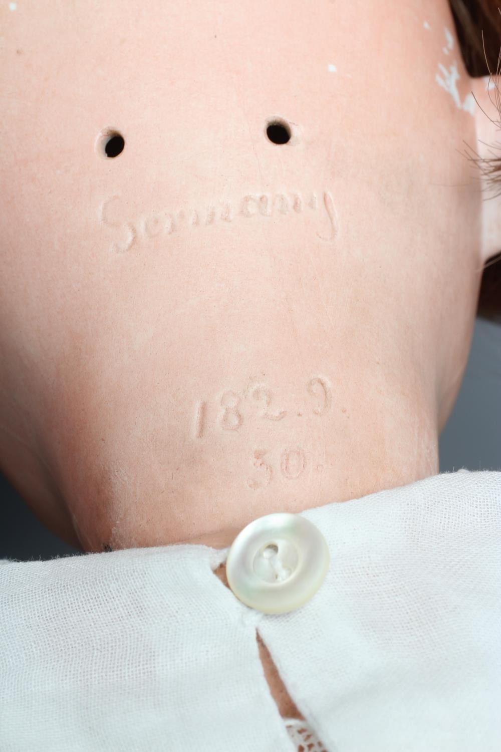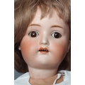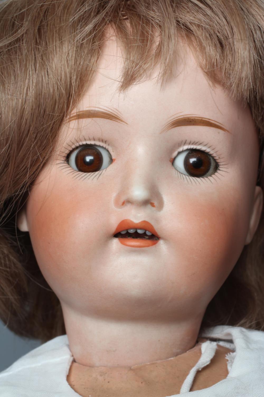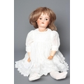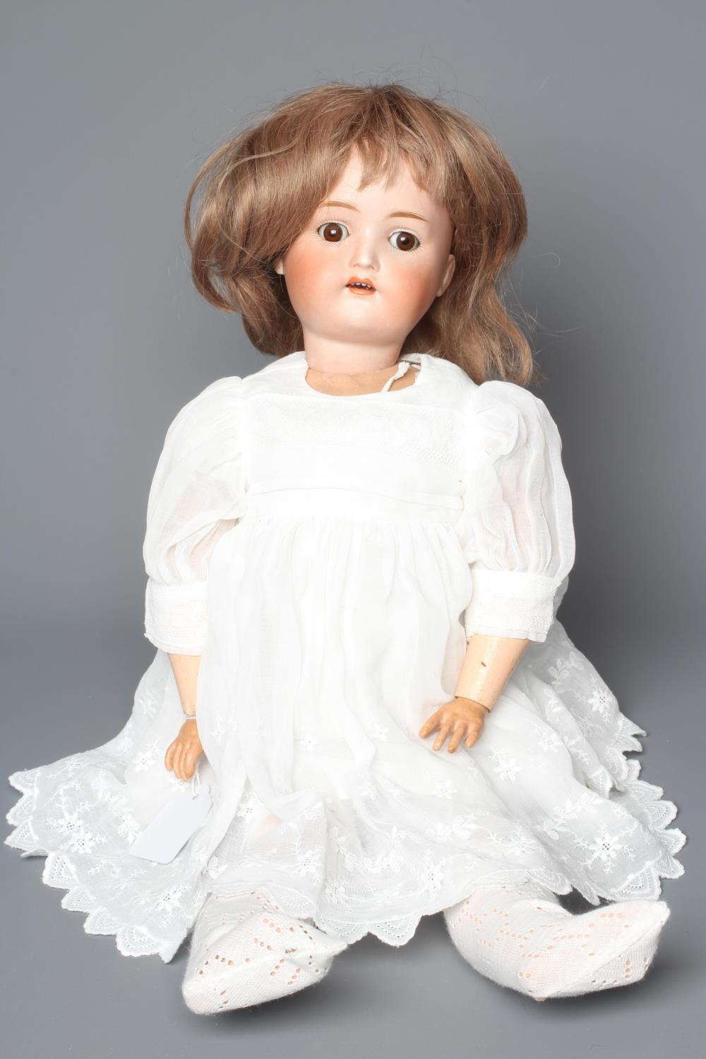 A Kestner bisque socket head doll, with brown glass sleeping eyes, open mouth, applied teeth, wood and composition jointed body, and white dress, numbered 182 9 30, 21" long