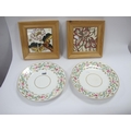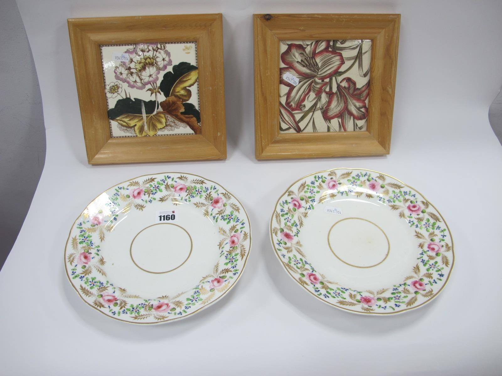 A Pair of Pine Framed XIX Century Floral Tiles, pair of XIX Century hand painted Bloor Derby plates with gilt highlights (4)