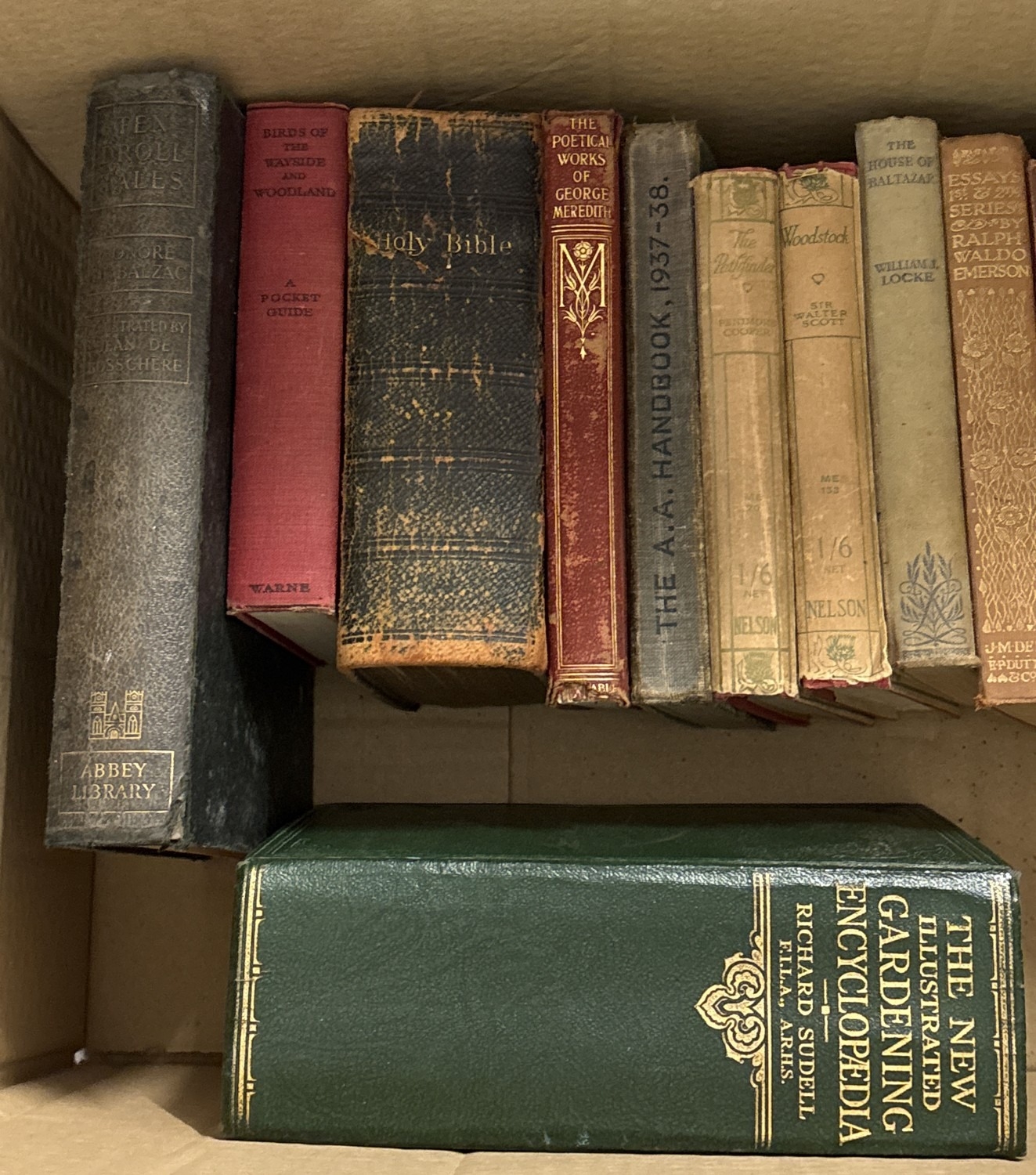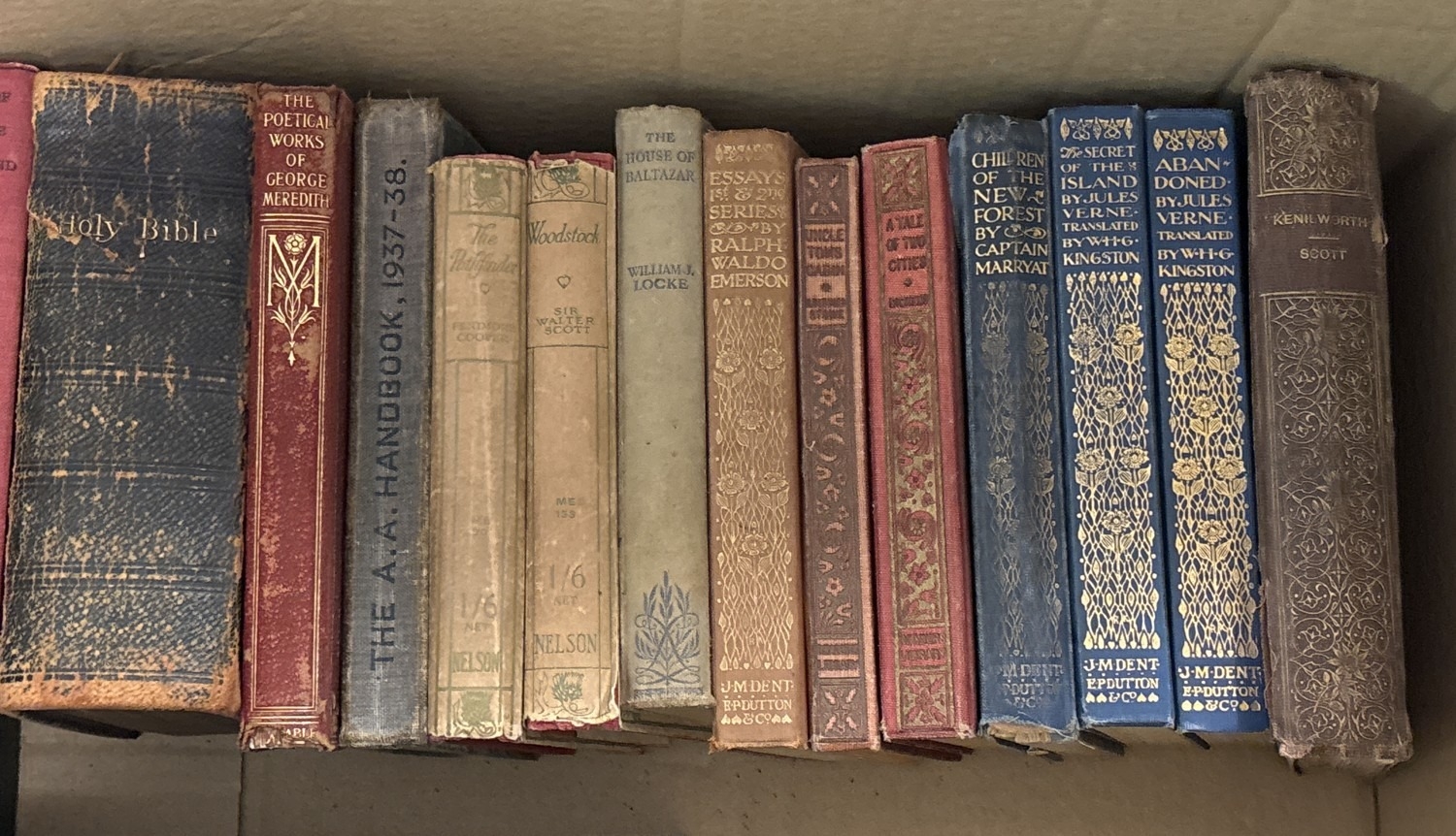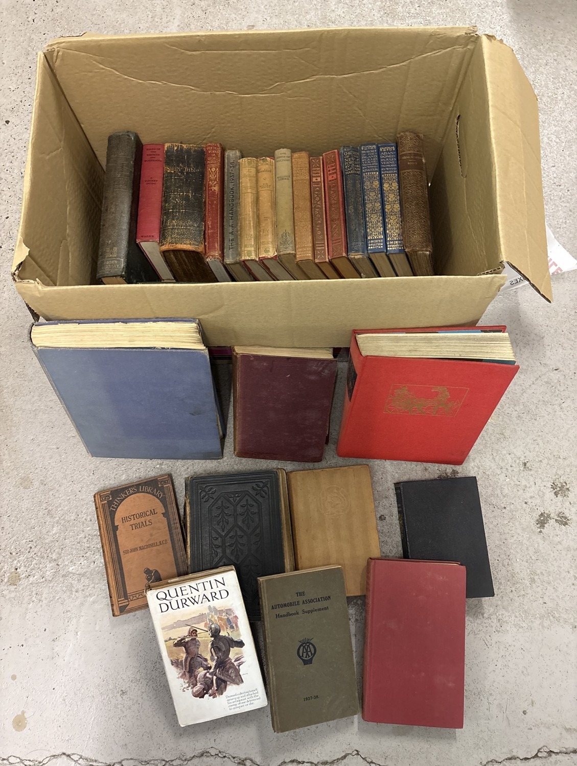 A box of 23 antique and vintage cloth bound books and bibles, in various conditions. Some with illustrations. To include Wooed and Married by Rosa. N. Carie, Cleopatra by H. Rider Haggard, The History of the Romans under the Empire Vol 2 by Charles Merivale, Historical Trials by Sir John Macdonald and The Silver Jubilee Book George V.