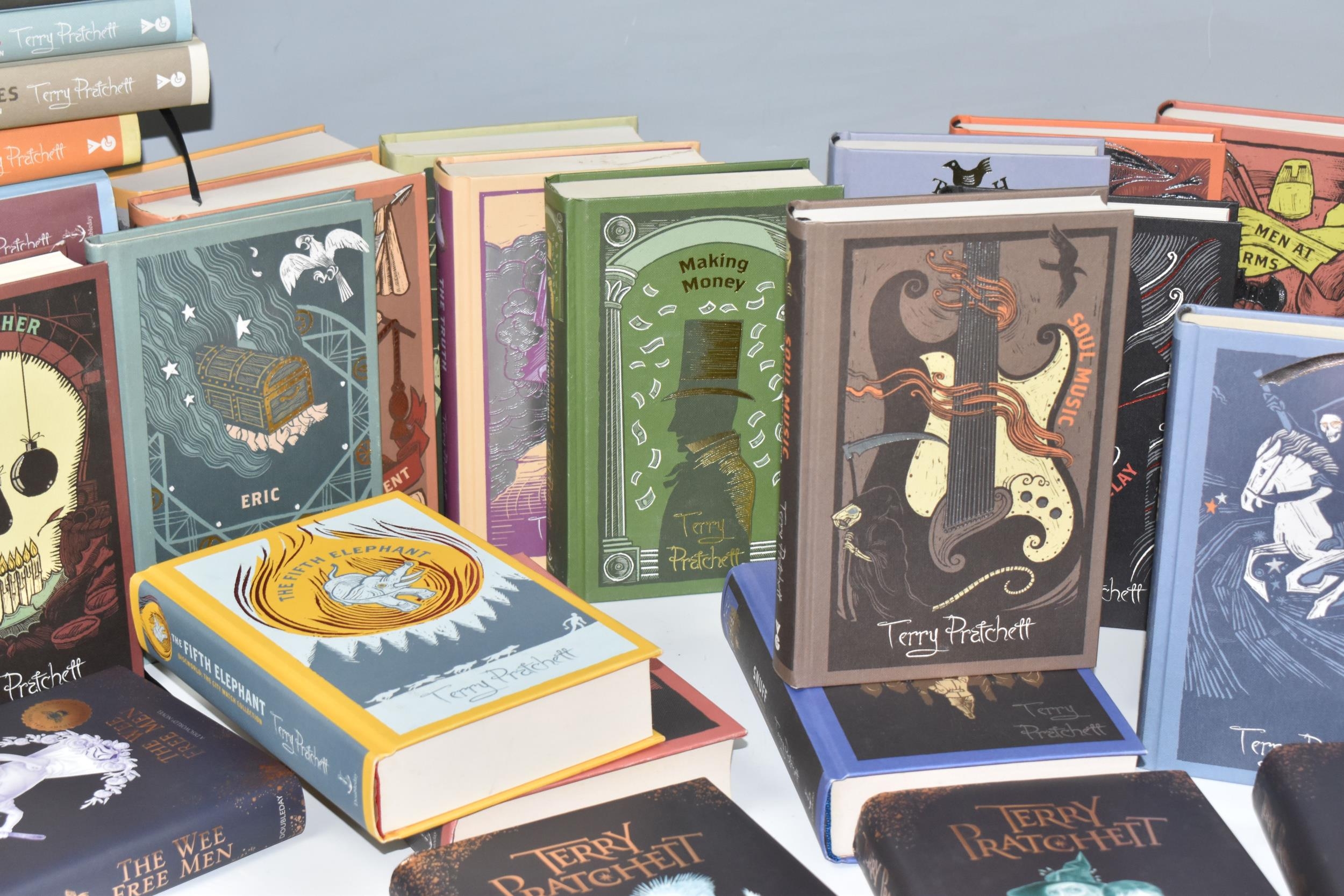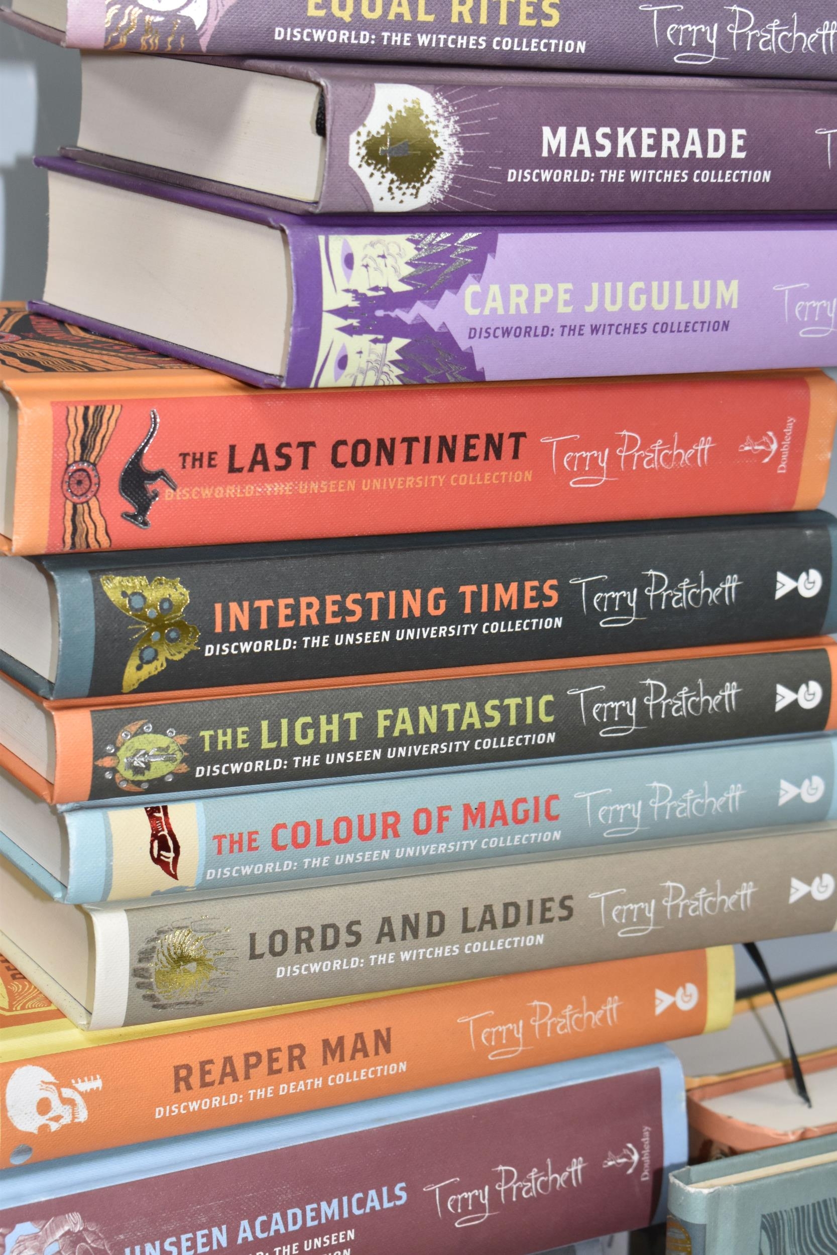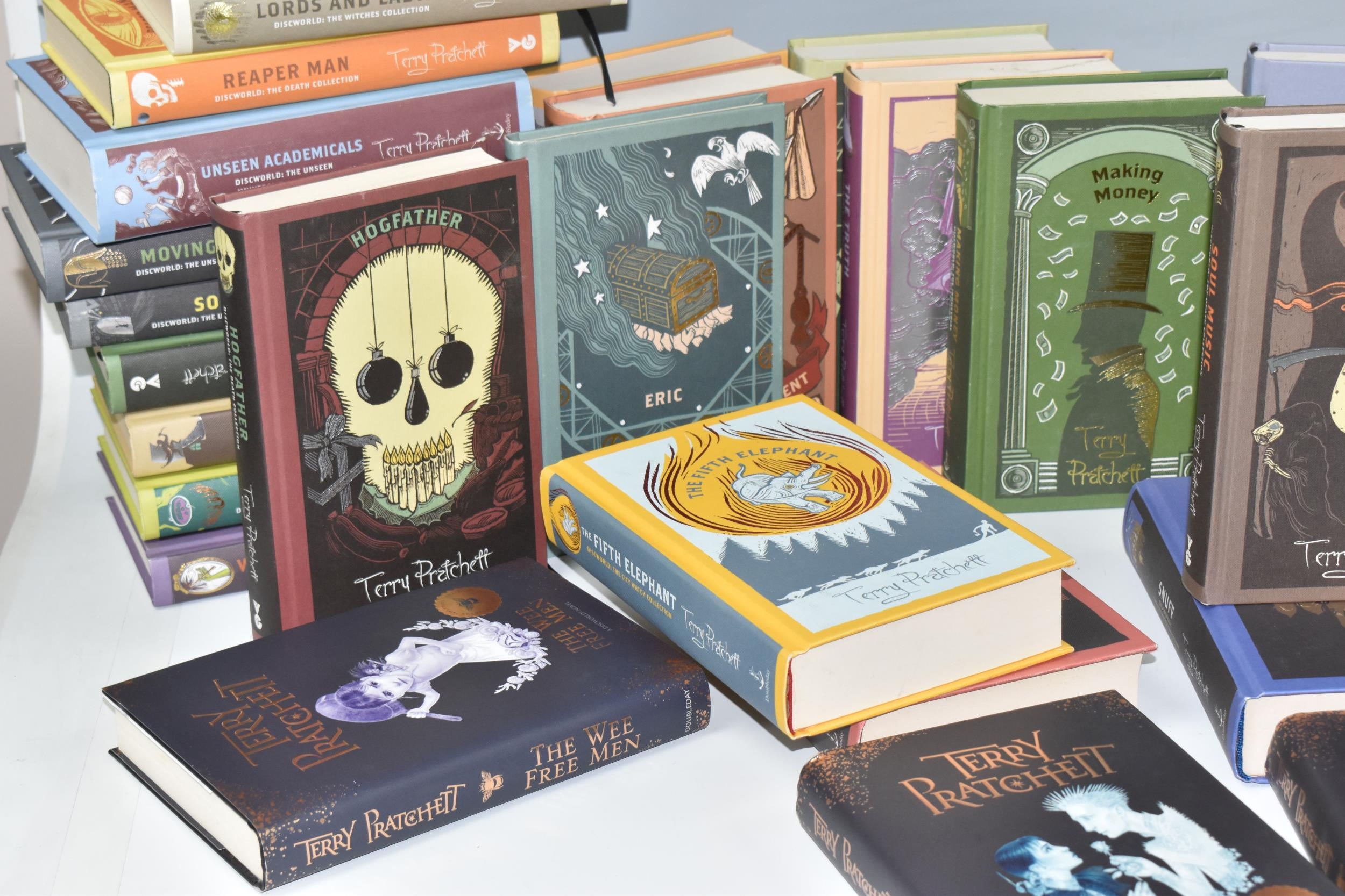 TWO BOXES OF TERRY PRATCHETT DISCWORLD NOVELS to include thirty-four 'Discworld Collectors Library' editions comprising eight novels of the 'Unseen University Collection,' six novels of 'The Witches Collection, two novels of 'The Gods Collection,' five novels of 'The Death Collection), five novels of 'The Industrial Revolution Collection,' eight novels of 'The City Watch Collection,' and five 'gift edition' titles comprising 'The Wee Free Men,' 'A Hat Full of Sky,' 'Wintersmith,' 'The Shepherds Crown,' and 'I Shall Wear Midnight (2 boxes) (Condition Report: some scratches and marks to spines and the tops of pages, possible foxing in areas)