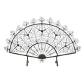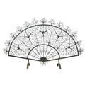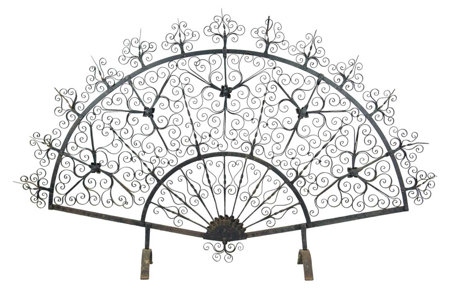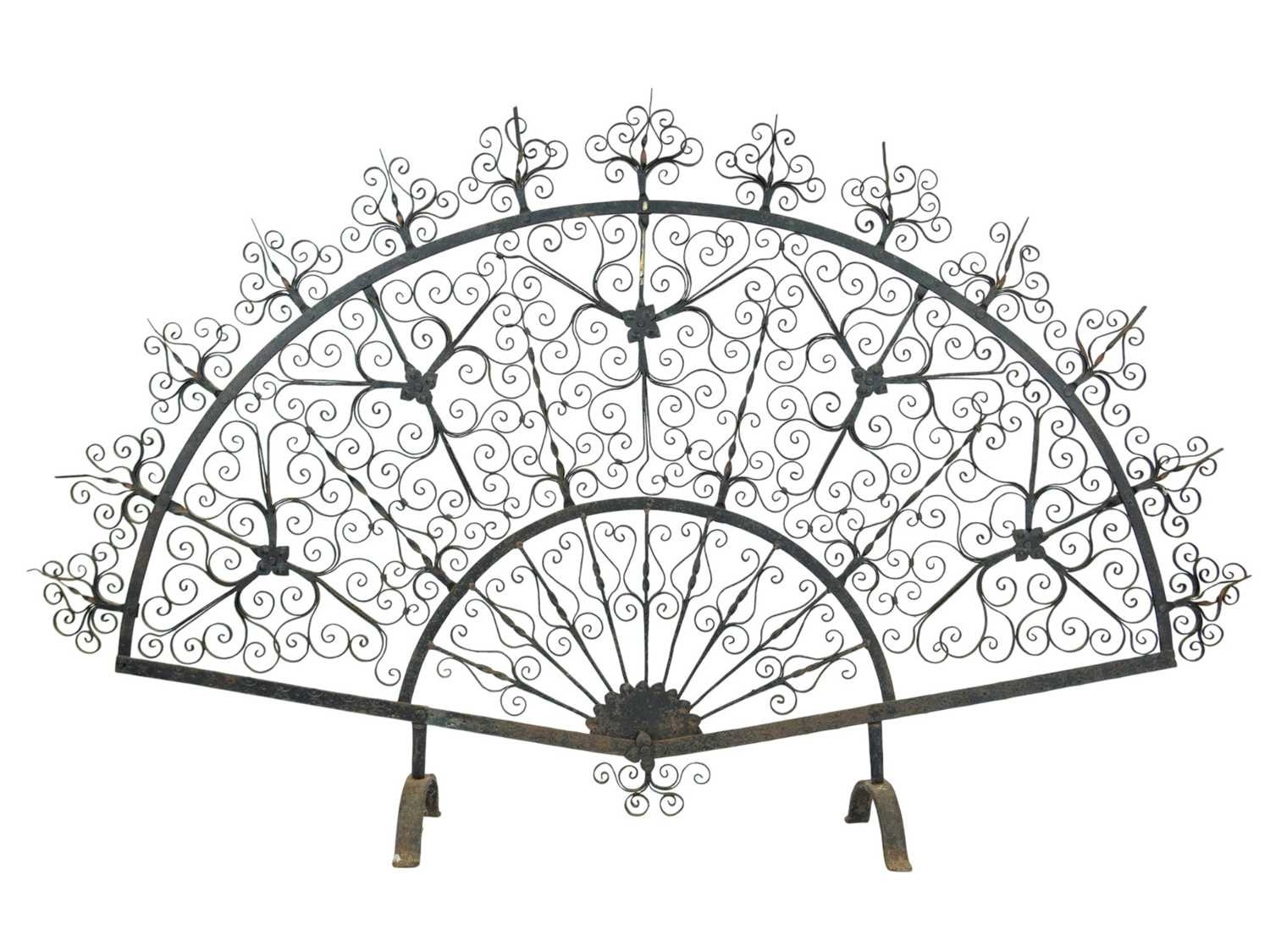 An ornate wrought iron fire screen, attributed to Archibald Carne of Truro. Of ornate fan shape, height 70cm, width 114cm. The feet and the chiselled design on the lower rail relate closely to other work by Carne, apparently unmarked.