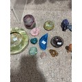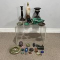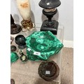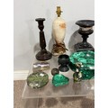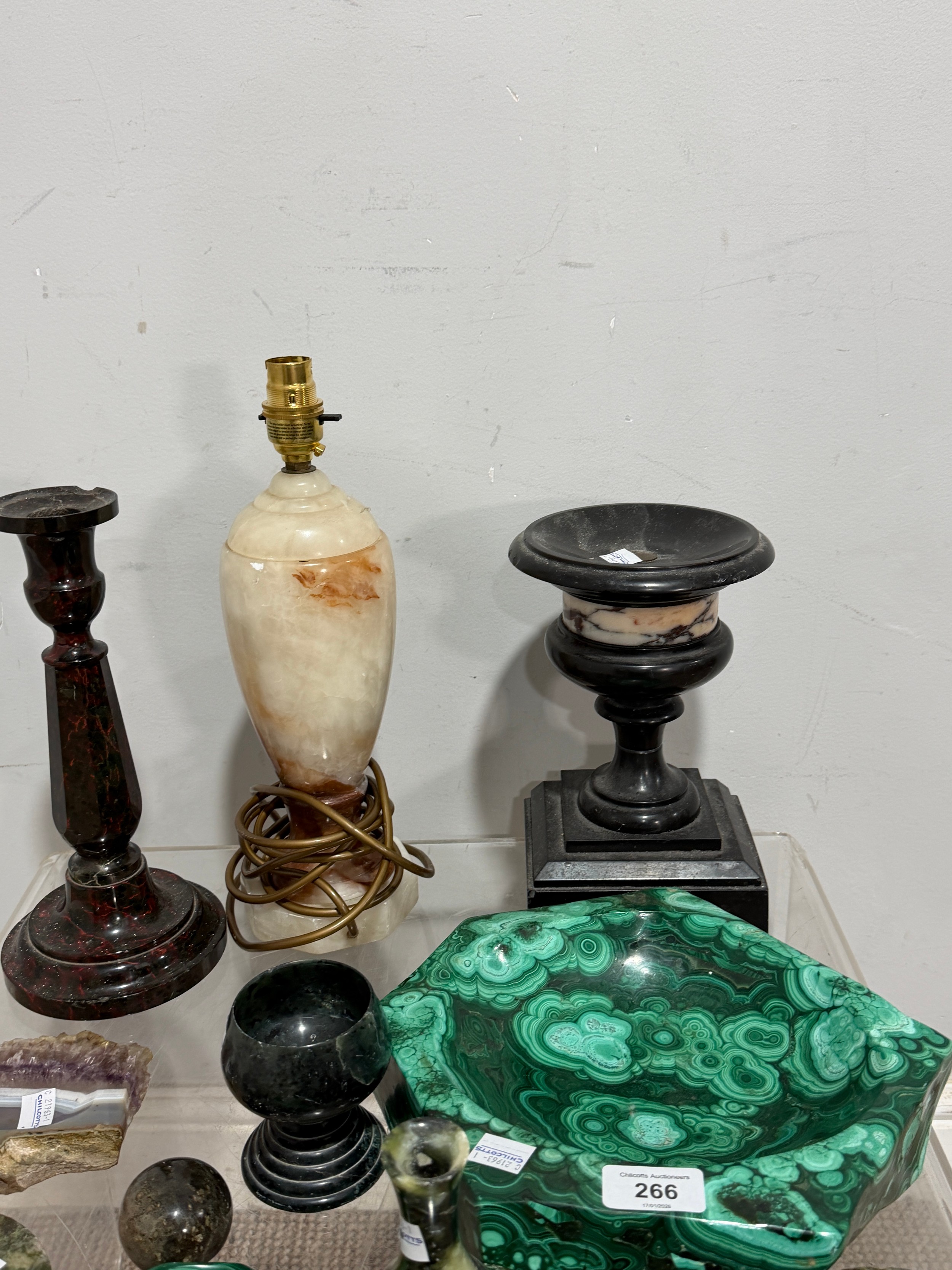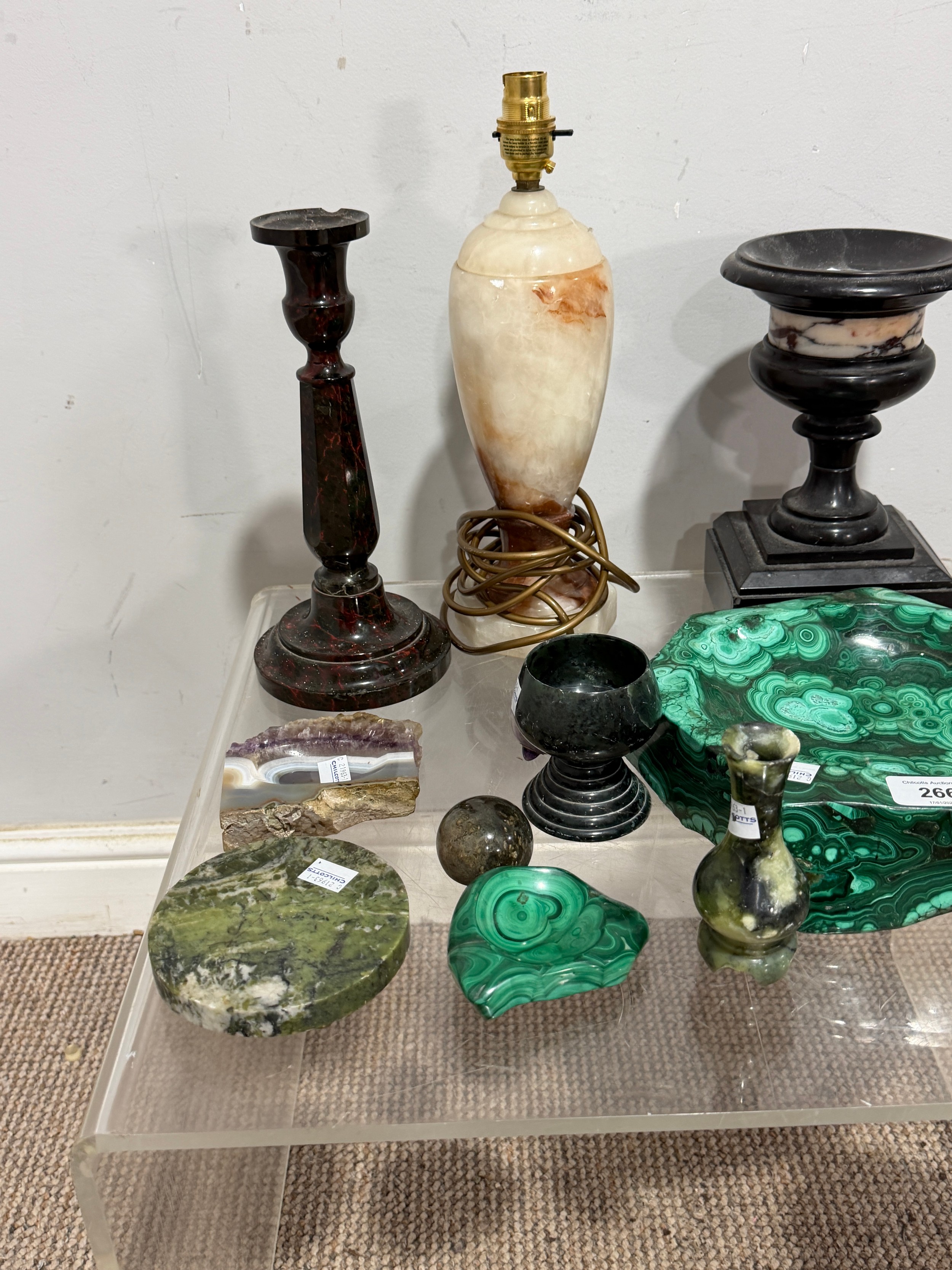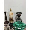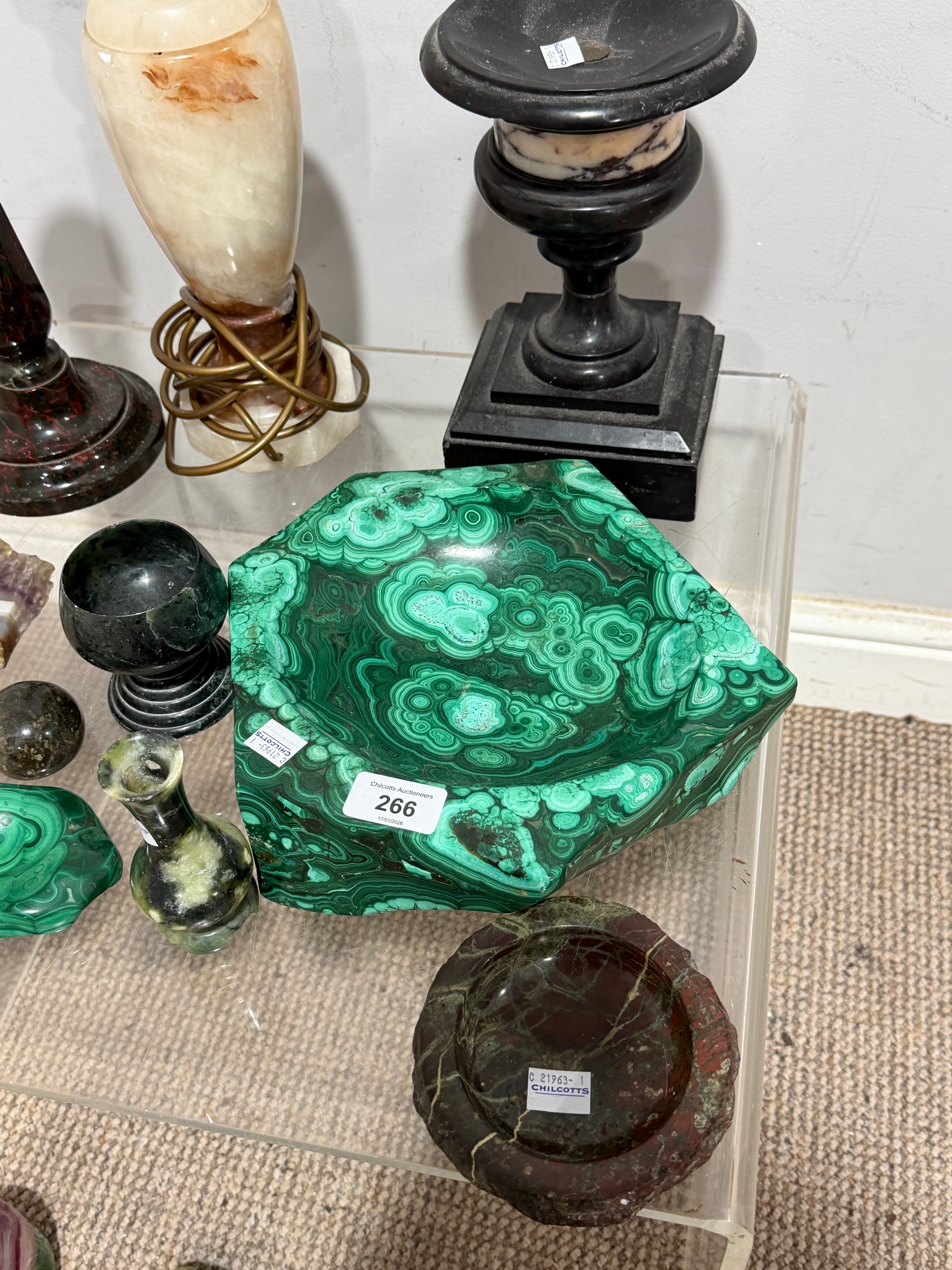 A large malachite bowl, together with a lapis lazuli carved elephant, green onyx ashtray and assorted carved semi-precious stone items (a lot)