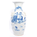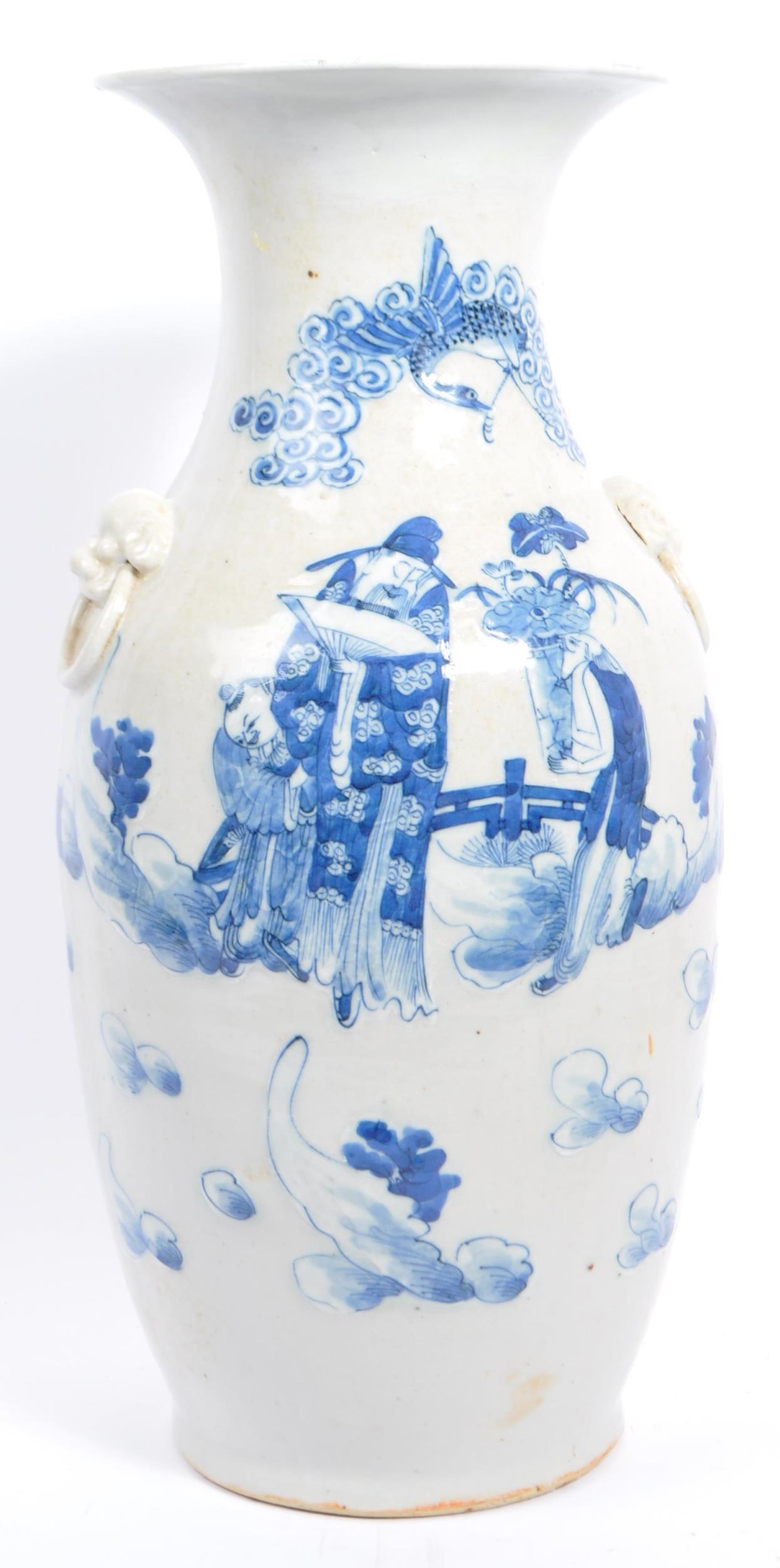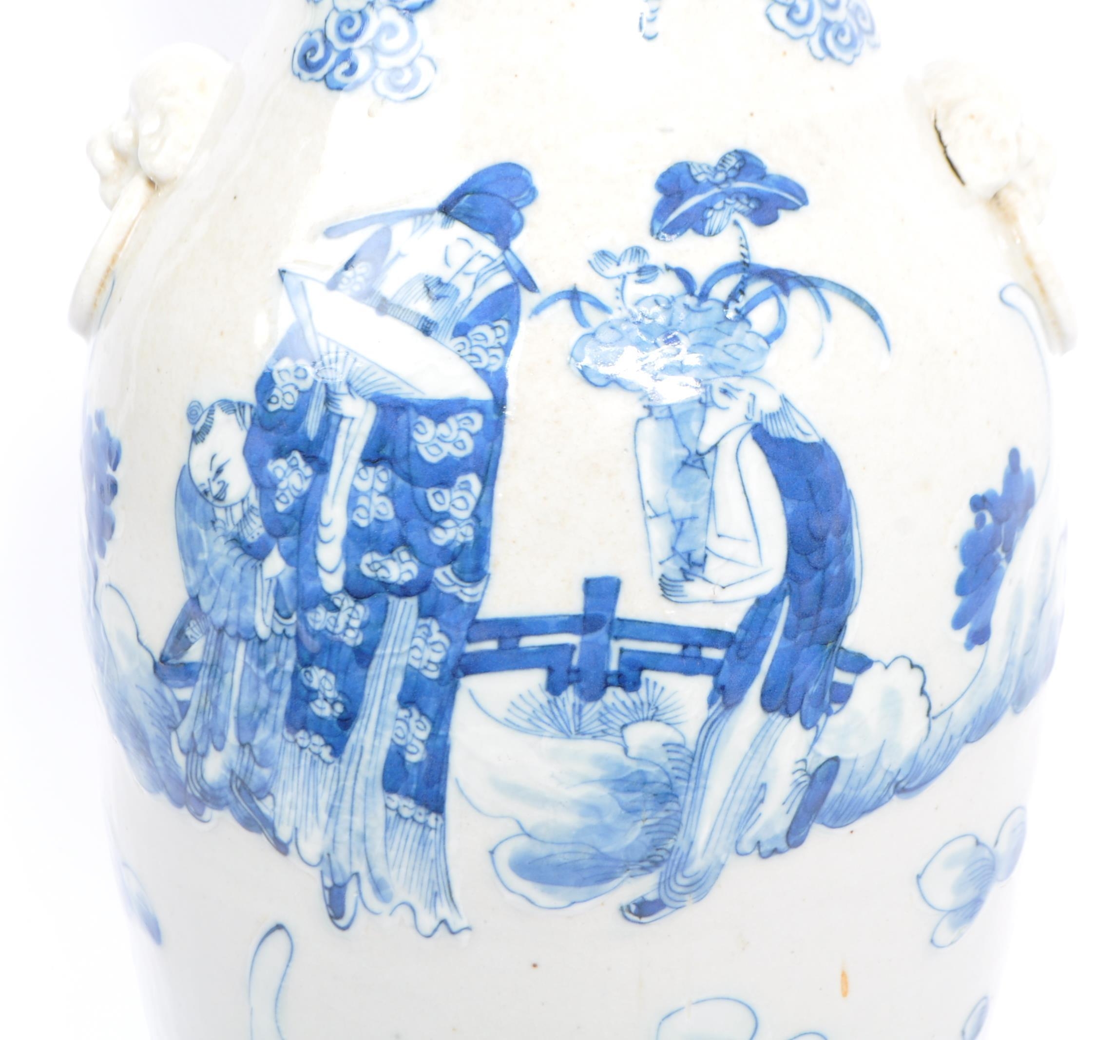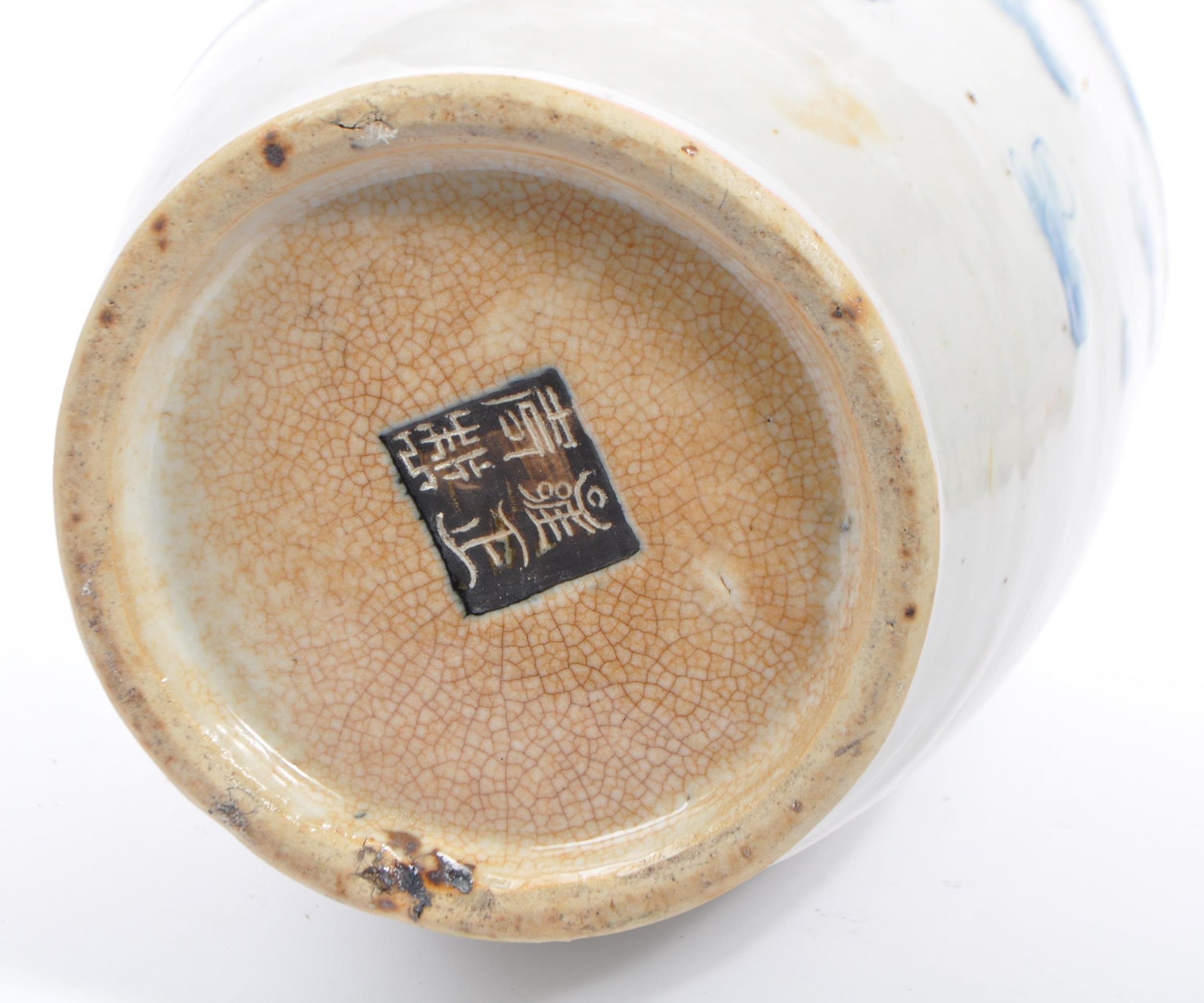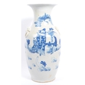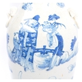 A 19th century Chinese hand painted blue and white porcelain cylindrical vase. The vase being hand painted with scenes of figures holding decorative vases amidst intricate foliates and raised static ceramic handles to sides. Marks to base. Measures 20cm tall.
