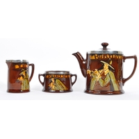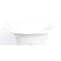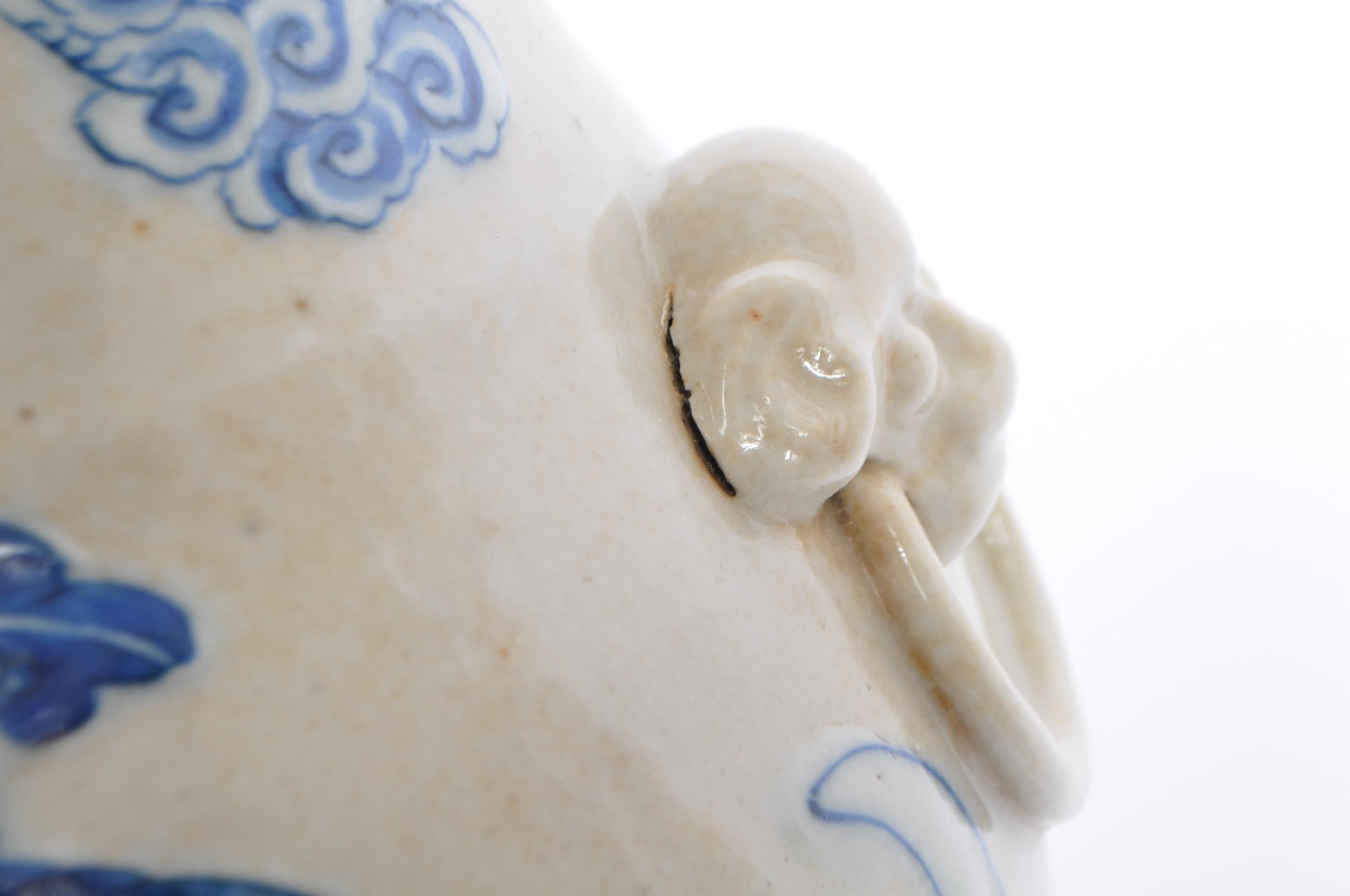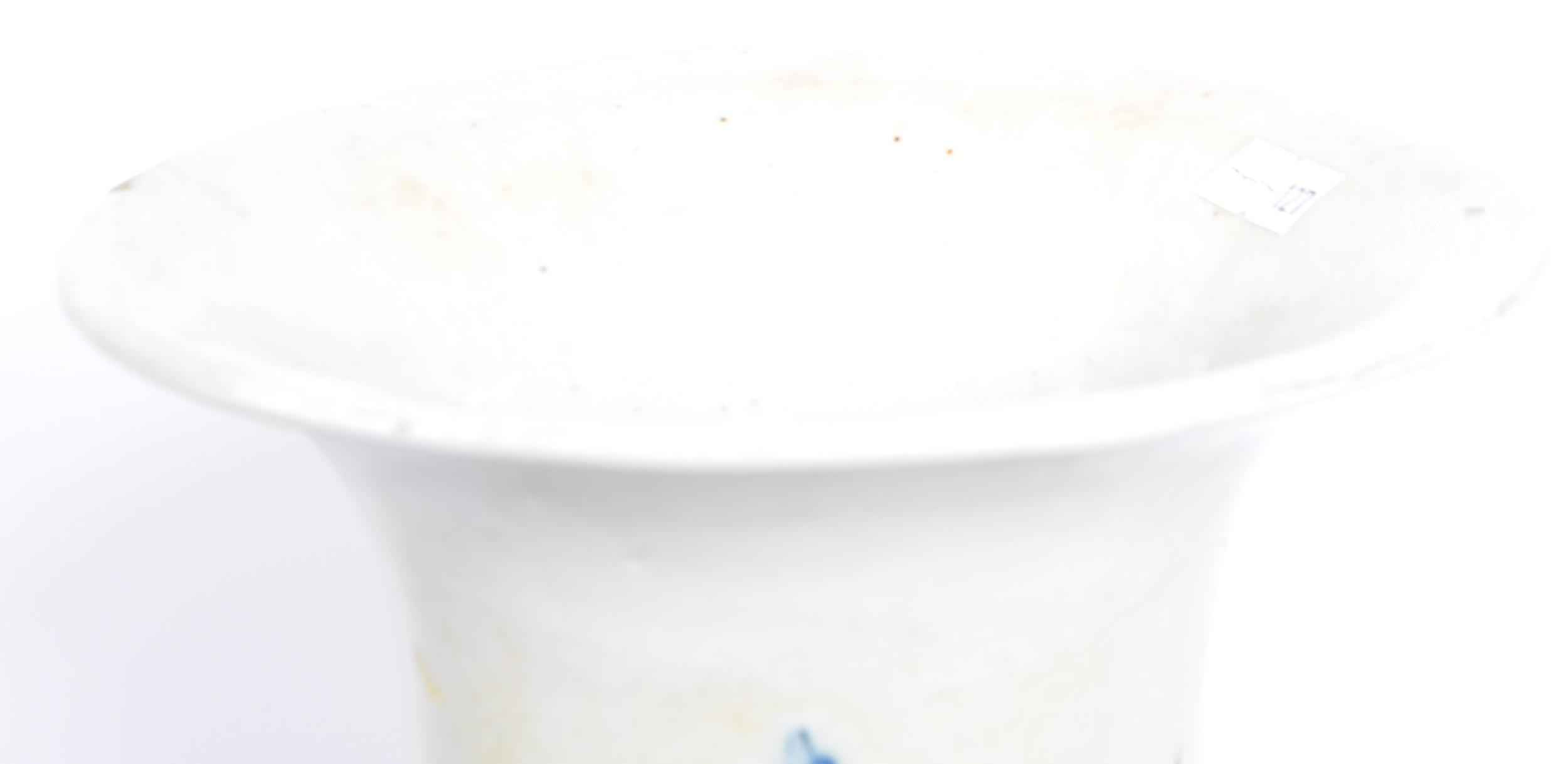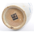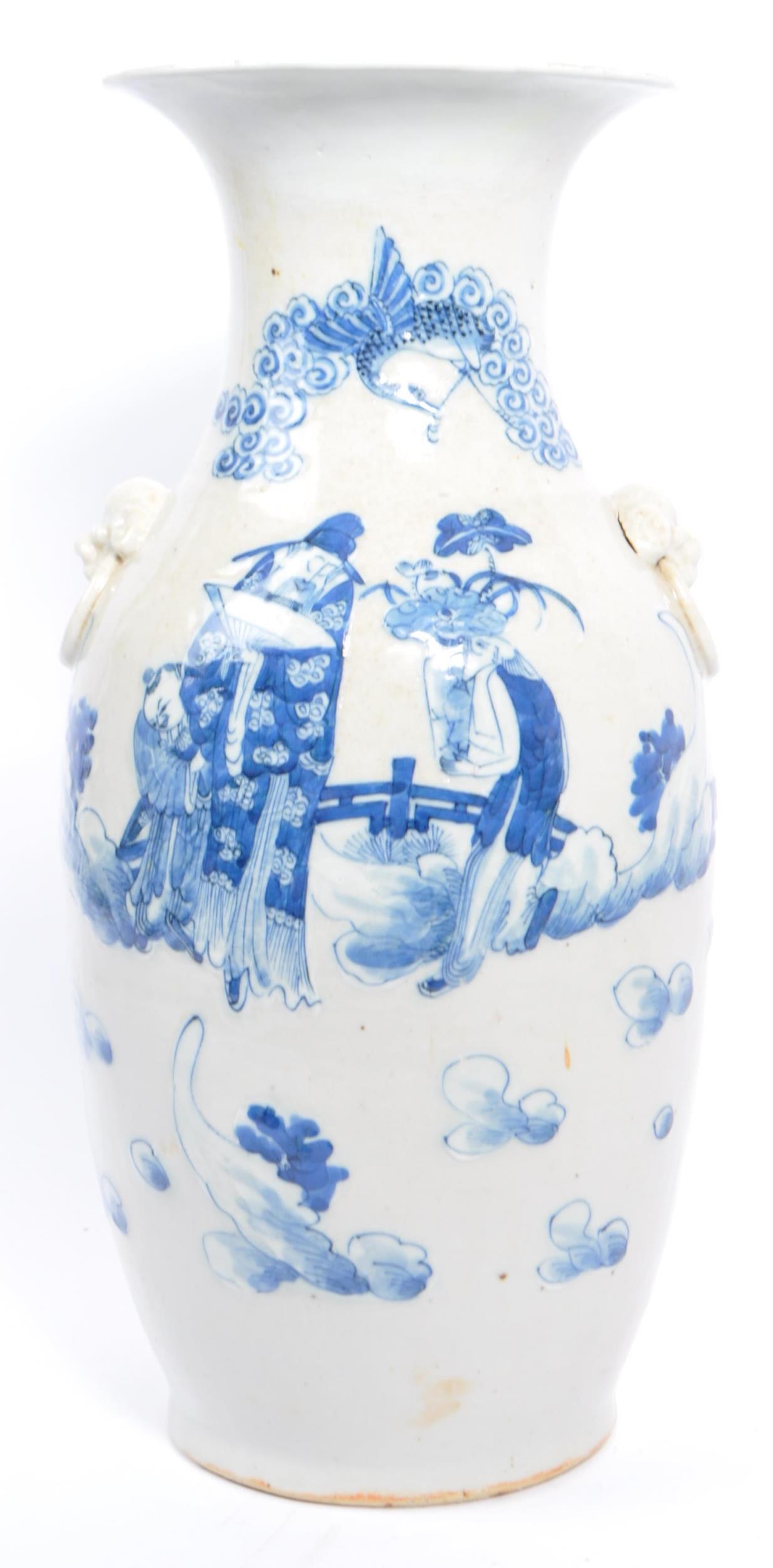 A 19th century Chinese hand painted blue and white porcelain cylindrical vase. The vase being hand painted with scenes of figures holding decorative vases amidst intricate foliates and raised static ceramic handles to sides. Marks to base. Measures 20cm tall.