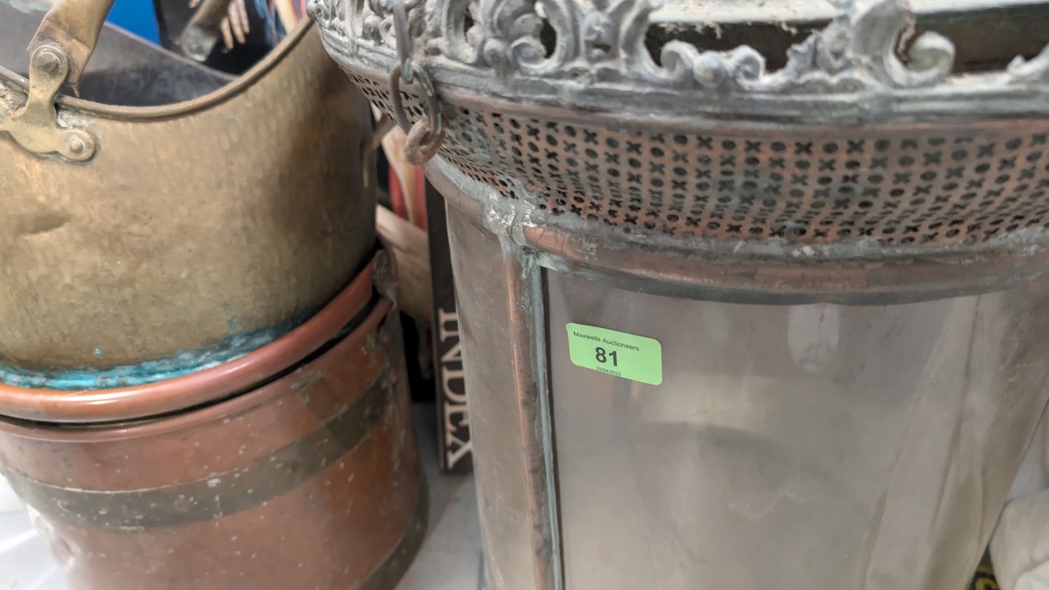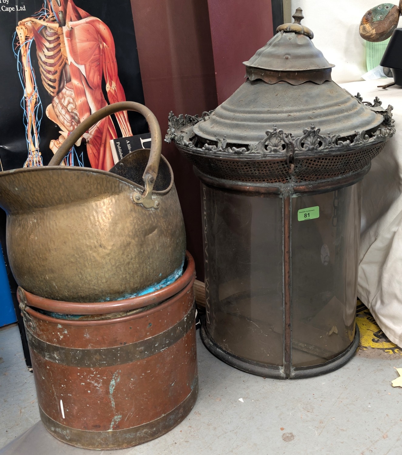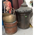 A large 19th century lantern with replacement plastic and a copper coal bucket, another.