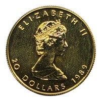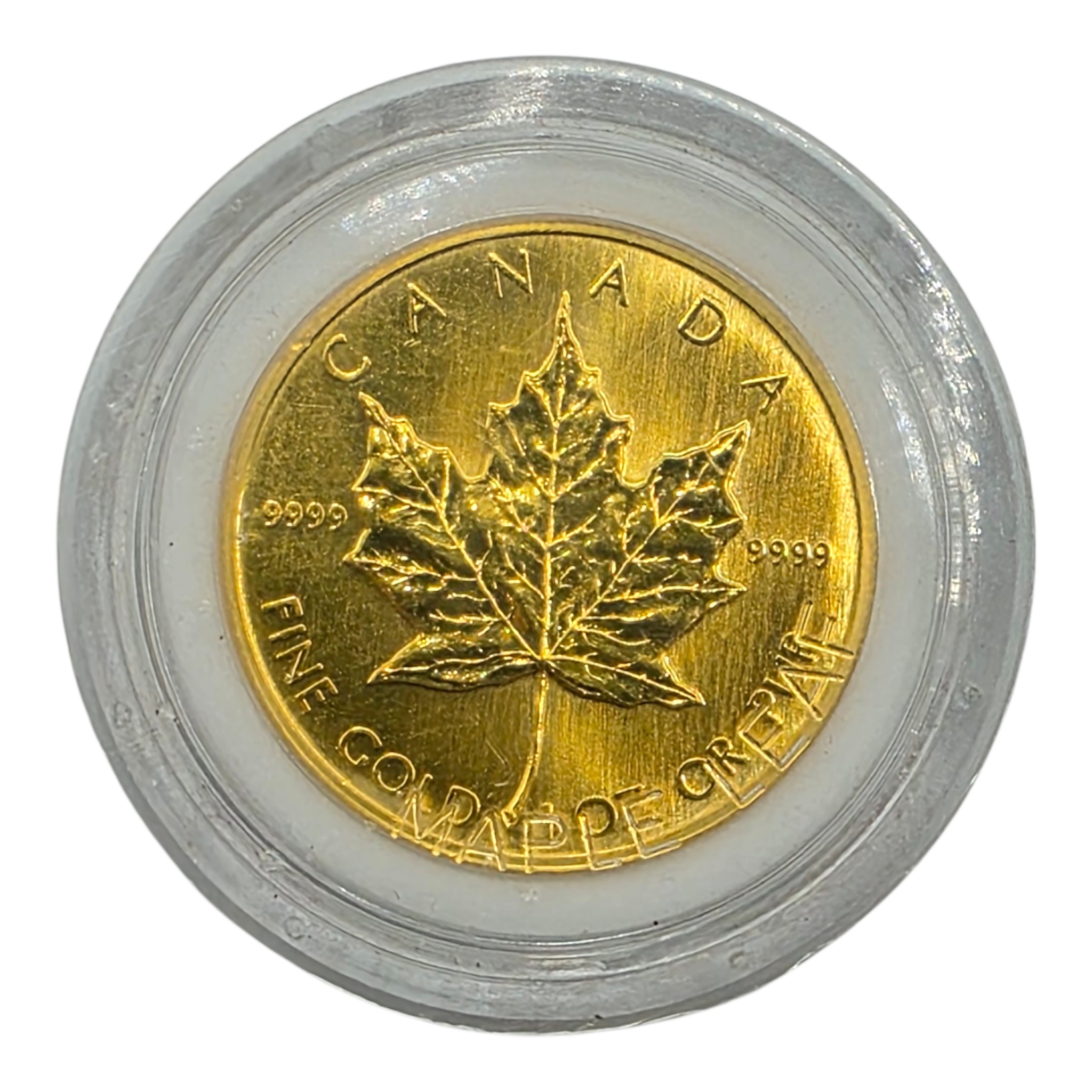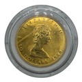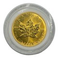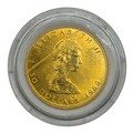 A Canadian Fine one ounce 999.99 24ct gold 50 dollar 1988 Elizabeth II maple leaf coin in Perspex case. 31.2g.