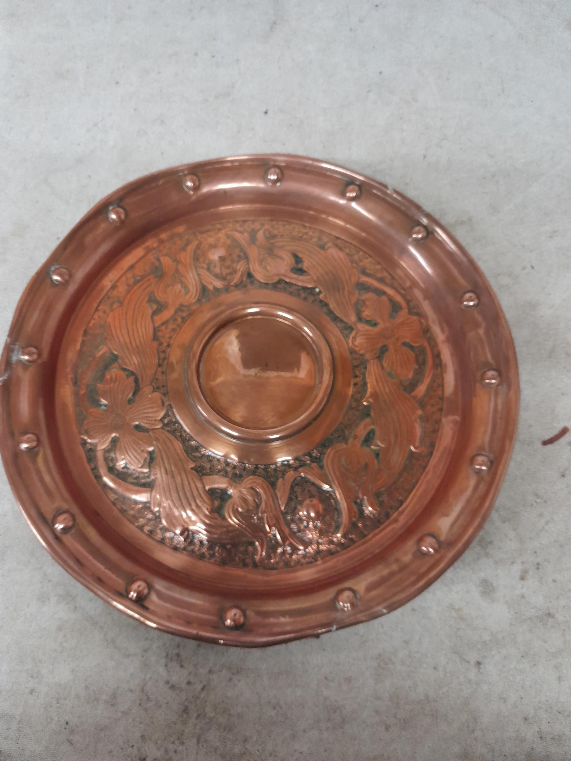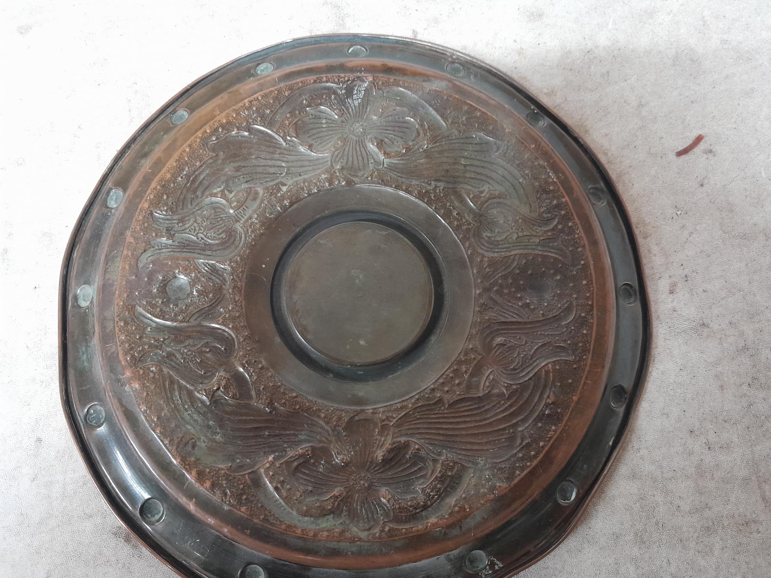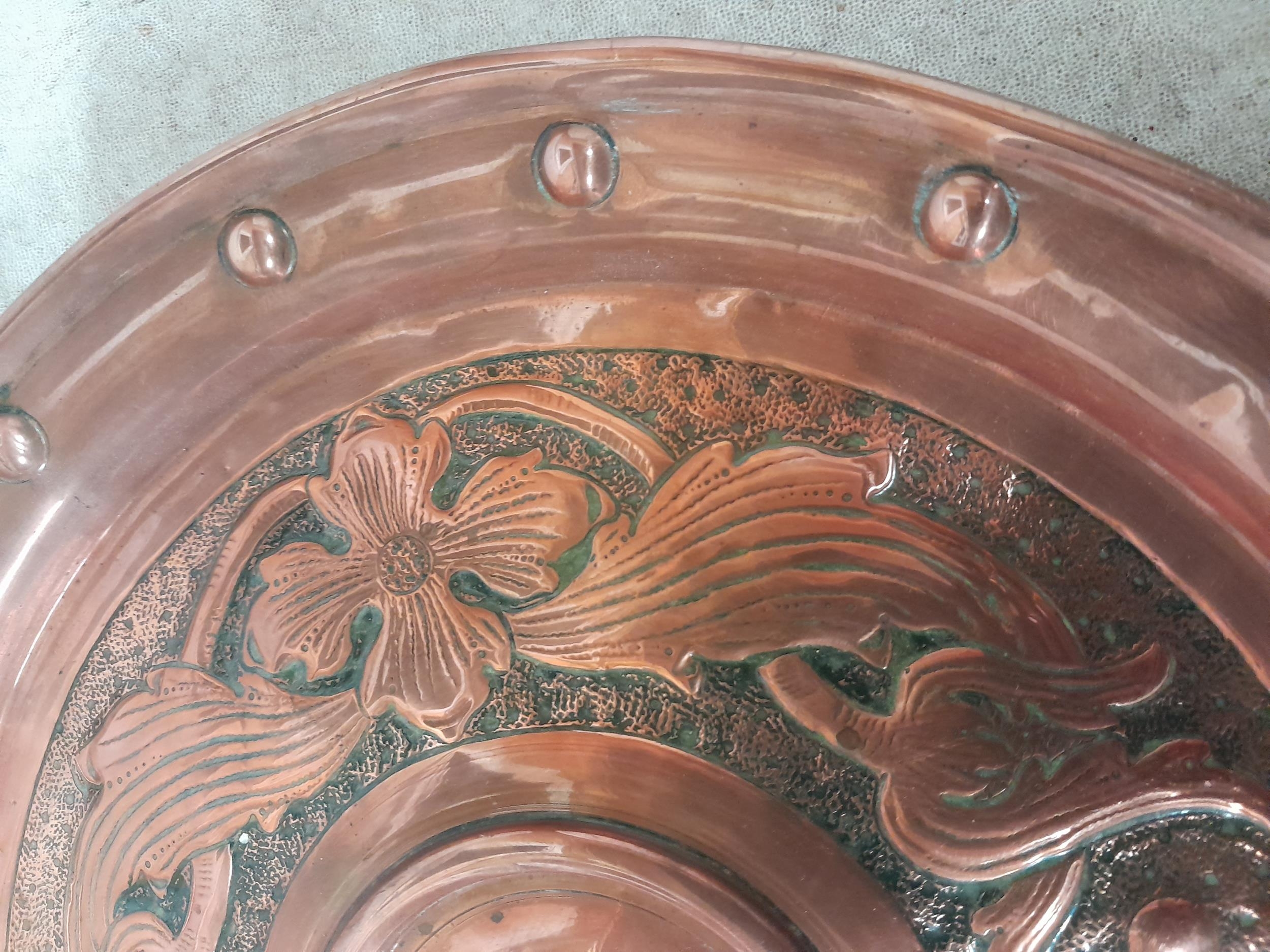 Arts and Crafts copper dish with floral repouse work in the style of Keswick School of Industrial Arts