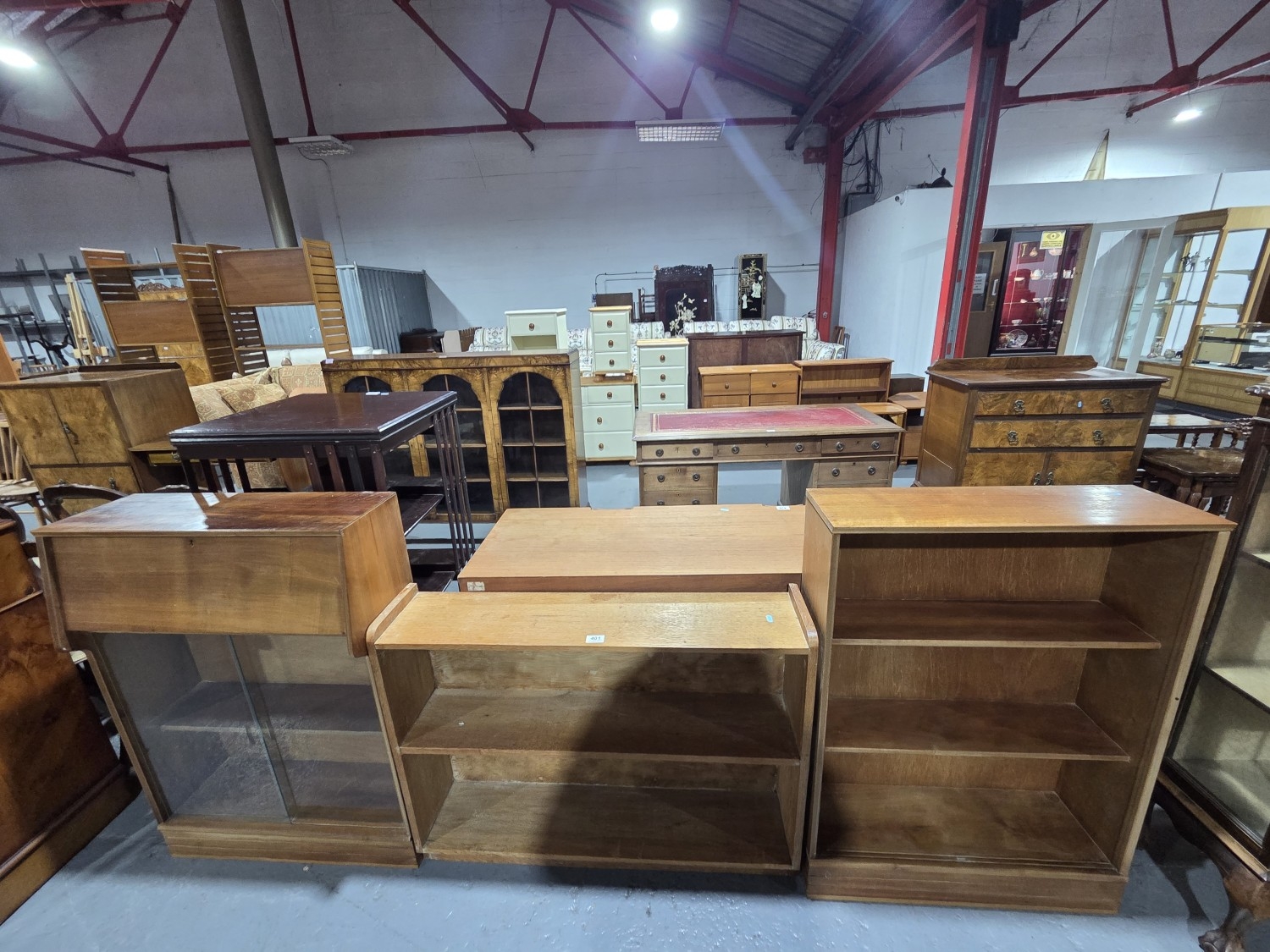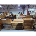 An oak bookcase together with a teak bookcase and one other bookcase