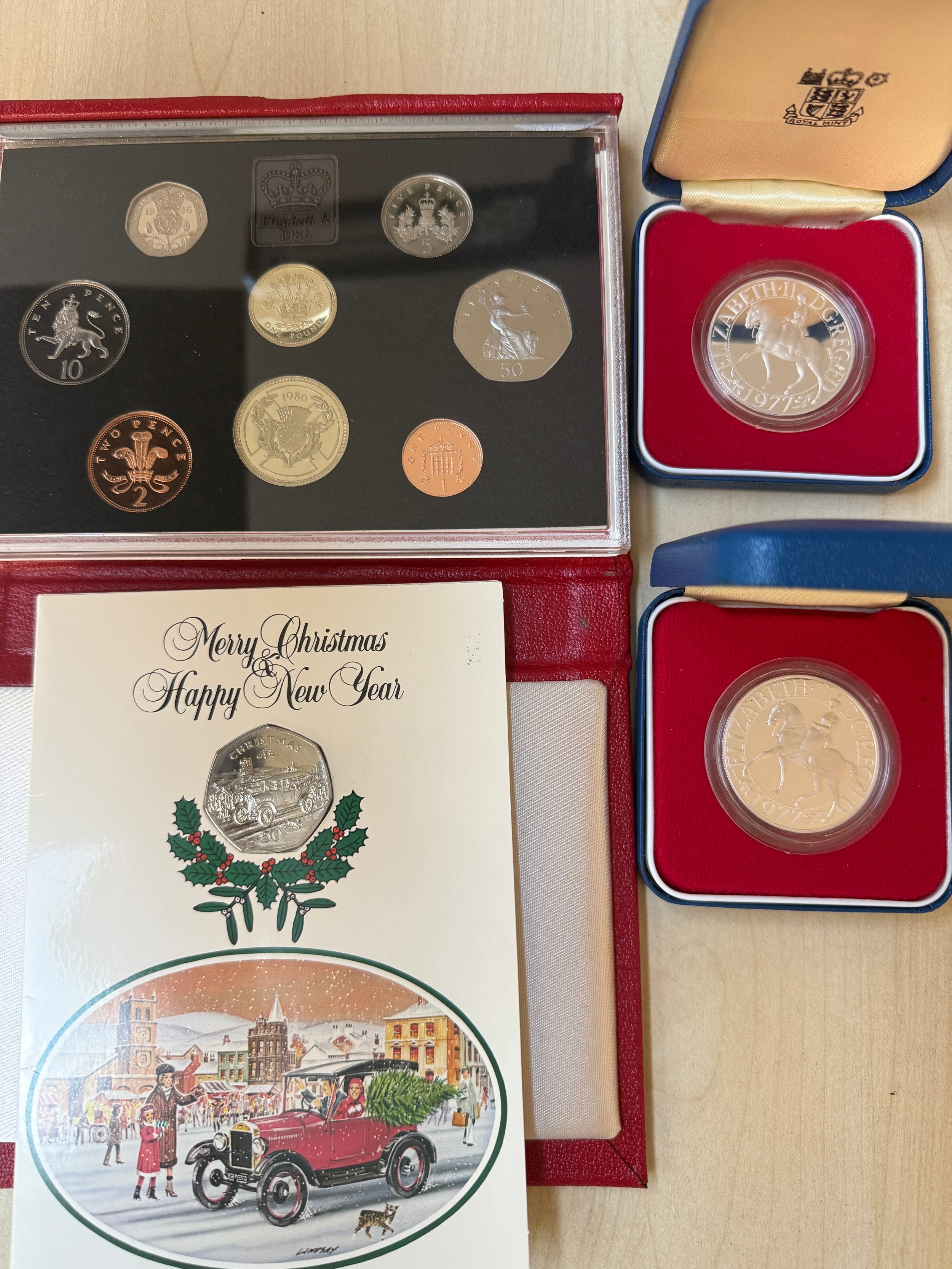 A small accumulation of mainly circulated UK 20th Century coins, plus x2 1977 boxed silver crowns, 1986 proof coin year set and Isle of Man 1983 Christmas 50p coin in folder, mixed condition