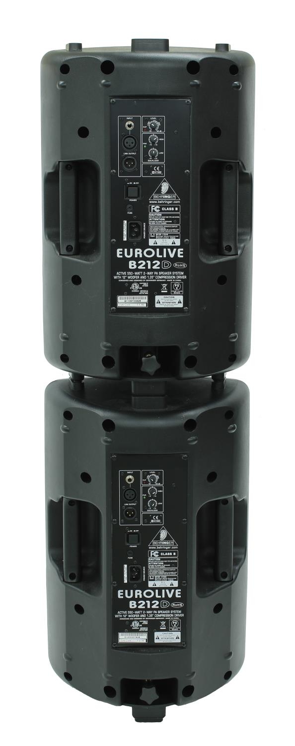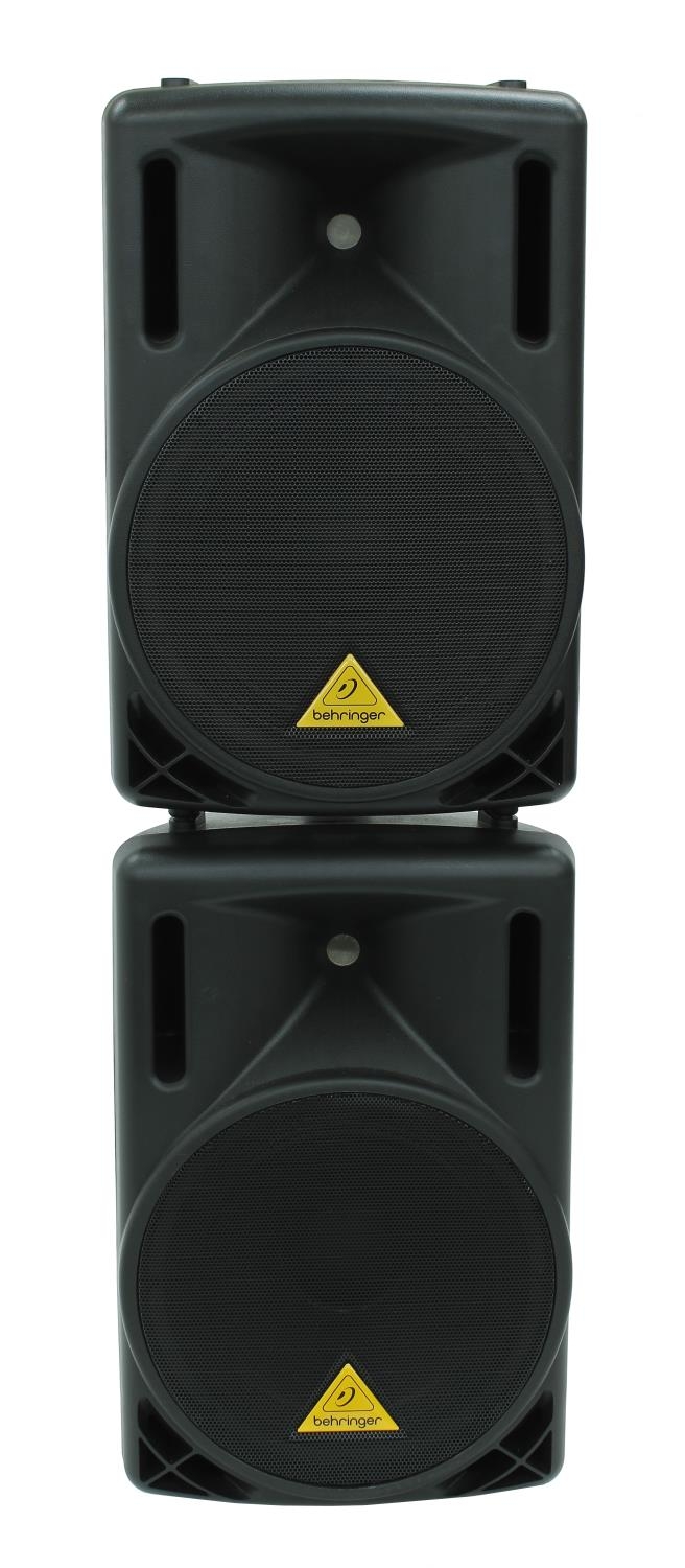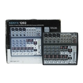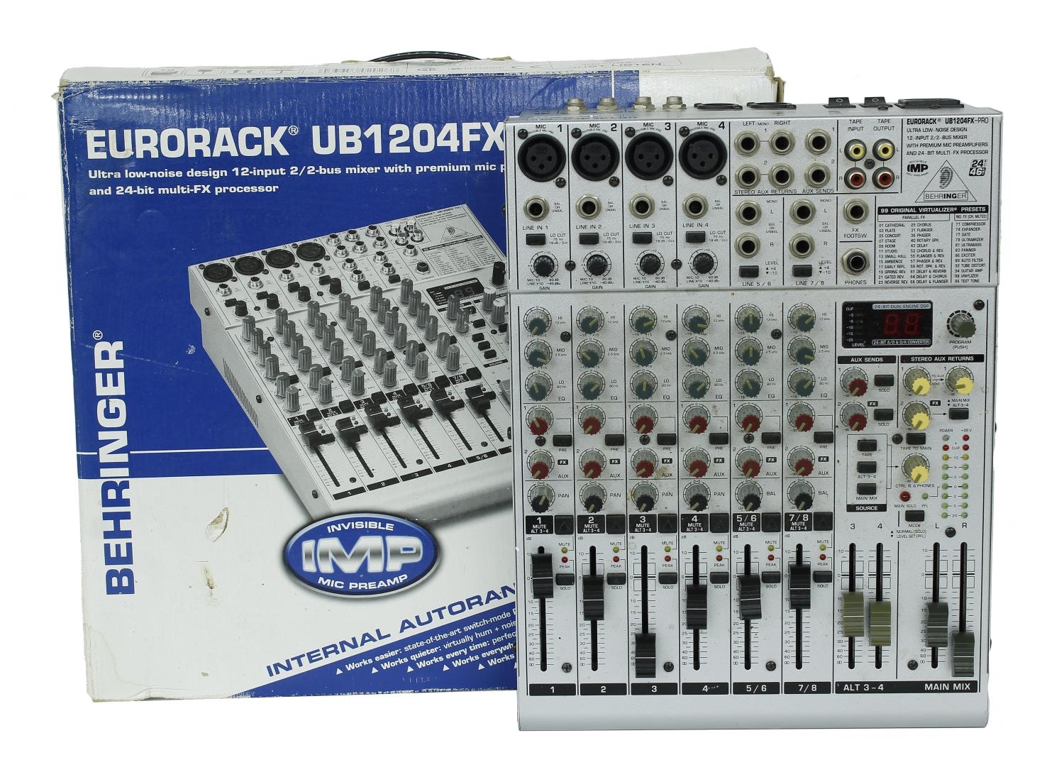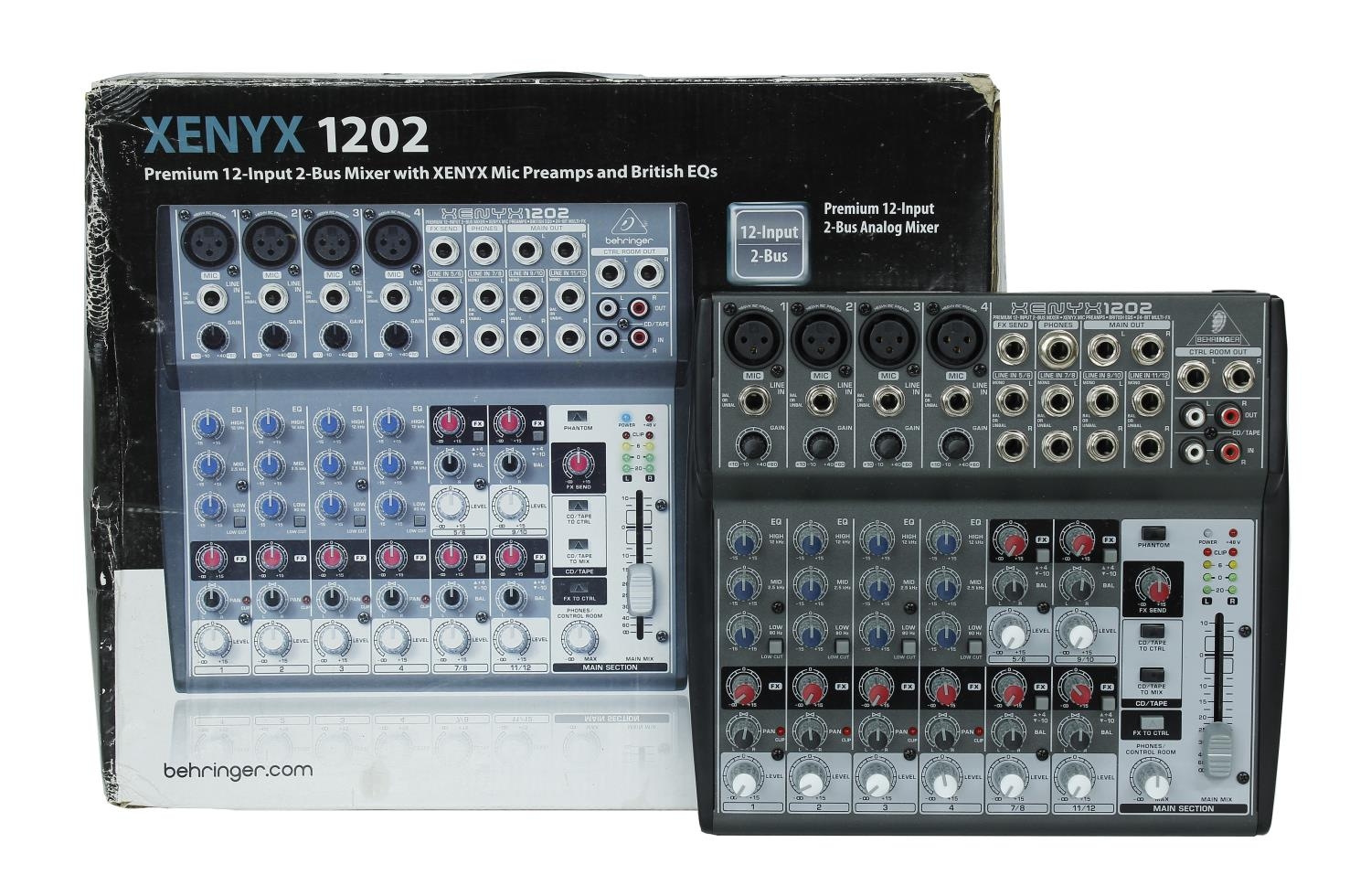 Pair of Behringer Eurolive B212D PA speakers, boxed; together with a Behringer Xenyx 1202 mixer and a Behringer Eurorack UB1204FX-Pro mixer