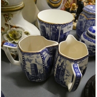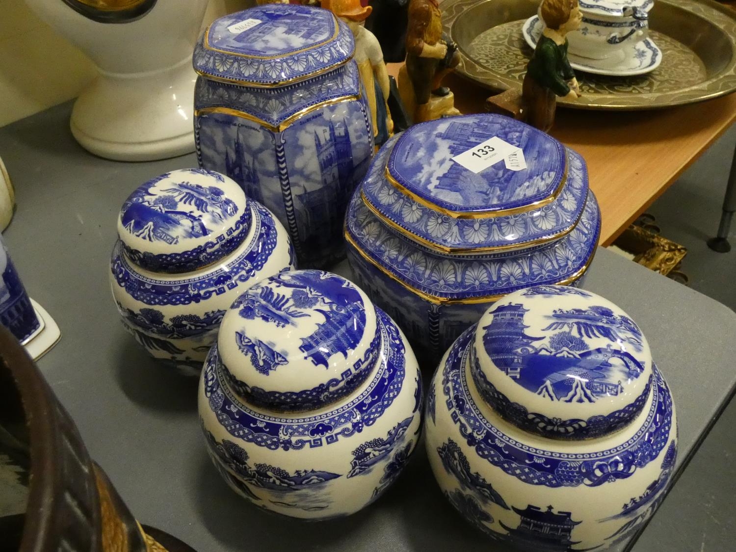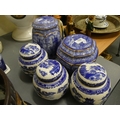 Blue and white Ringtons ginger jars and tea caddies.