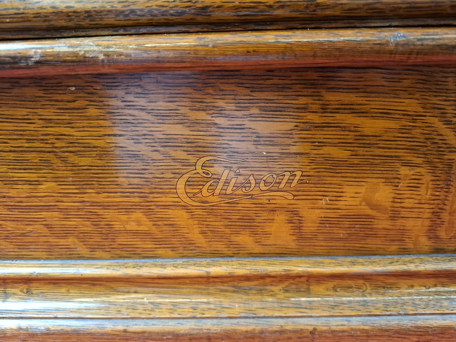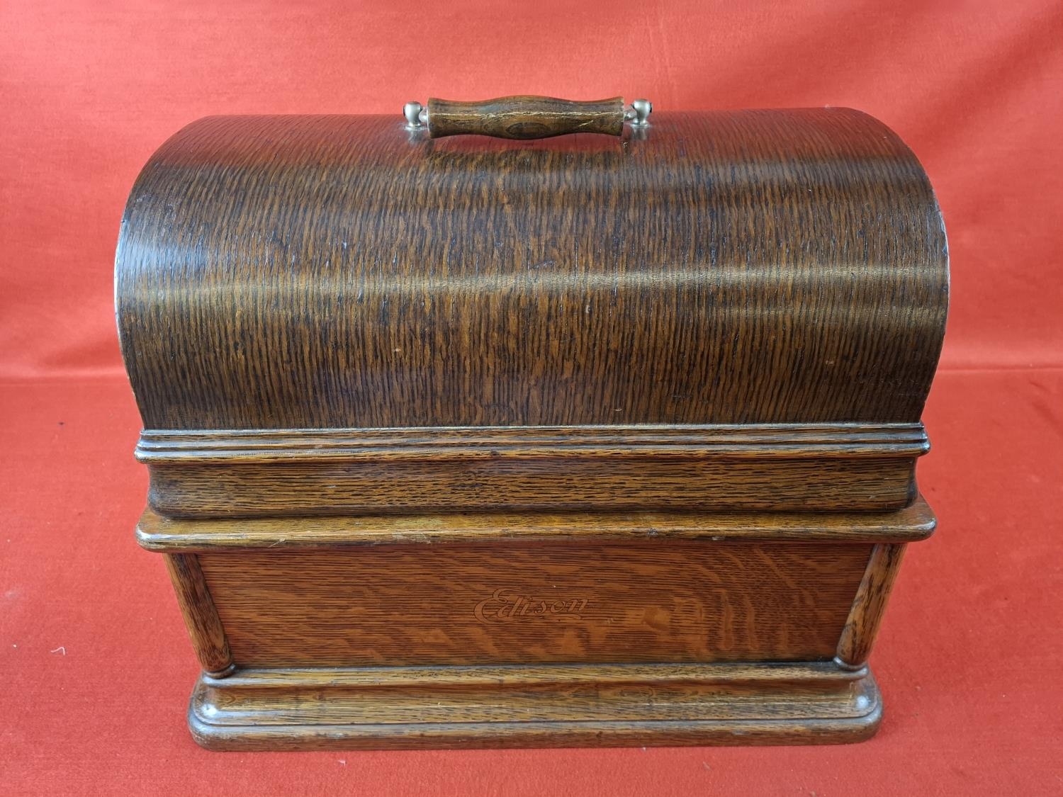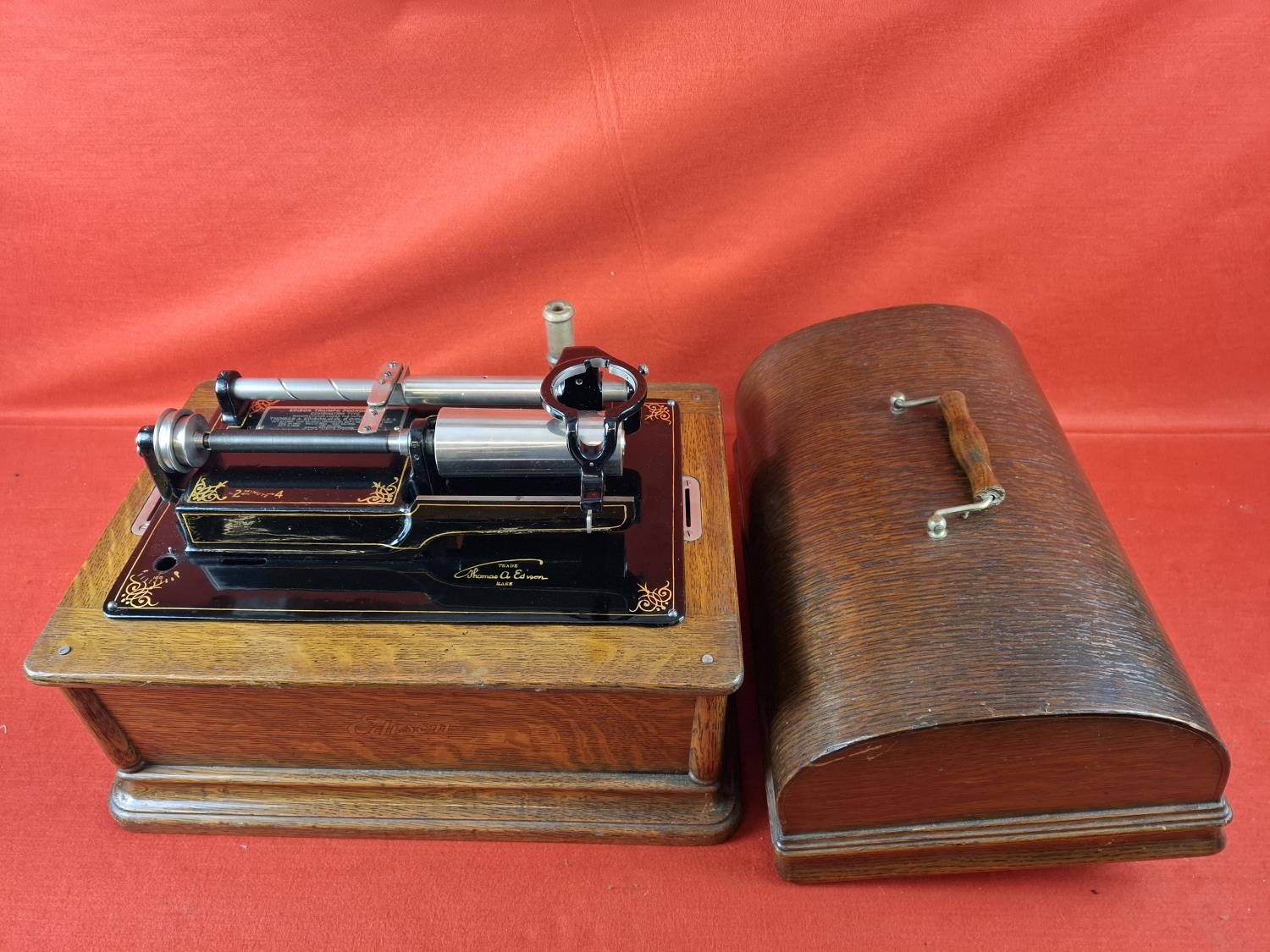 Thomas Edison Triumph model F No. 89974 phonograph. In oak case and original lid. Top section in very nice condition however movement is loose in case as pictured. Case itself in very nice condition also. Would be a great restoration project.