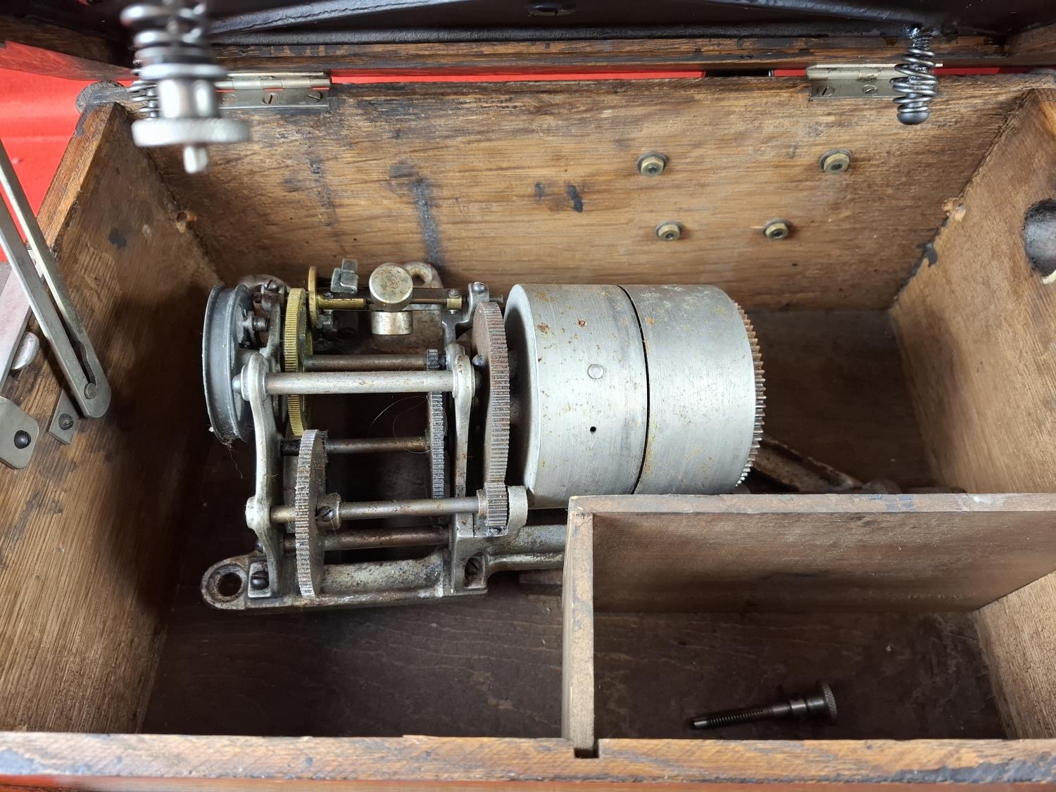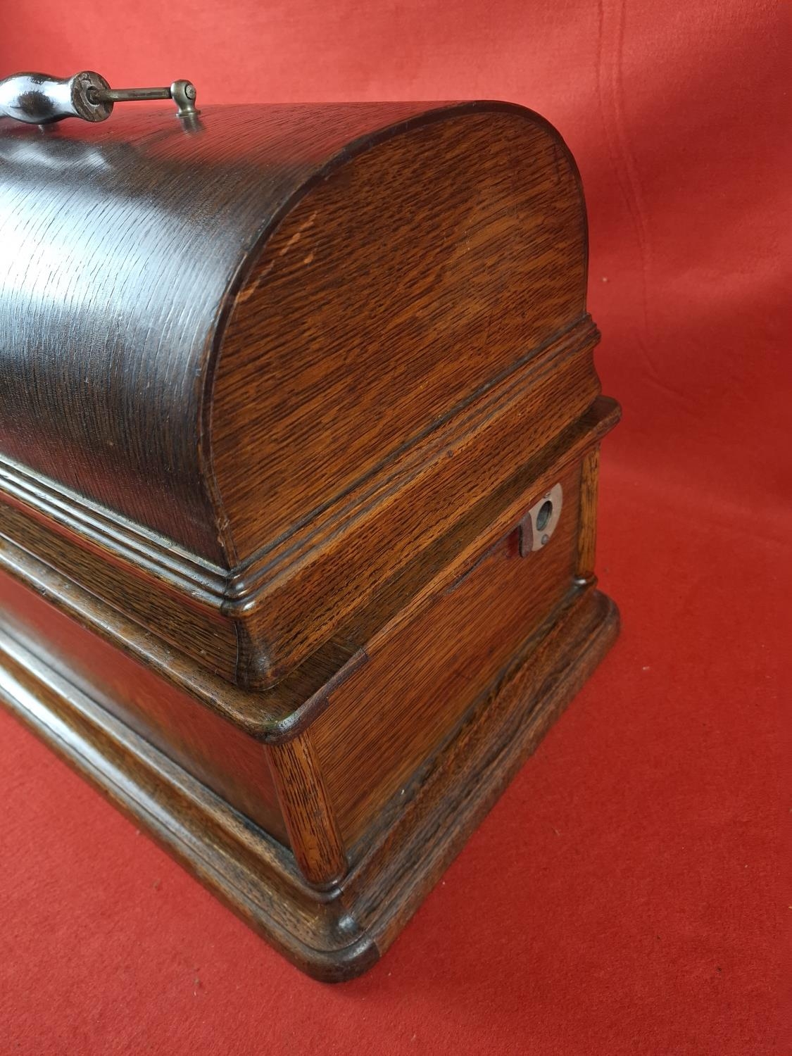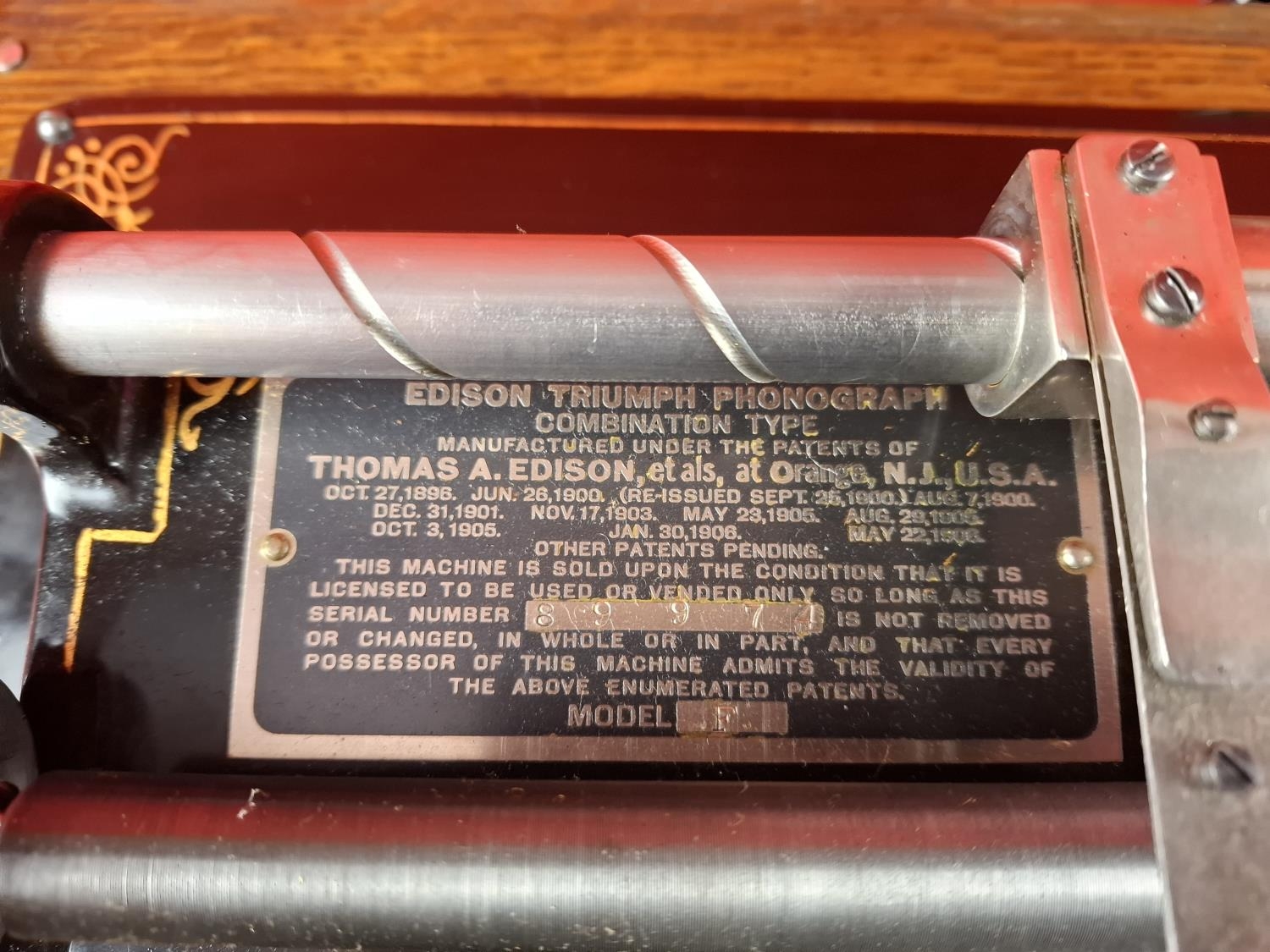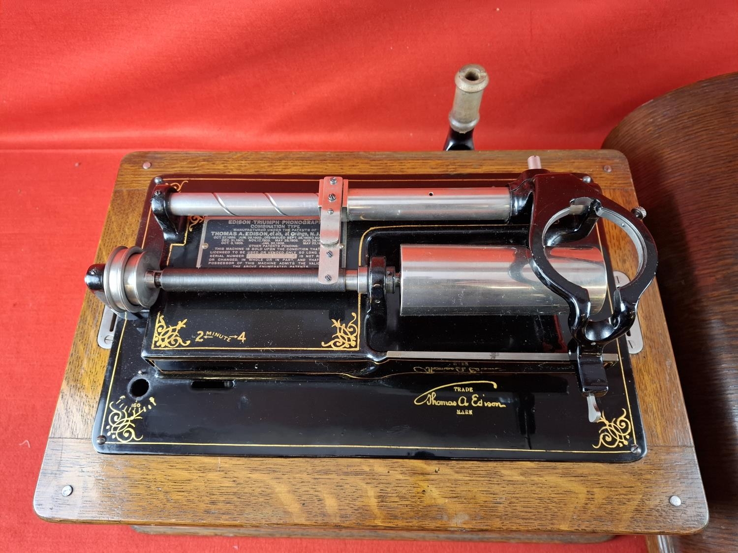 Thomas Edison Triumph model F No. 89974 phonograph. In oak case and original lid. Top section in very nice condition however movement is loose in case as pictured. Case itself in very nice condition also. Would be a great restoration project.