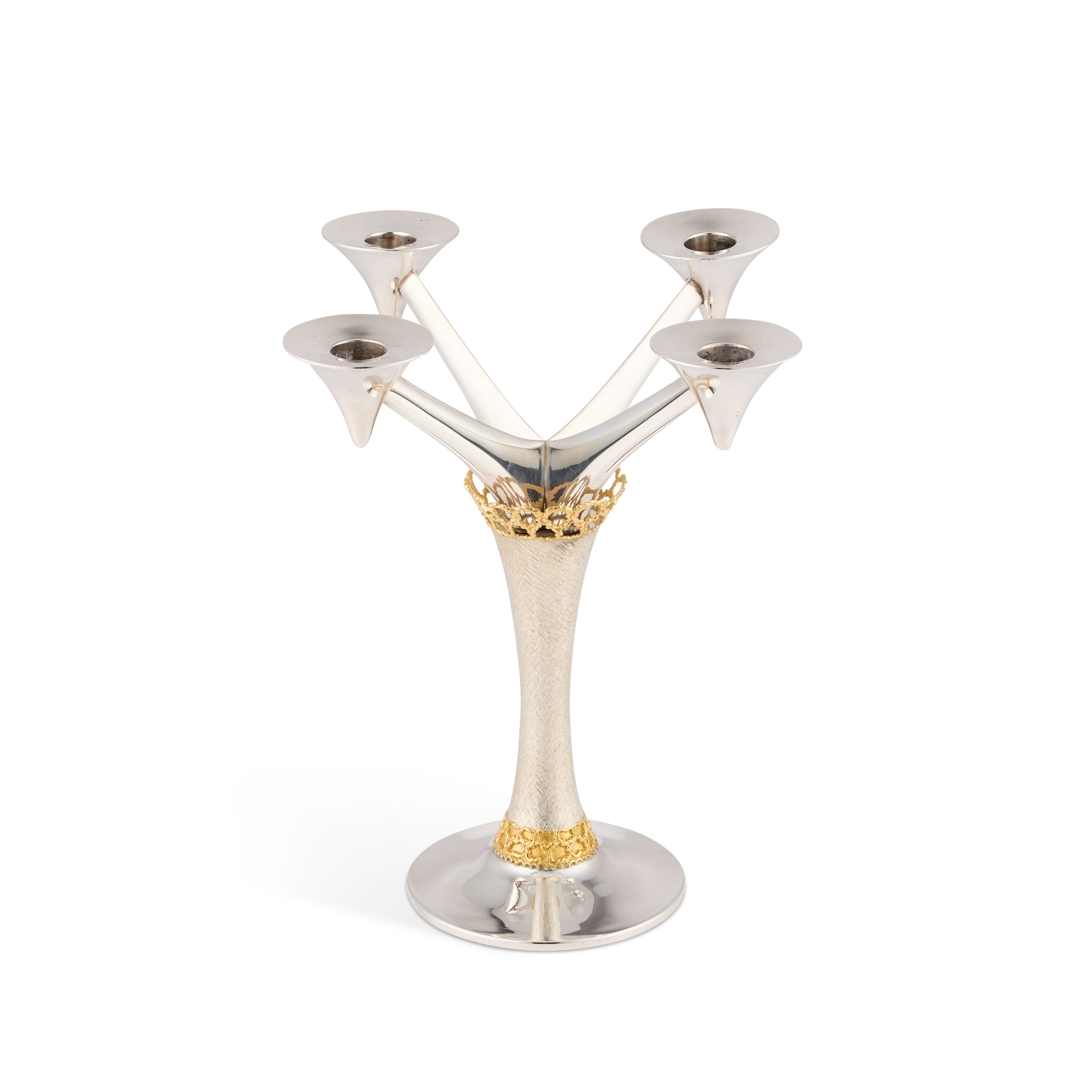 by Stuart Devlin, London 1975, with four lights, above a tapering textured cylindrical stem with gilded abstract details, on a plain spreading base. 24.8cm high, 17.7 troy ounces