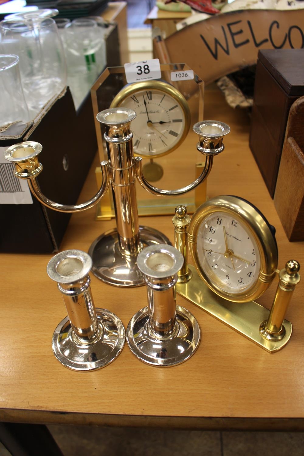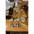 2X BRASS MANTLE CLOCKS & 3 CANDLE STICKS