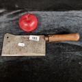 A vintage Darcourt brand meat cleaver with a cast steel blade and turned beech wood handles. Circa 1920. Length 31cm Signed to blade.