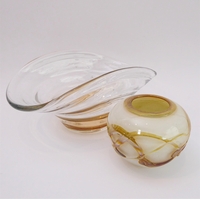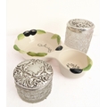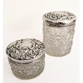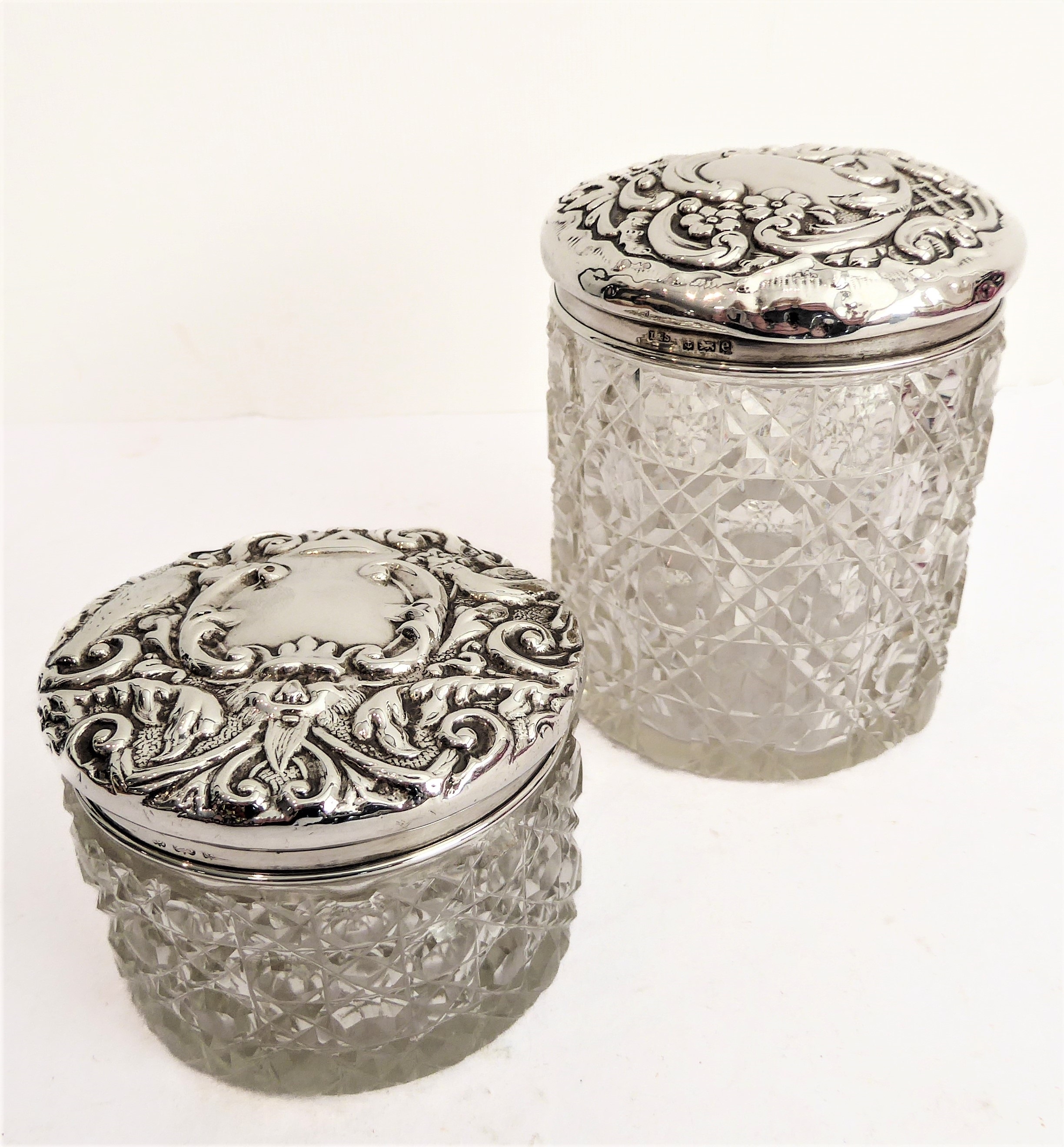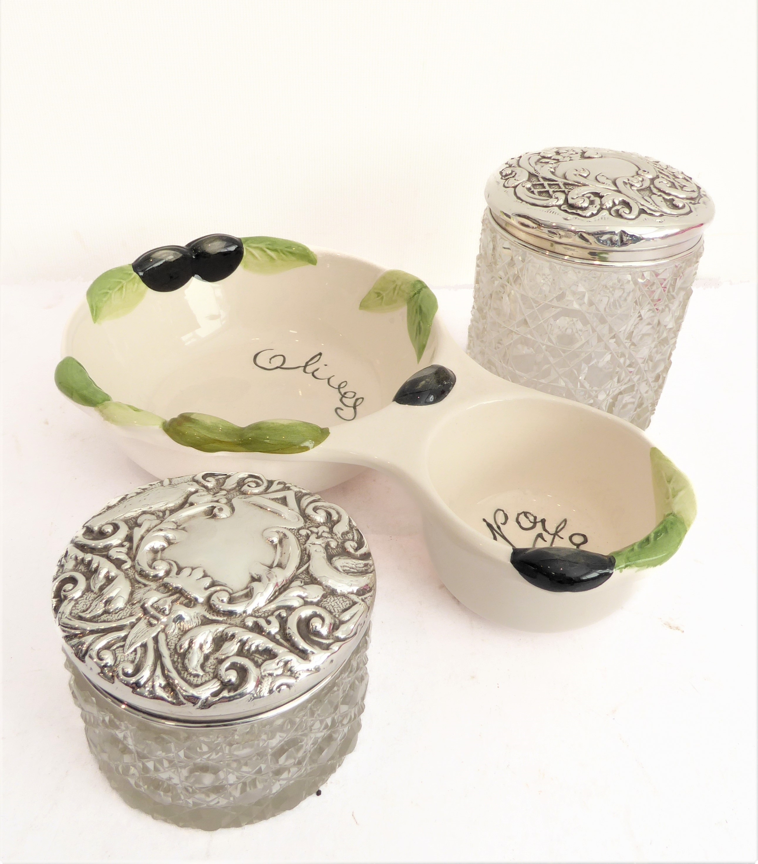 Two early 20th century cut-glass dressing-table jars: each with hallmarked silver lid decorated in repoussé style with C-scrolls and flowerheads, and each with central vacant cartouche. Also to include a two-division ceramic olive bowl decorated in high relief with olives and leaves. (3)