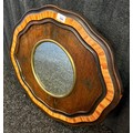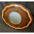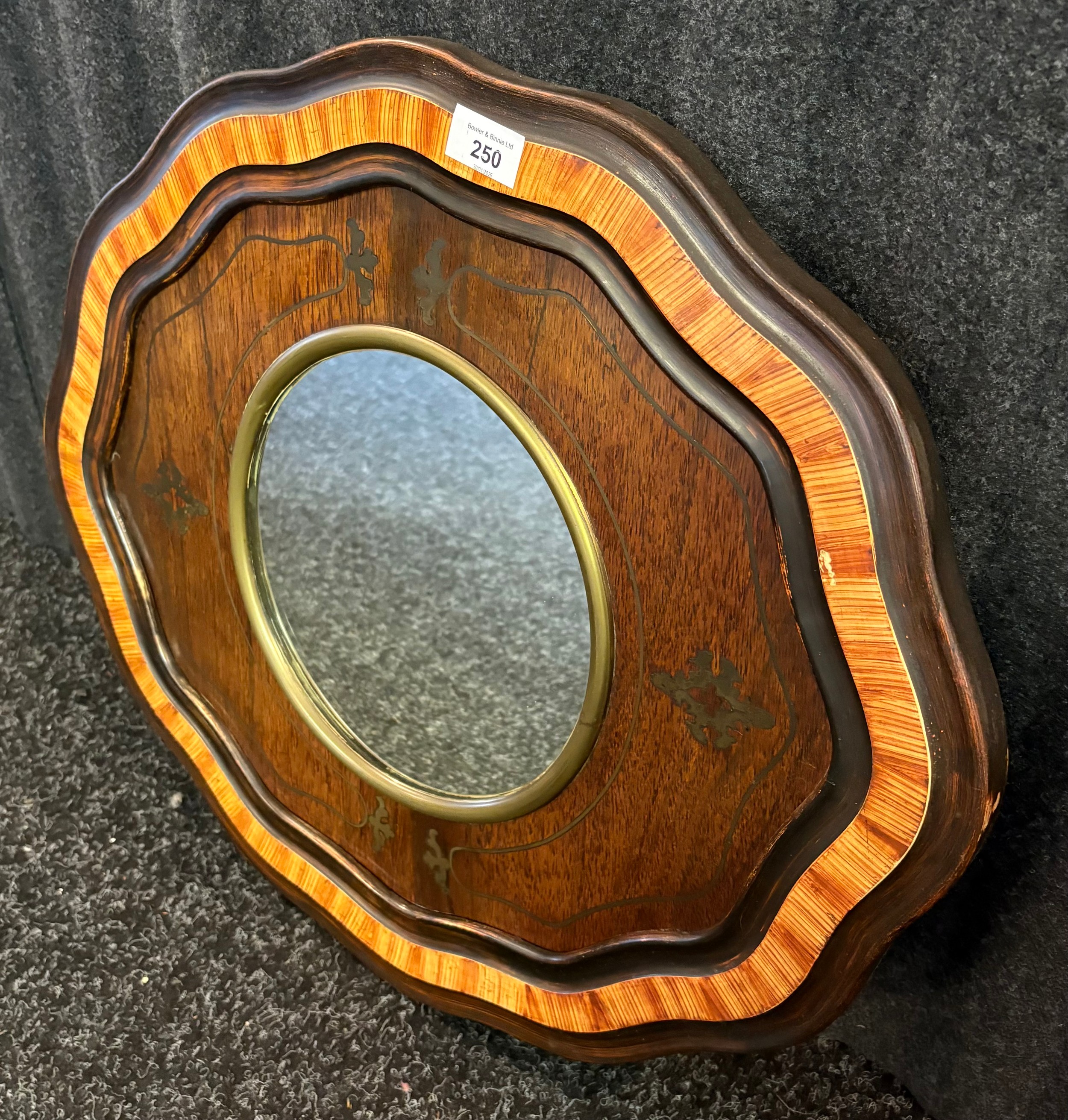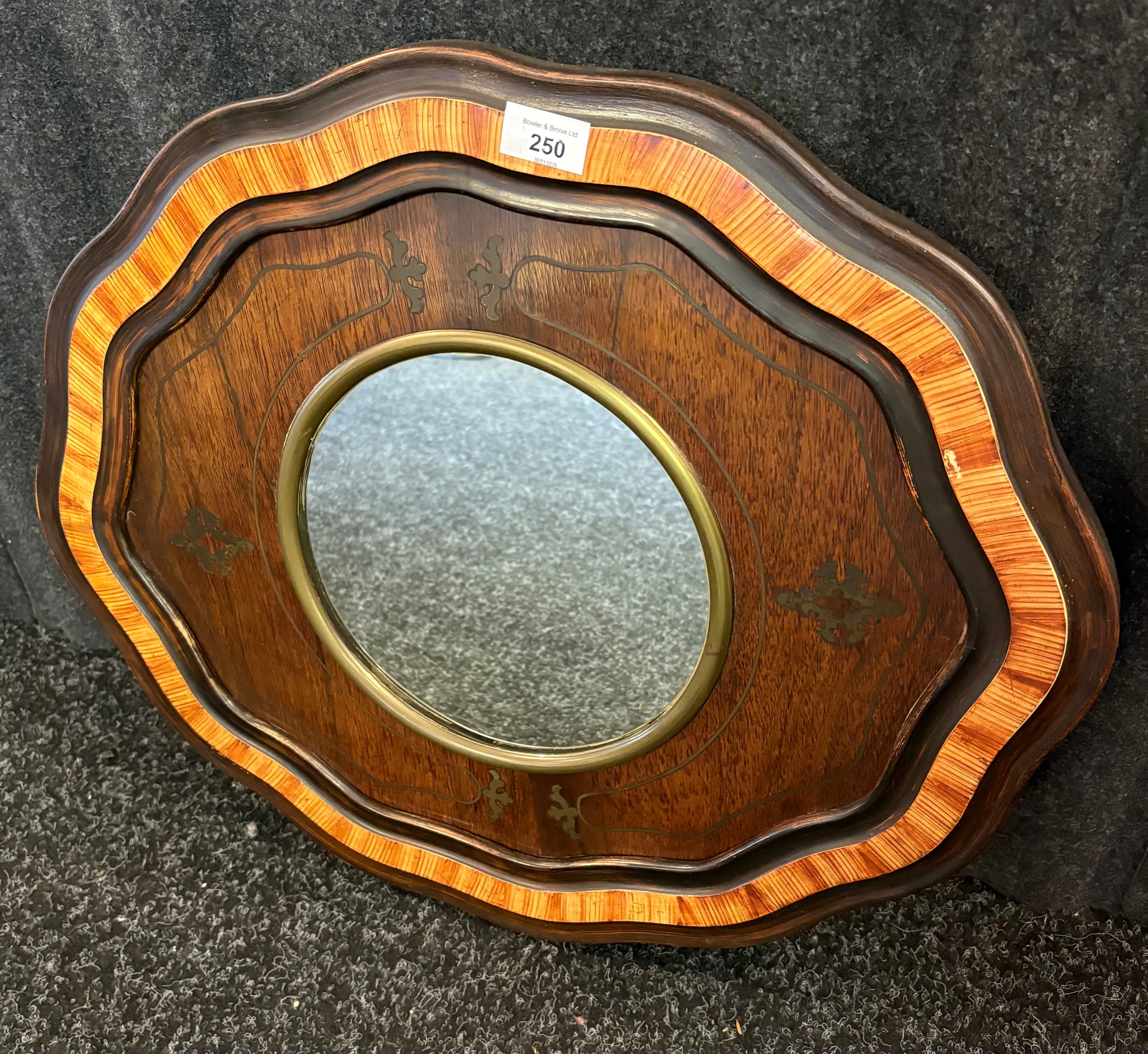 A reproduction mirror, the circular centre within a shaped frame with inlay metal design. [60 x 51cm]