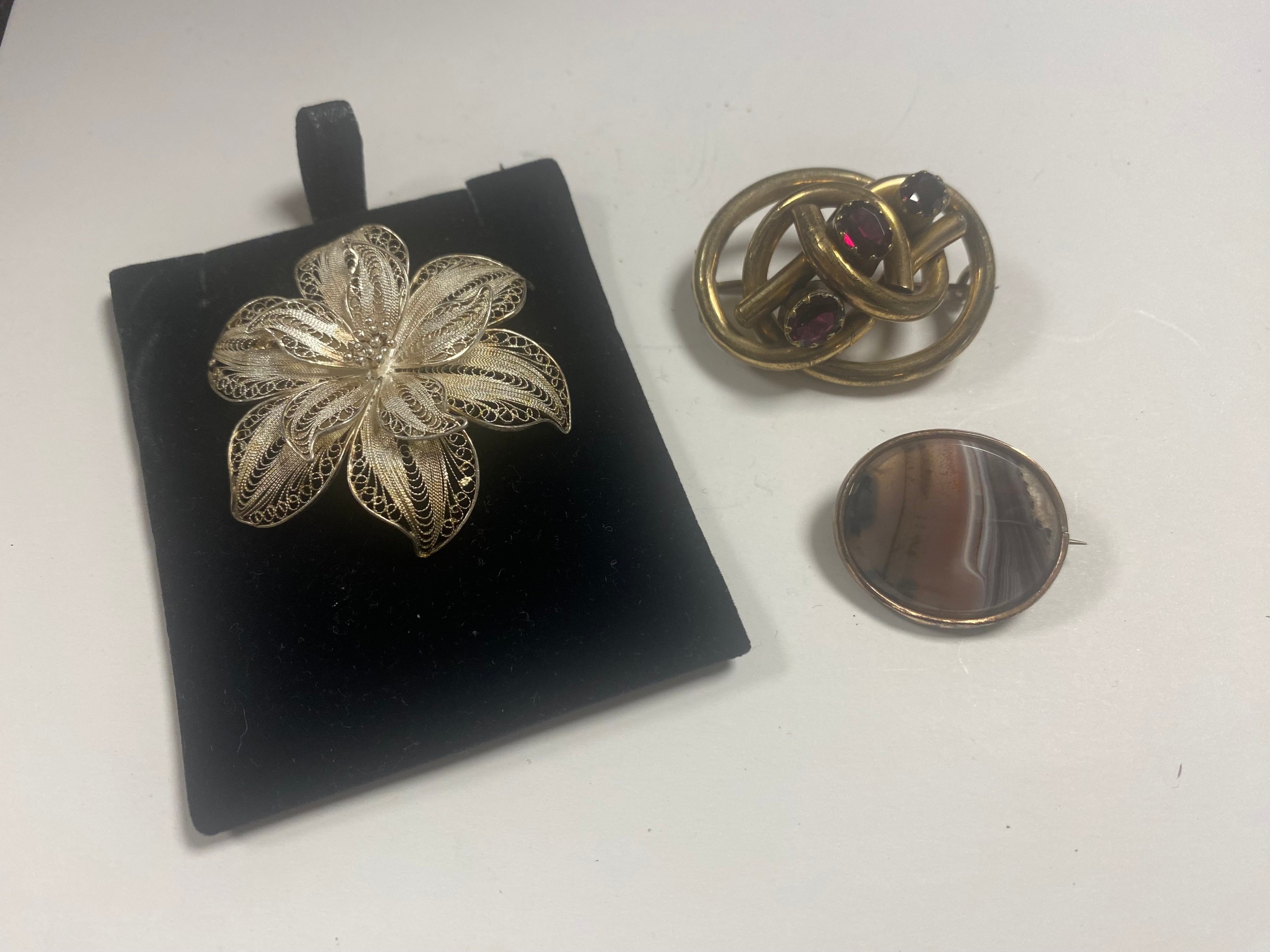 A 19th century garnet set knotwork brooch, together with an agate brooch and a silver filigree flowerhead brooch -