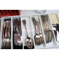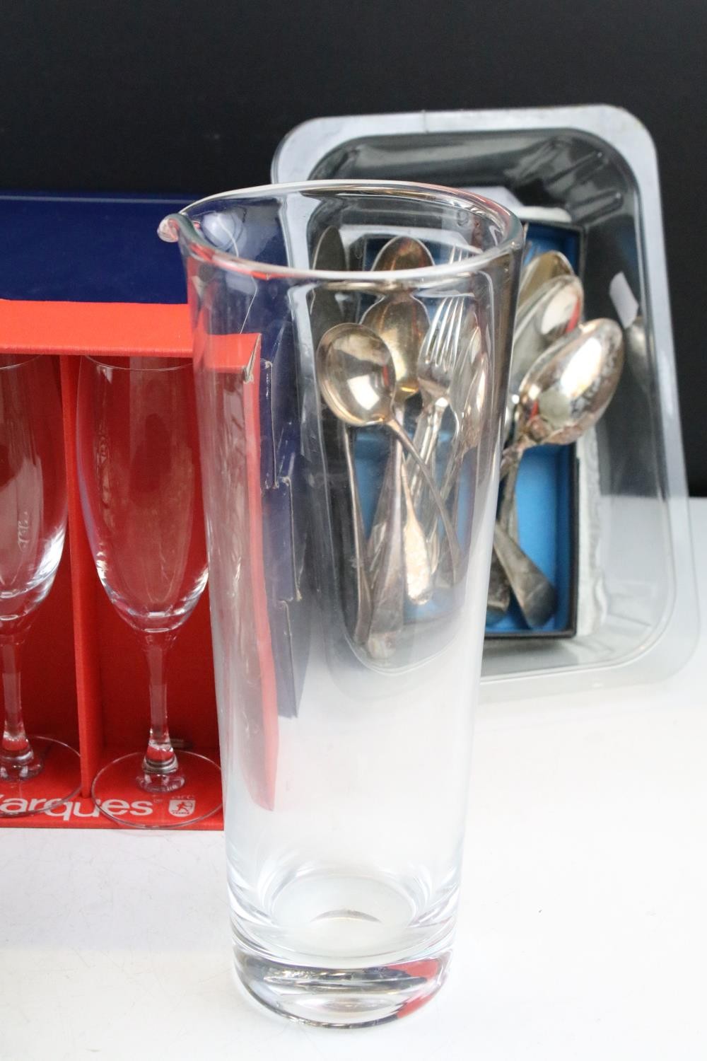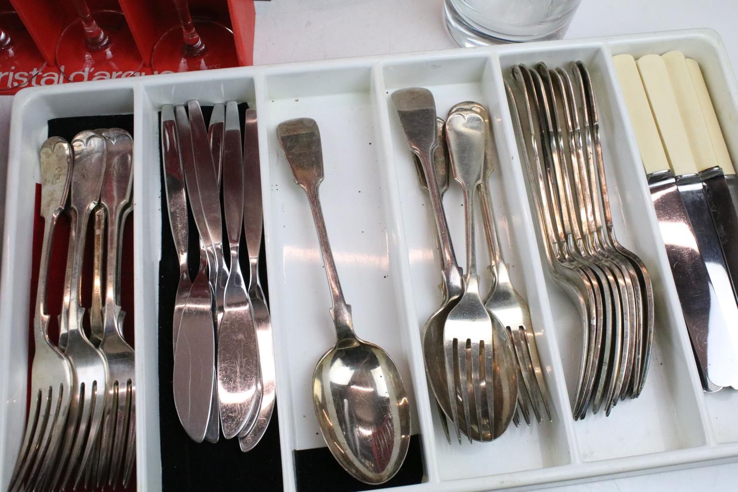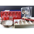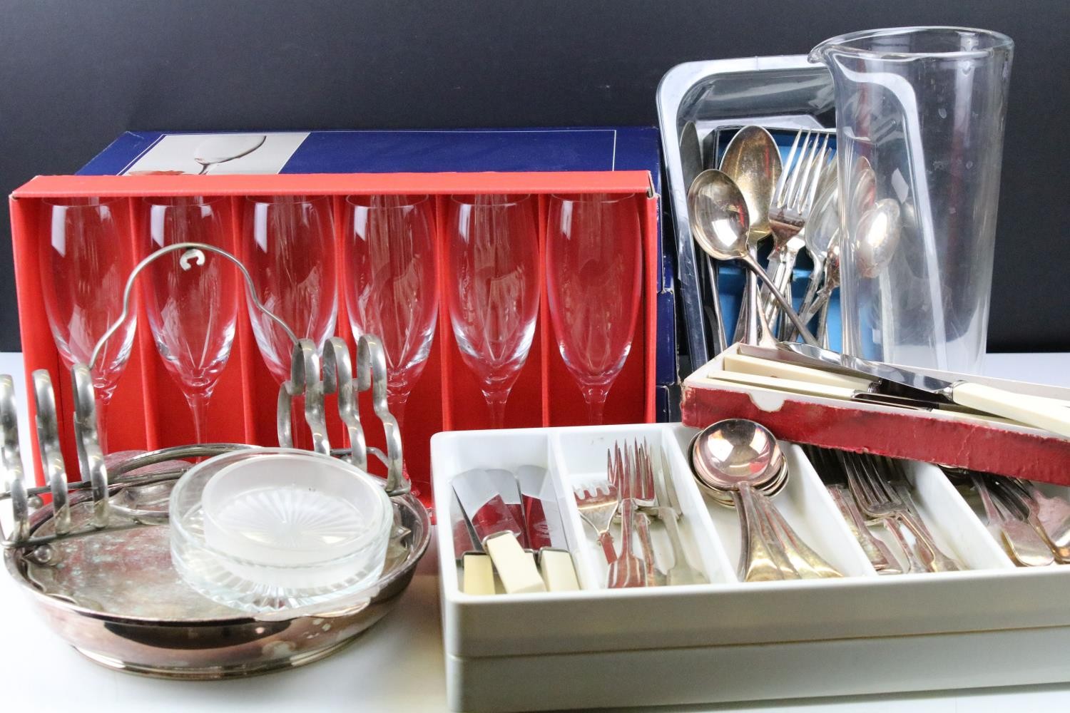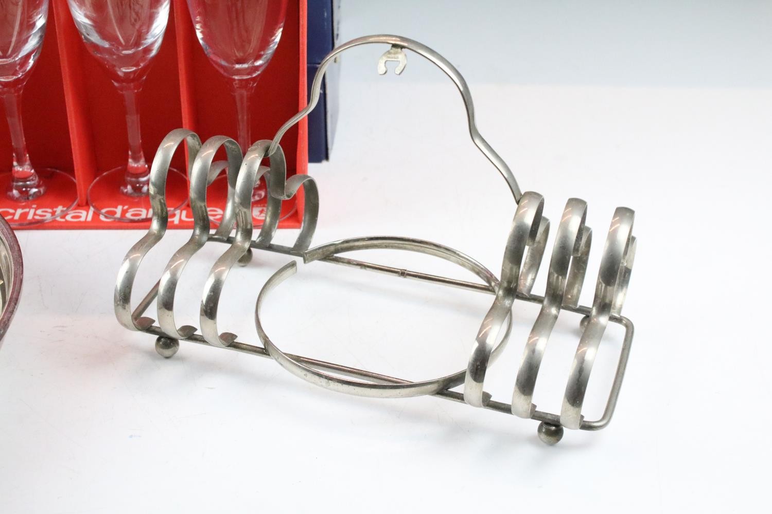 Collection of silver plate to include assorted 19th Century flat ware, toast rack, twin handled dish together with cristal d'arques boxed champage flutes.