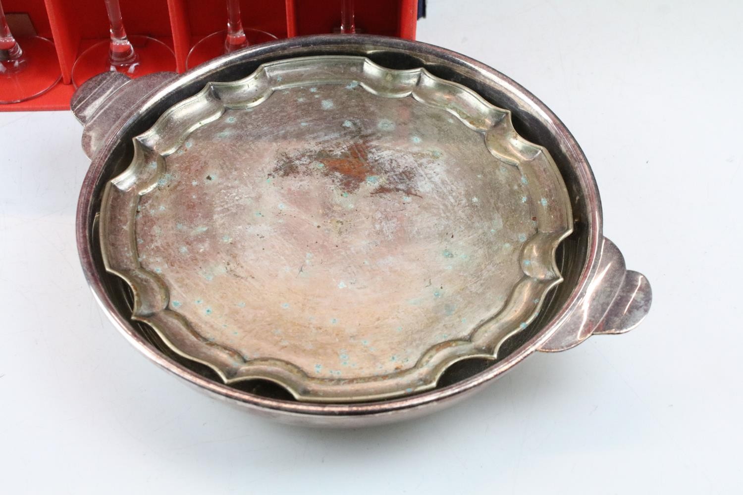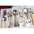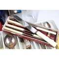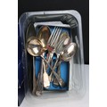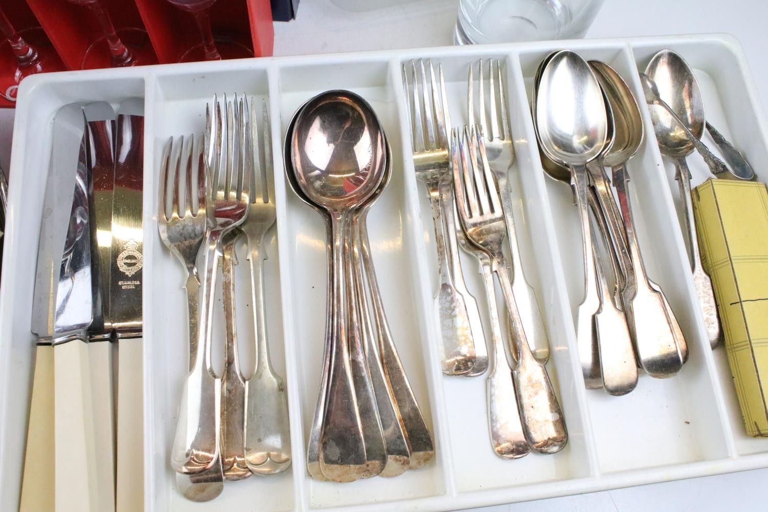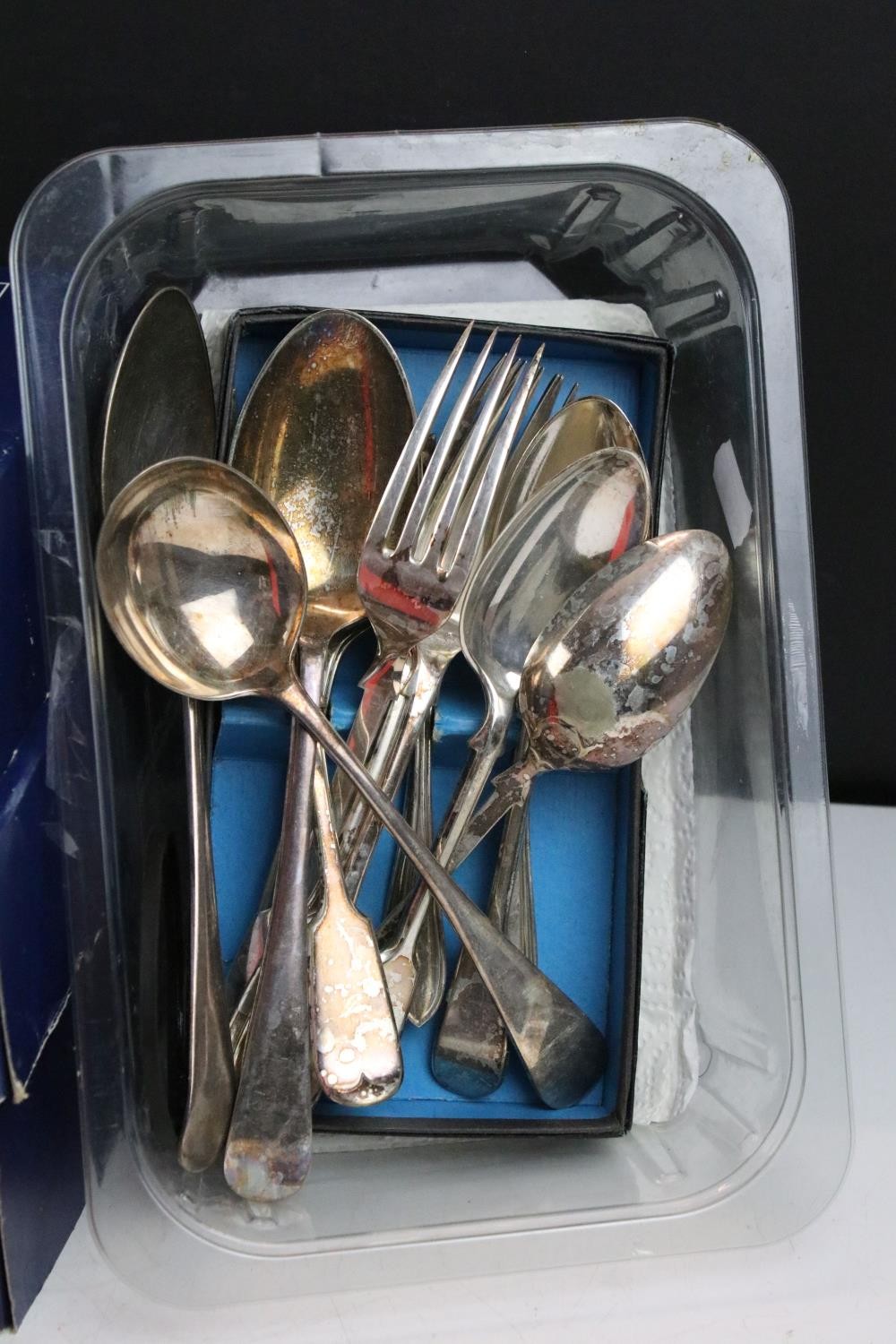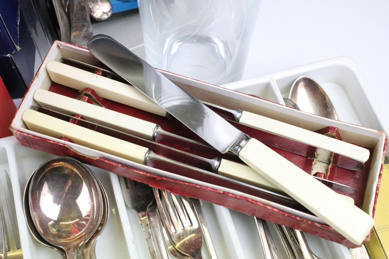 Collection of silver plate to include assorted 19th Century flat ware, toast rack, twin handled dish together with cristal d'arques boxed champage flutes.