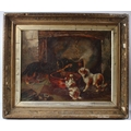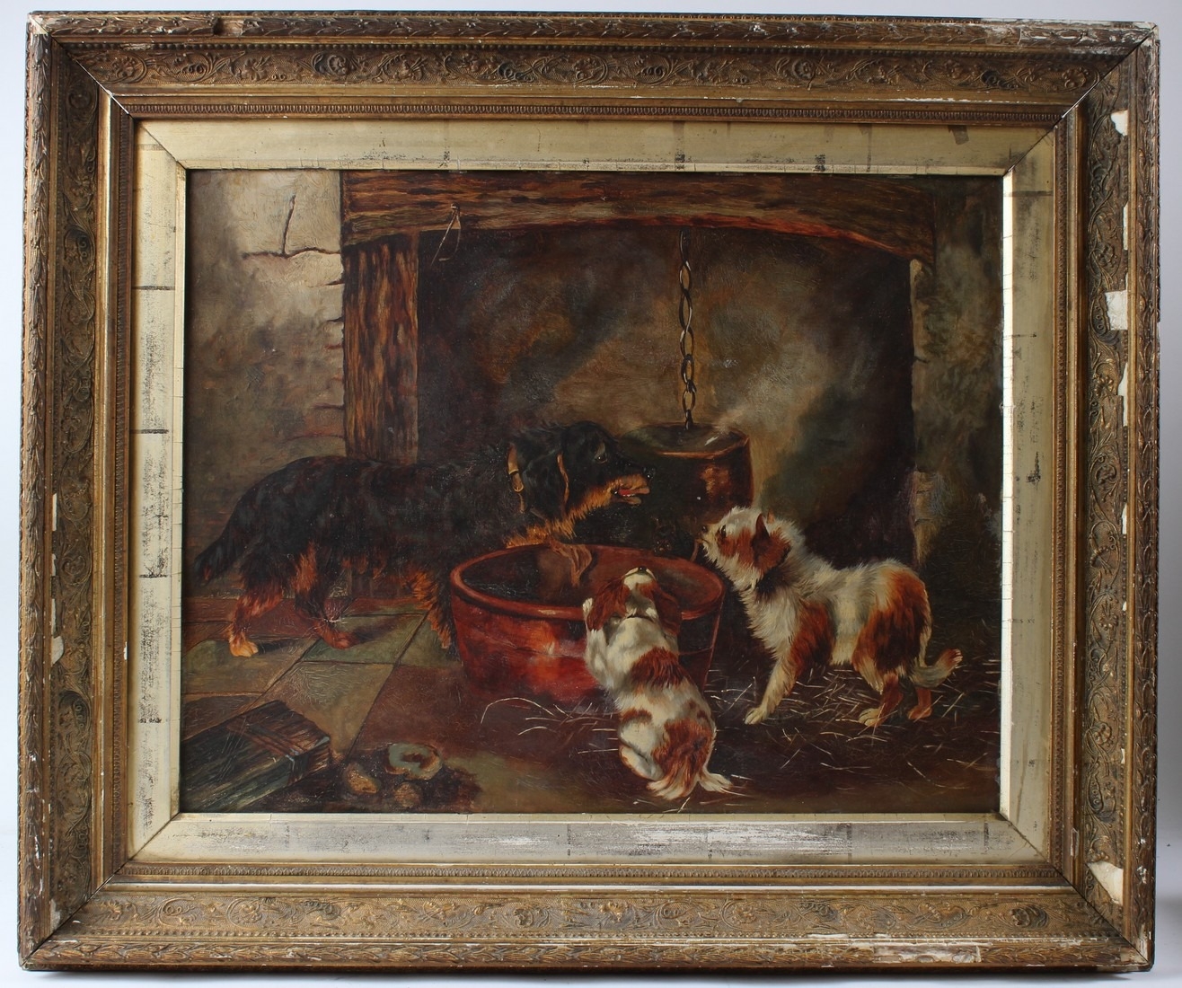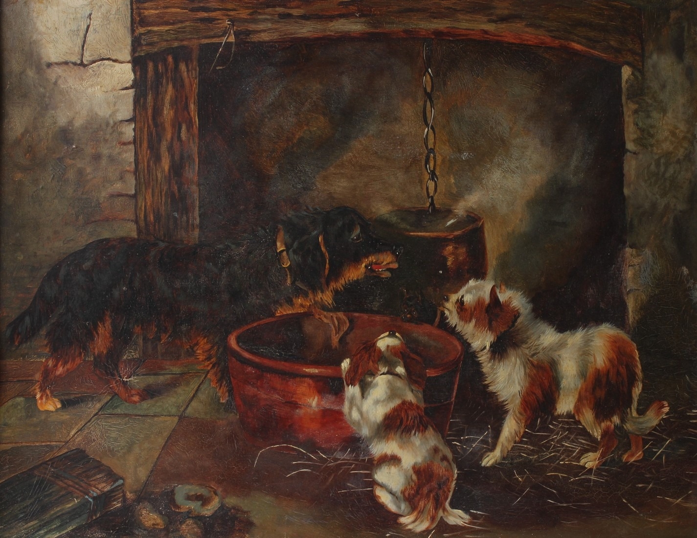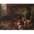 CIRCLE OF GEORGE ARMFIELD Four dogs by a fireside bran tub oil on board 43 x 54cm