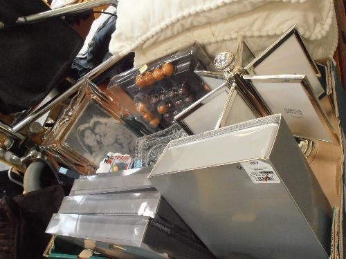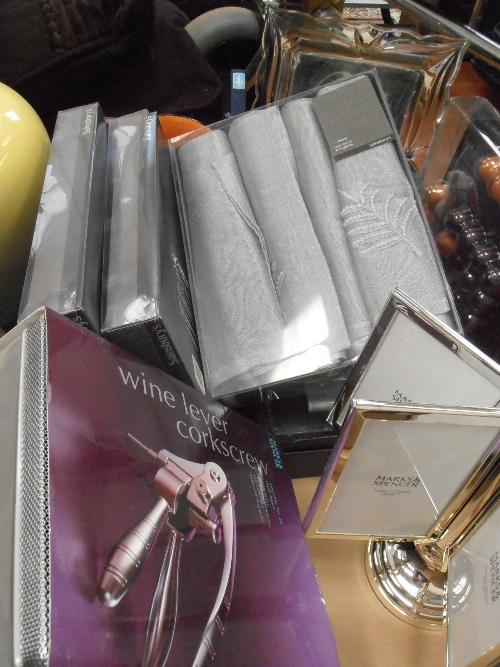 MIXED LOT OF UNUSED ITEMS INCLUDING PHOTO FRAMES, EMBROIDERED NAPKINS, PEN POT AND CARD HOLDER, CORKSCREW ETC.,