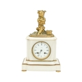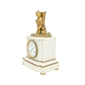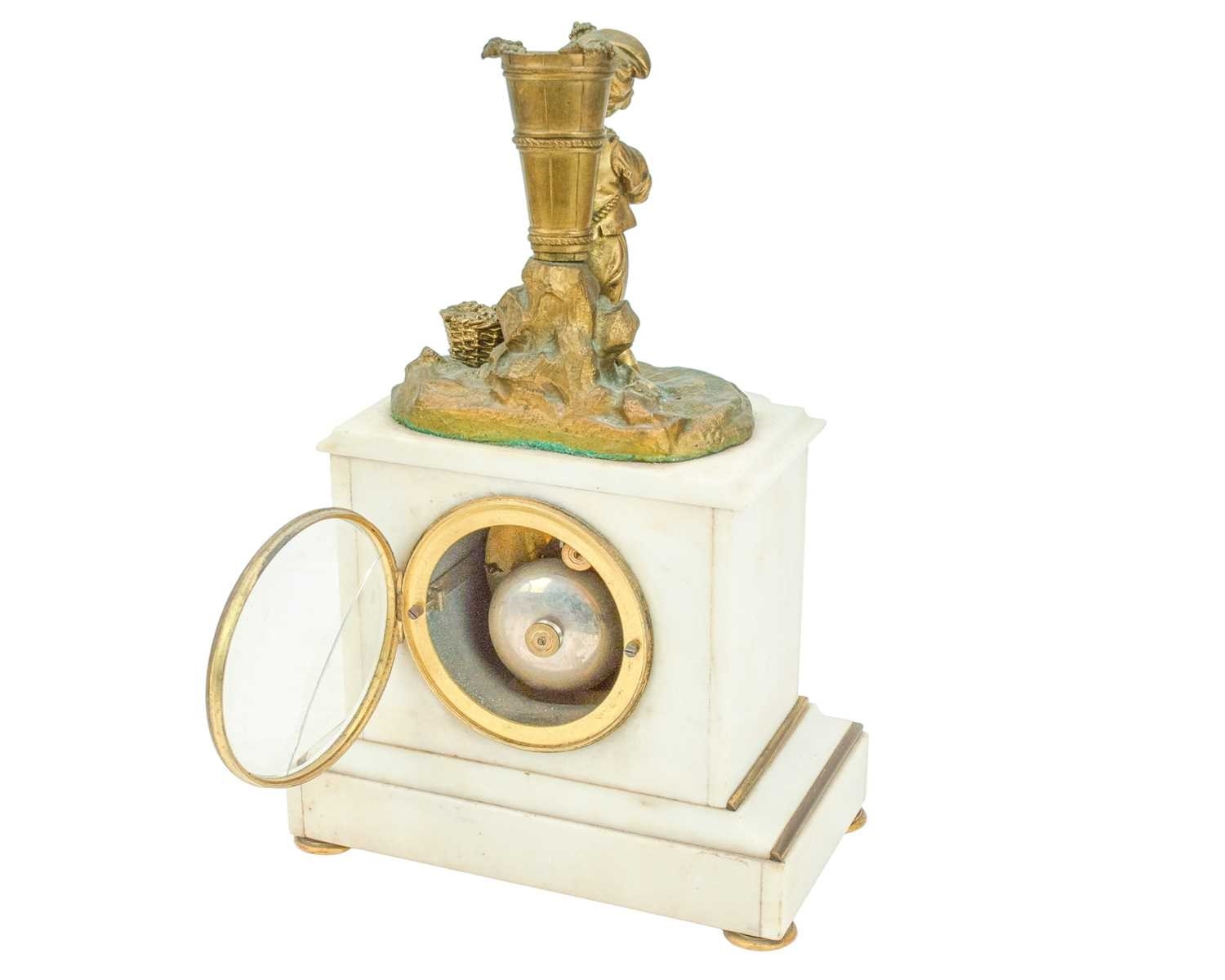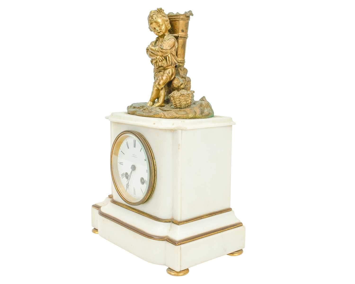A French white marble and ormolu mantel clock. Late 19th century, retailed by Connell, Cheapside (London), mounted with a figure of a young grape picker, the cylinder movement stamped Roblin, Paris, 20234, height 32.5cm. Lacks pendulum.