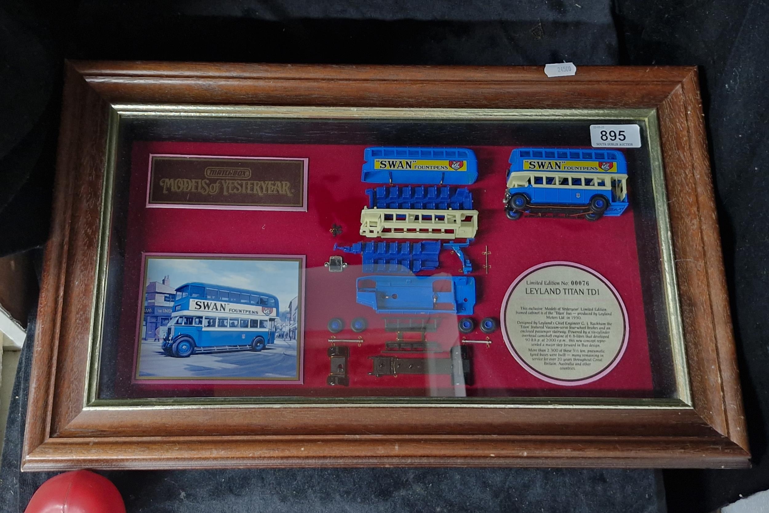 A framed limited edition Leyland Titan TDI. No. 00076. This exclusive 'Models of Yesteryear' framed cabinet is of the Titan bus - produced by Leyland motors Ltd; in 1930.