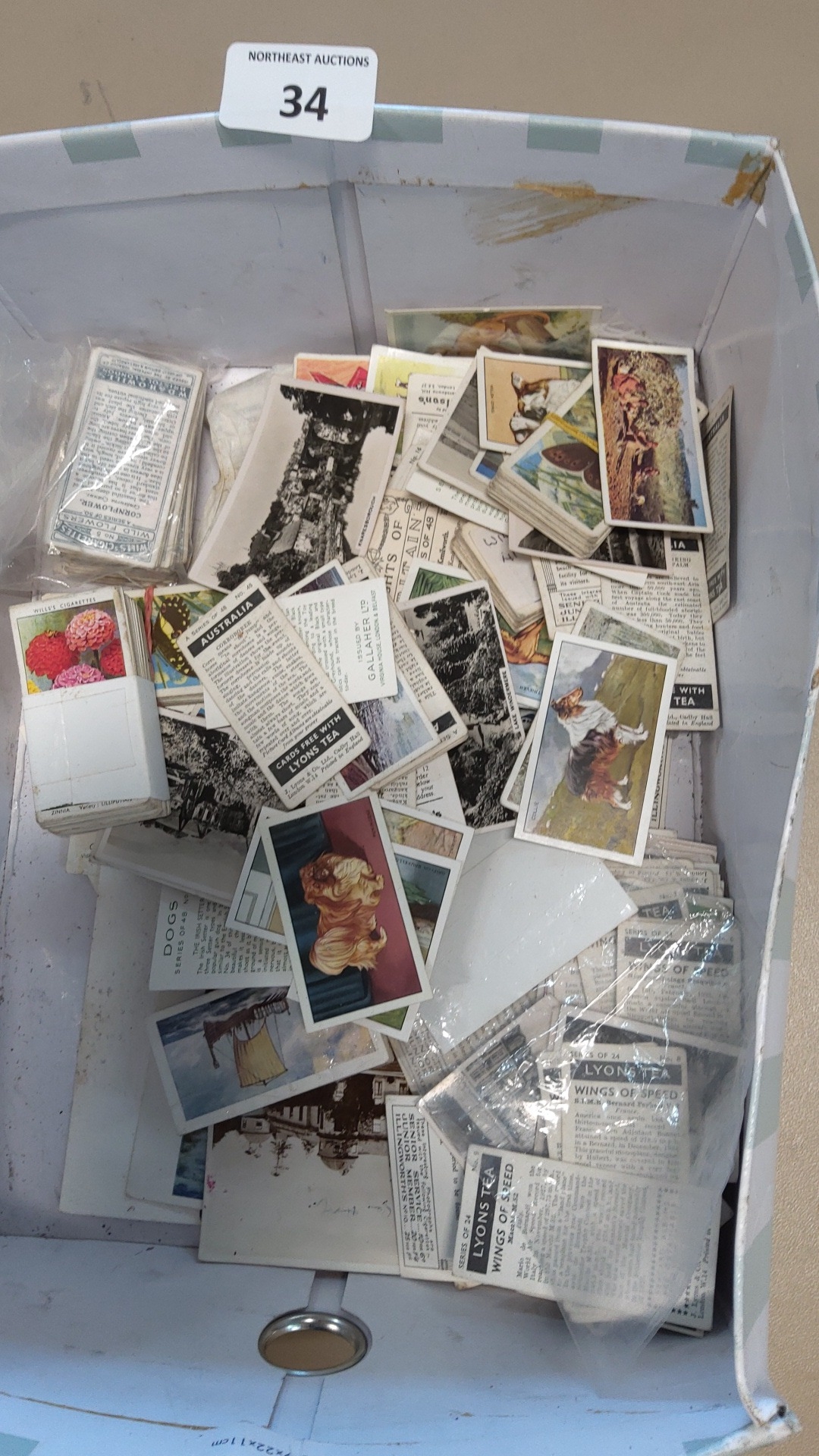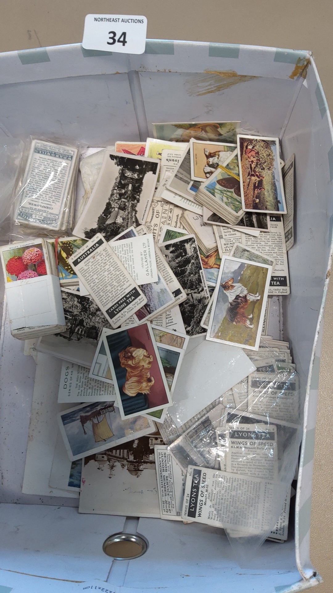Collection of vintage cigarette and tea insert cards, including examples by Wills’s Cigarettes and Lyons Tea, with subjects such as dogs, flowers, landscapes and transport; loose and in small groups within a box.