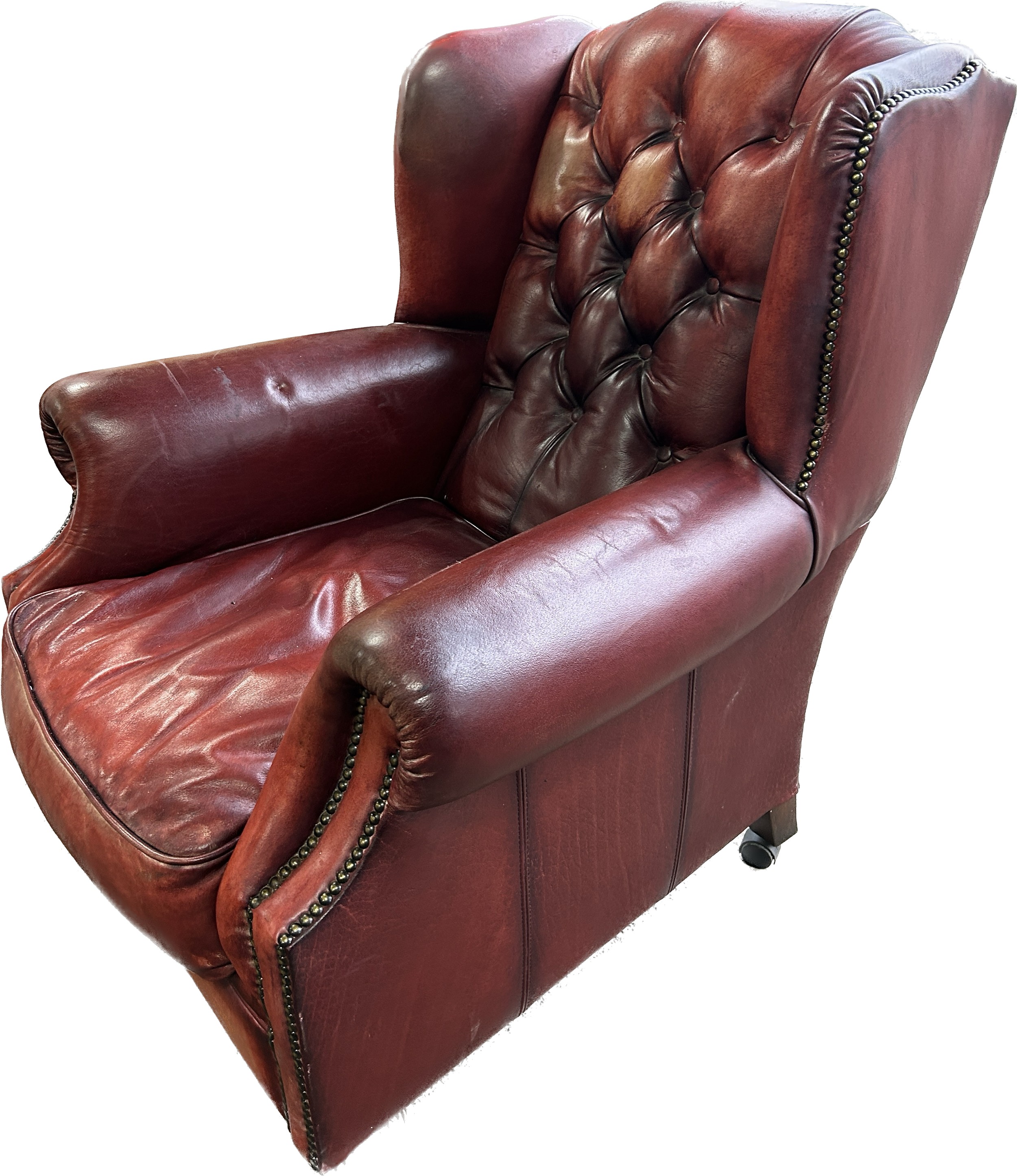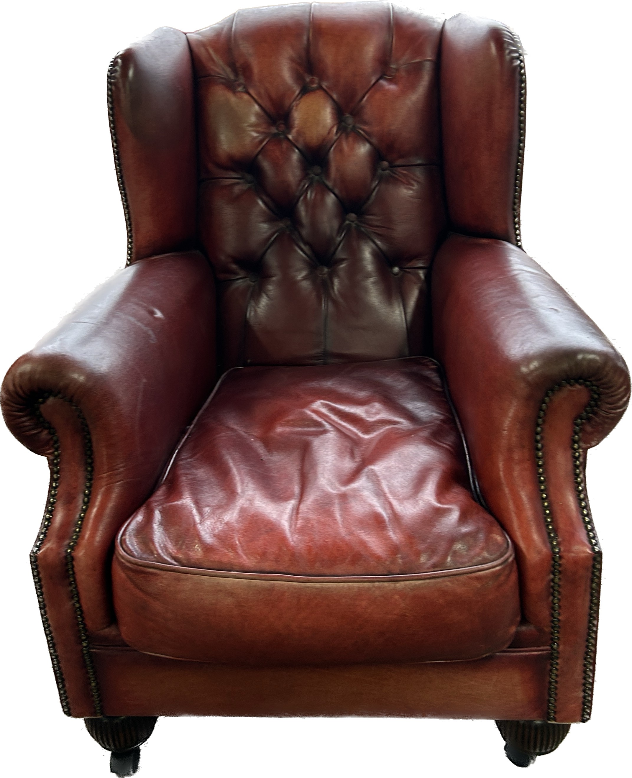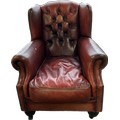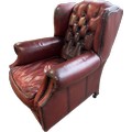 Ox blood leather Chestefield armchair, approximate measurements:Height 39 inches, width 34 inches, depth 39 inches