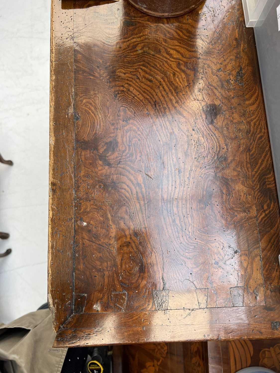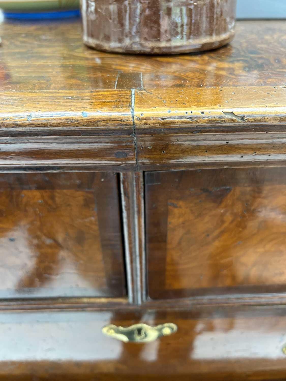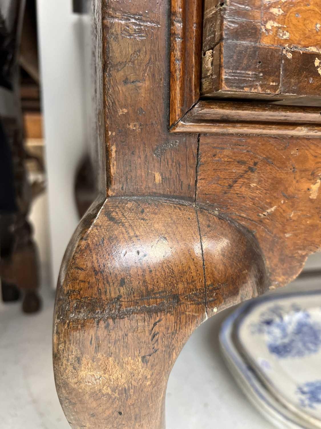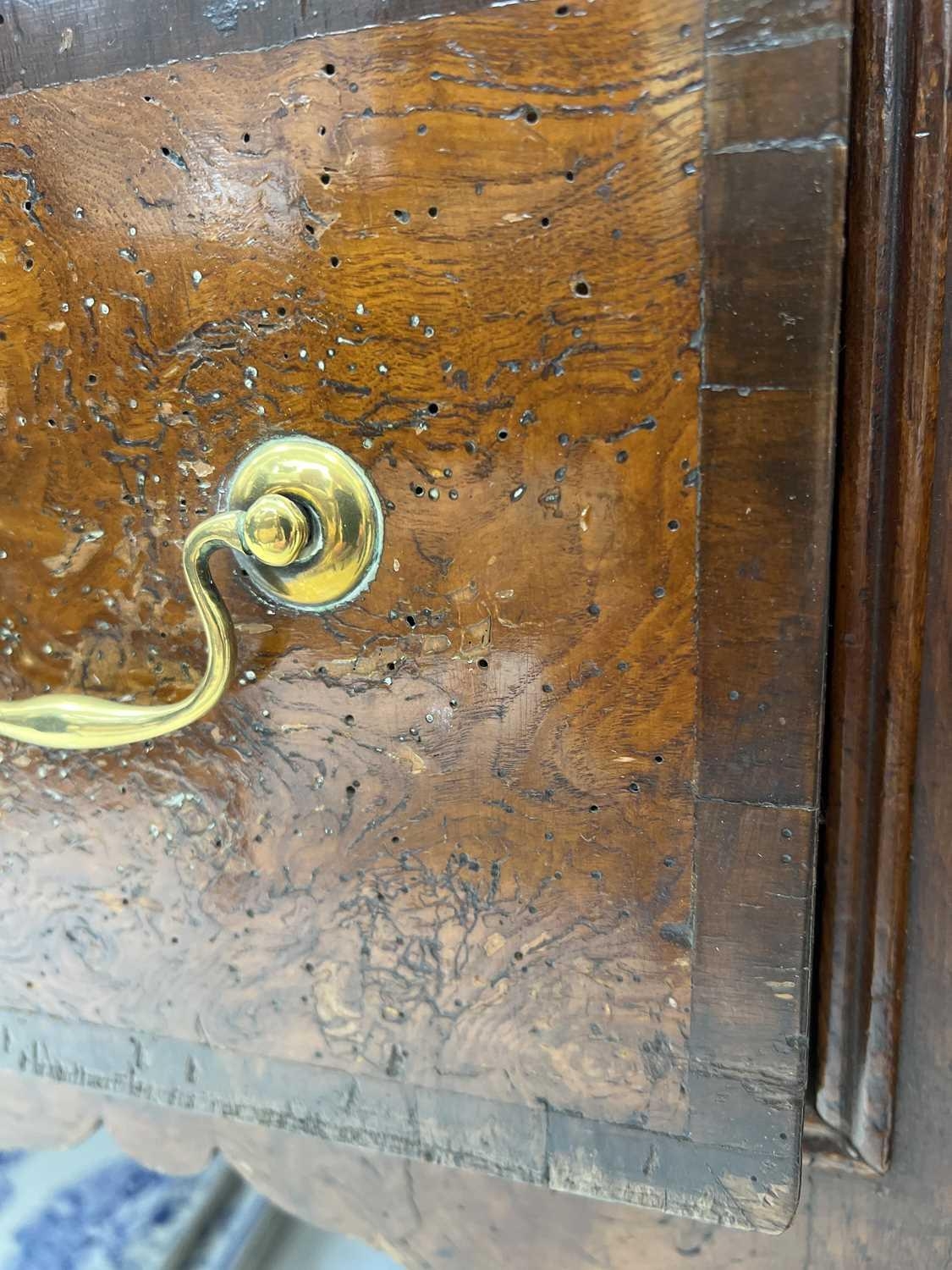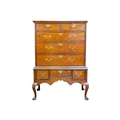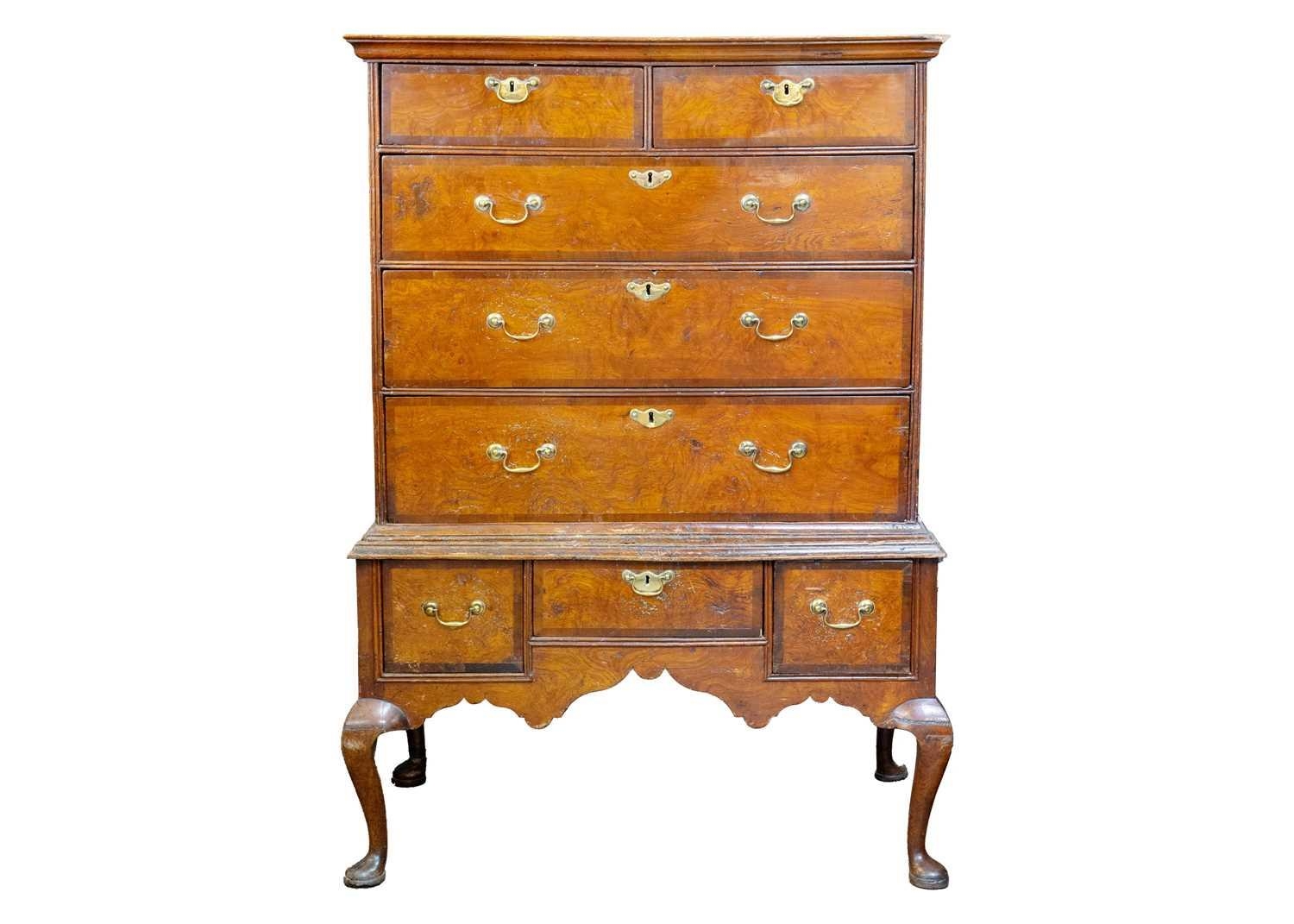 A George II burr elm and yew banded chest on stand. The upper with two short and three long drawers the stand with a central drawer flanked by two deep drawers on cabriole legs, height 146.5cm width 101cm depth 57.5cm. This handsome piece is in excellent useable condition although, one impediment is a broken back left foot. There is much old woodworm and the handles have been replaced. Please see the numerous images.