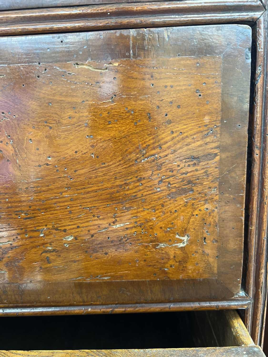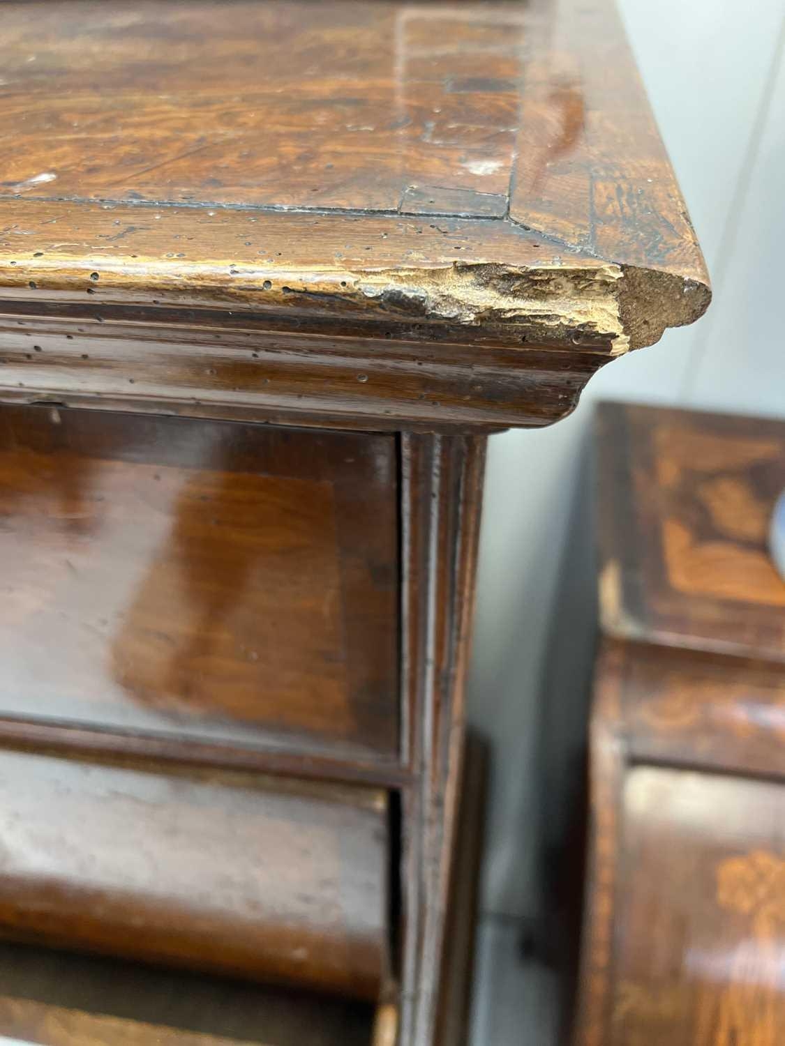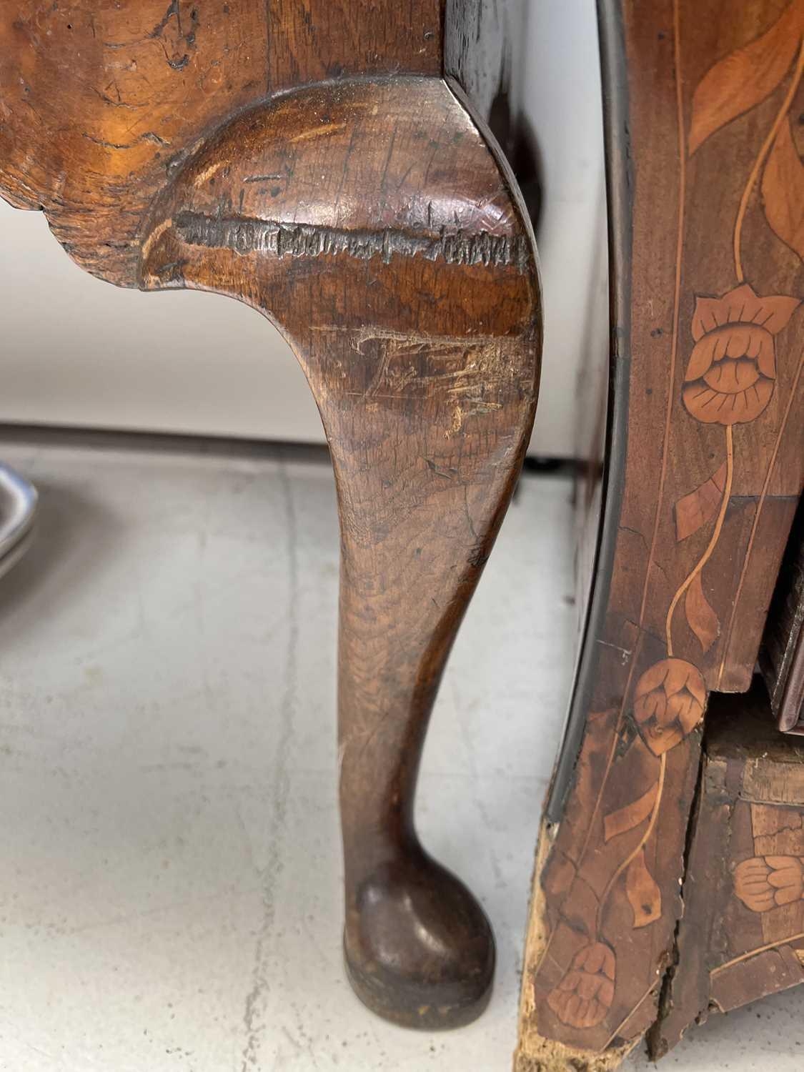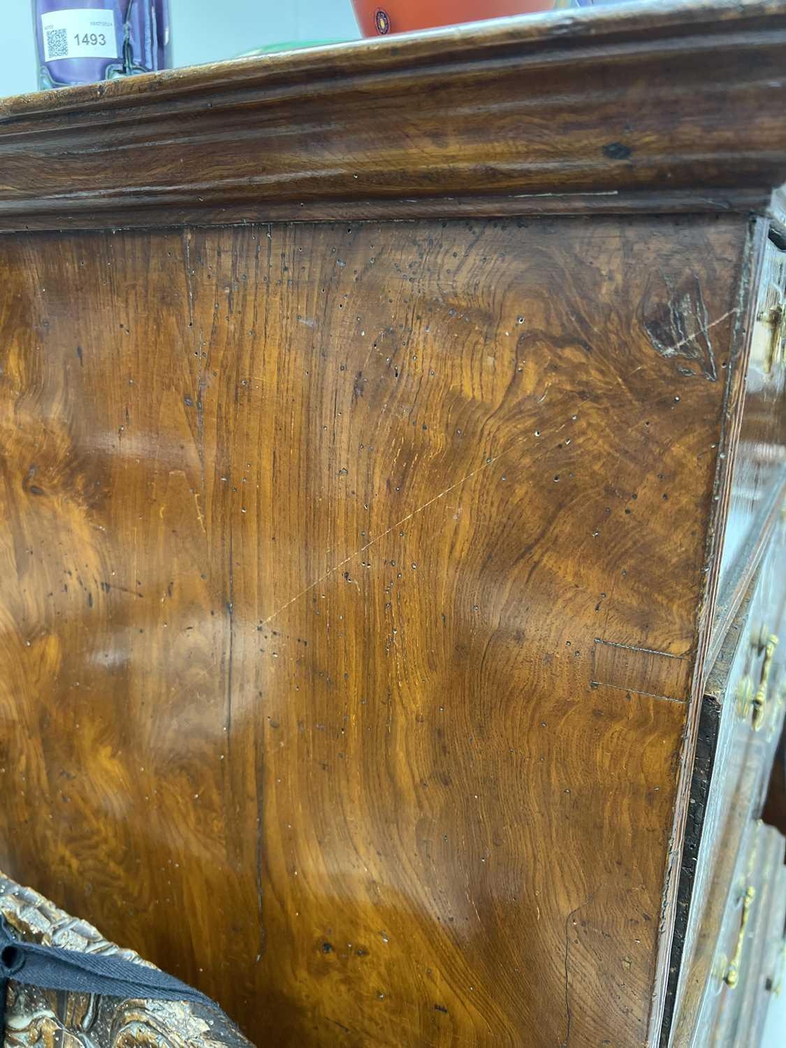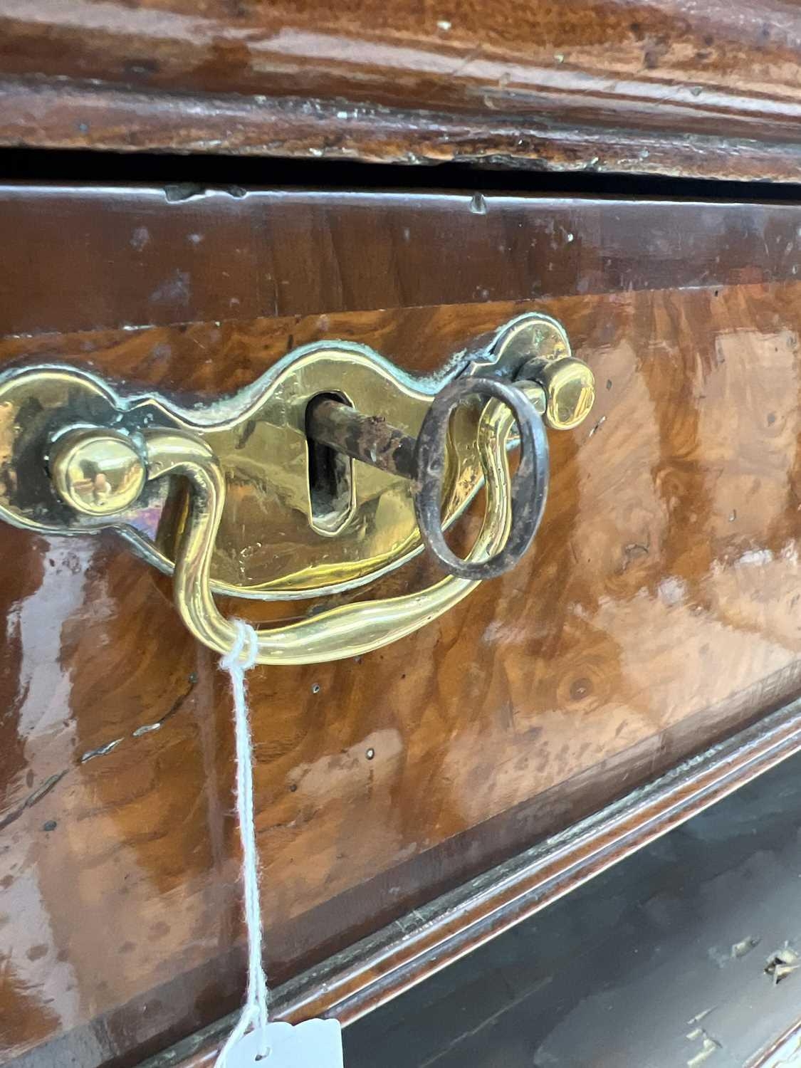 A George II burr elm and yew banded chest on stand. The upper with two short and three long drawers the stand with a central drawer flanked by two deep drawers on cabriole legs, height 146.5cm width 101cm depth 57.5cm. This handsome piece is in excellent useable condition although, one impediment is a broken back left foot. There is much old woodworm and the handles have been replaced. Please see the numerous images.