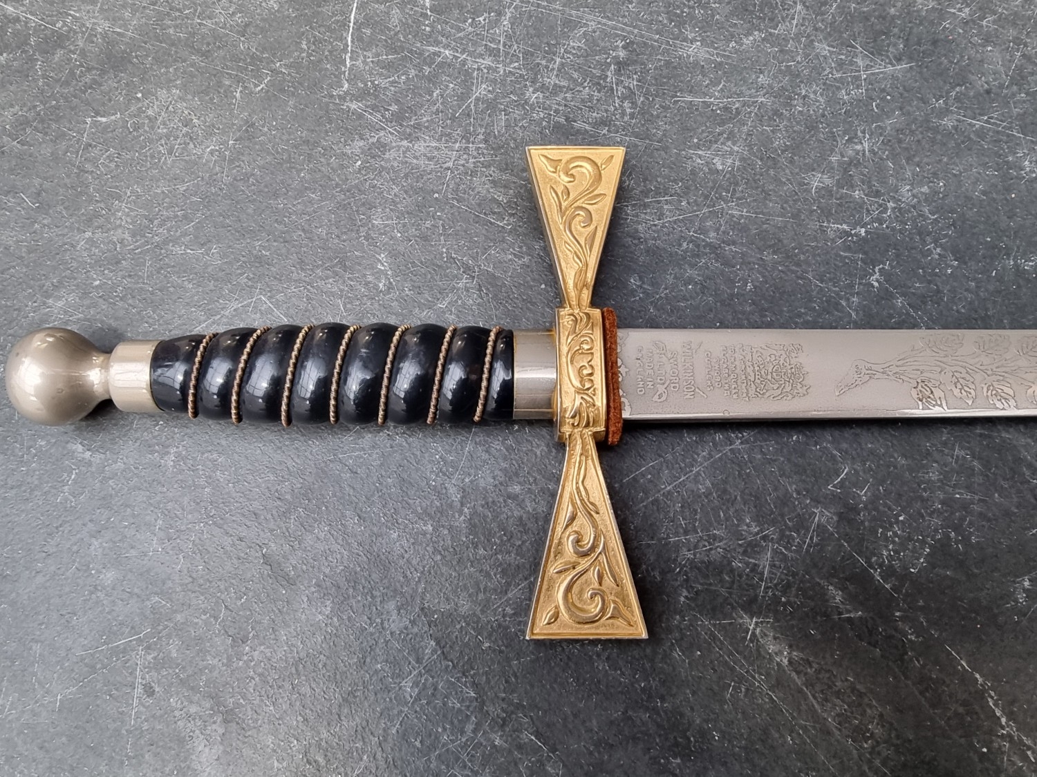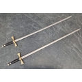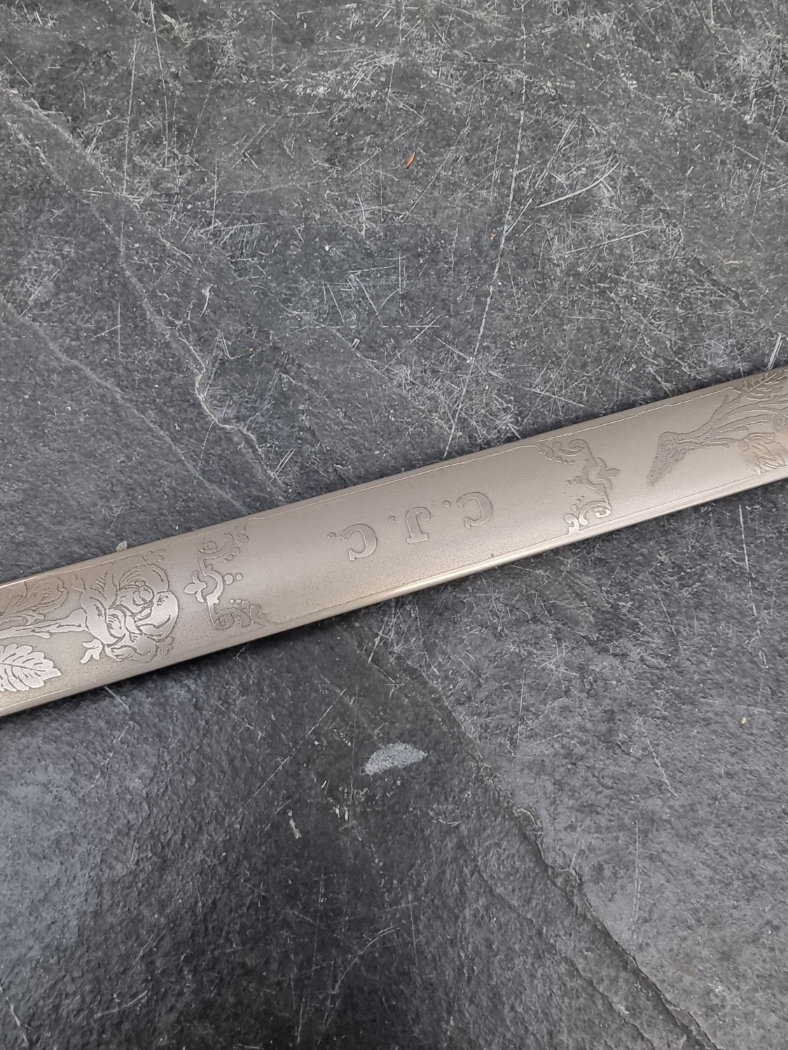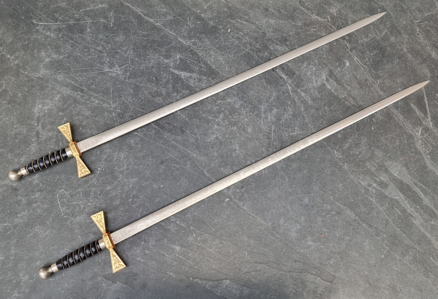 A pair of presentation swords, by Wilkinson, engraved with roses and foliage to one side and initialled C.J.C, overall length 90cm.