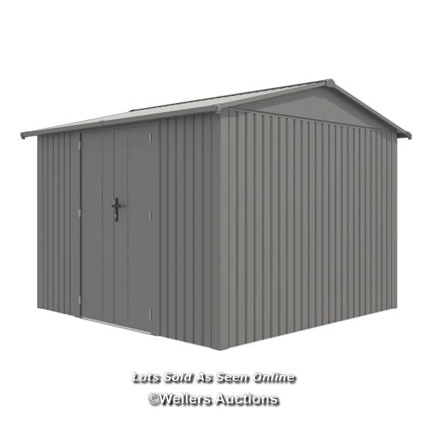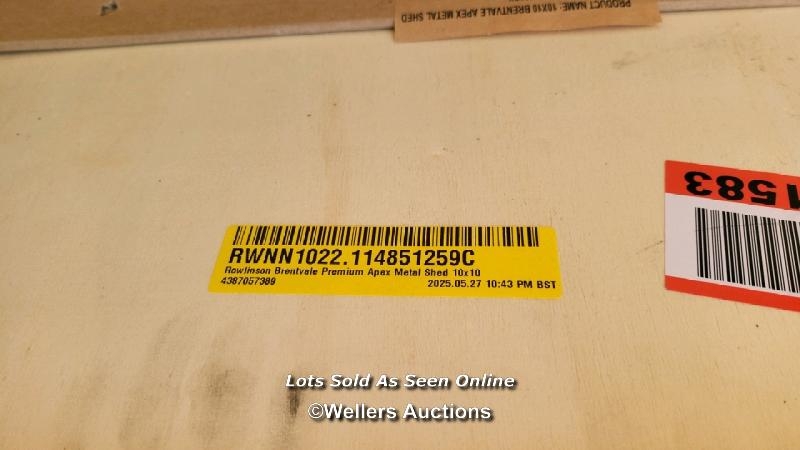 RRP: 1530 - ROWLINSON ROWLINSON BRENTVALE PREMIUM APEX METAL SHED 10X10 / 1 BOX / OVERALL : 296CM W X 304CM D X 228CM H / SEE IMAGES / BOX NOT FULLY CHECKED