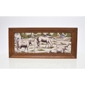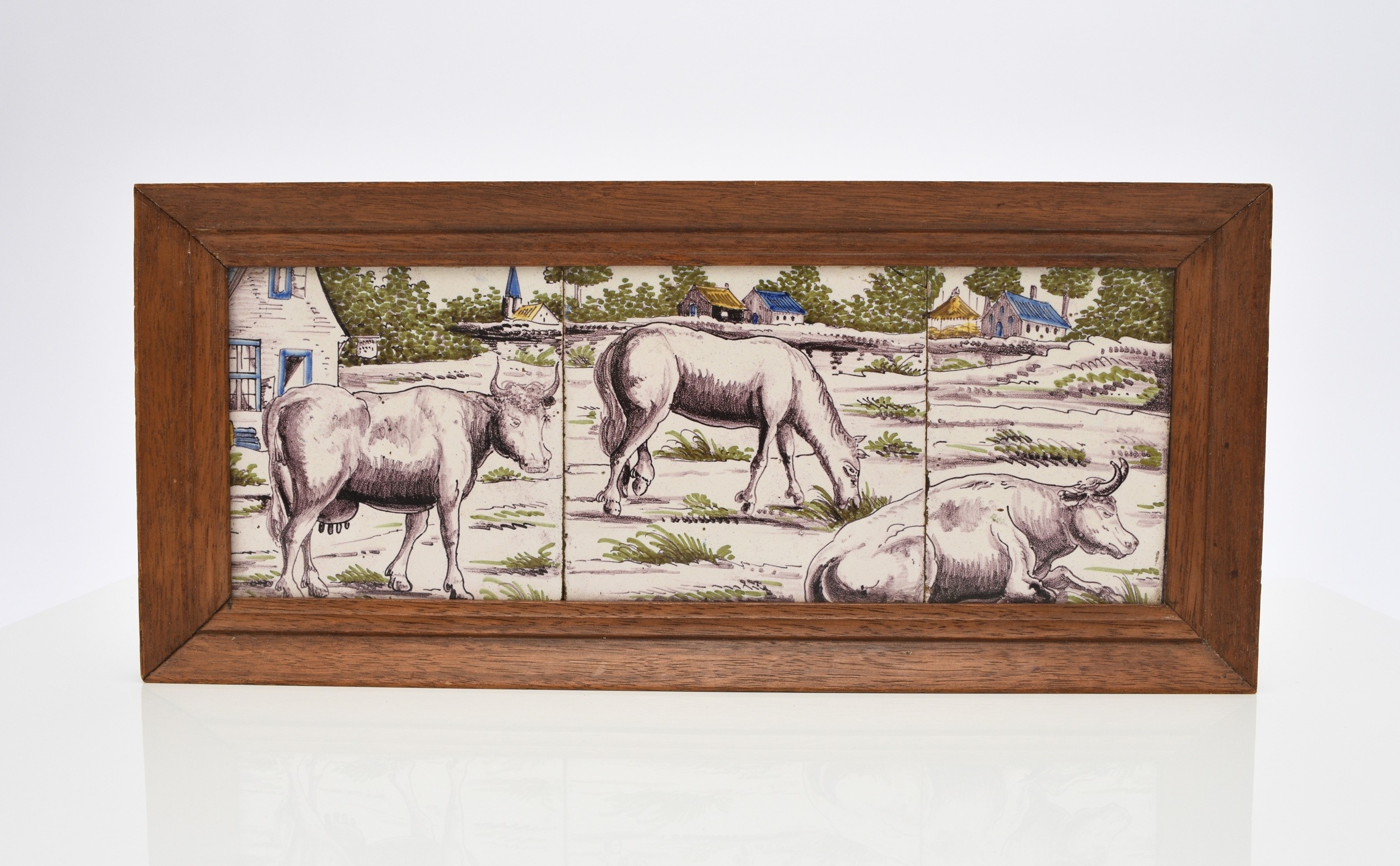 A Dutch delft manganese and polychrome tile panel, 18th/19th century, decorated with cattle and a horse grazing in a landscape with church and farm buildings beyond, formed as three tiles, framed, overall dimensions 39.2cm wide x 17.5cm high