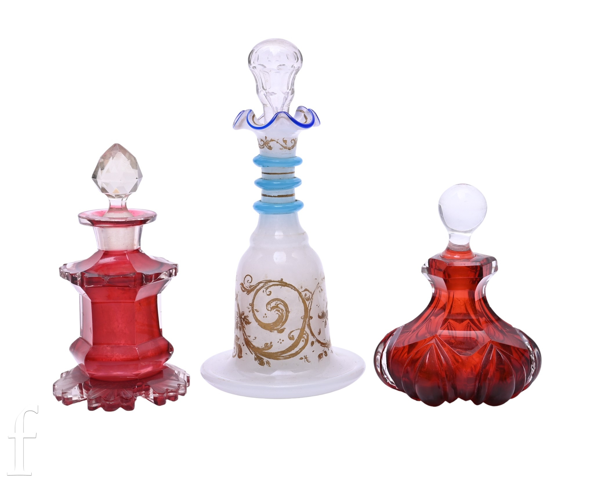 A mid 19th Century Bohemian scent bottle of low shouldered form decorated with gilded scrolls over the opal ground below turquoise blue three ring neck with clear crystal stopper, height 17cm, together with two similar period facet cut ruby examples. (3)
