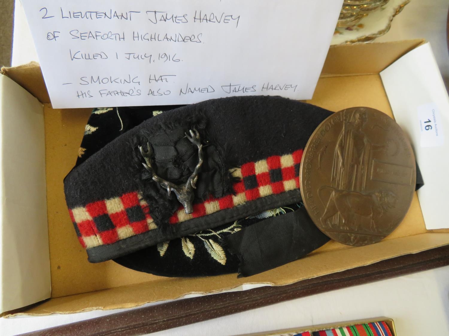 The Death plaque and bonnet for 2nd Lieut. James Harvey of the Seaforth Highlanders killed in action 1st July 1916 plus a smokers hat