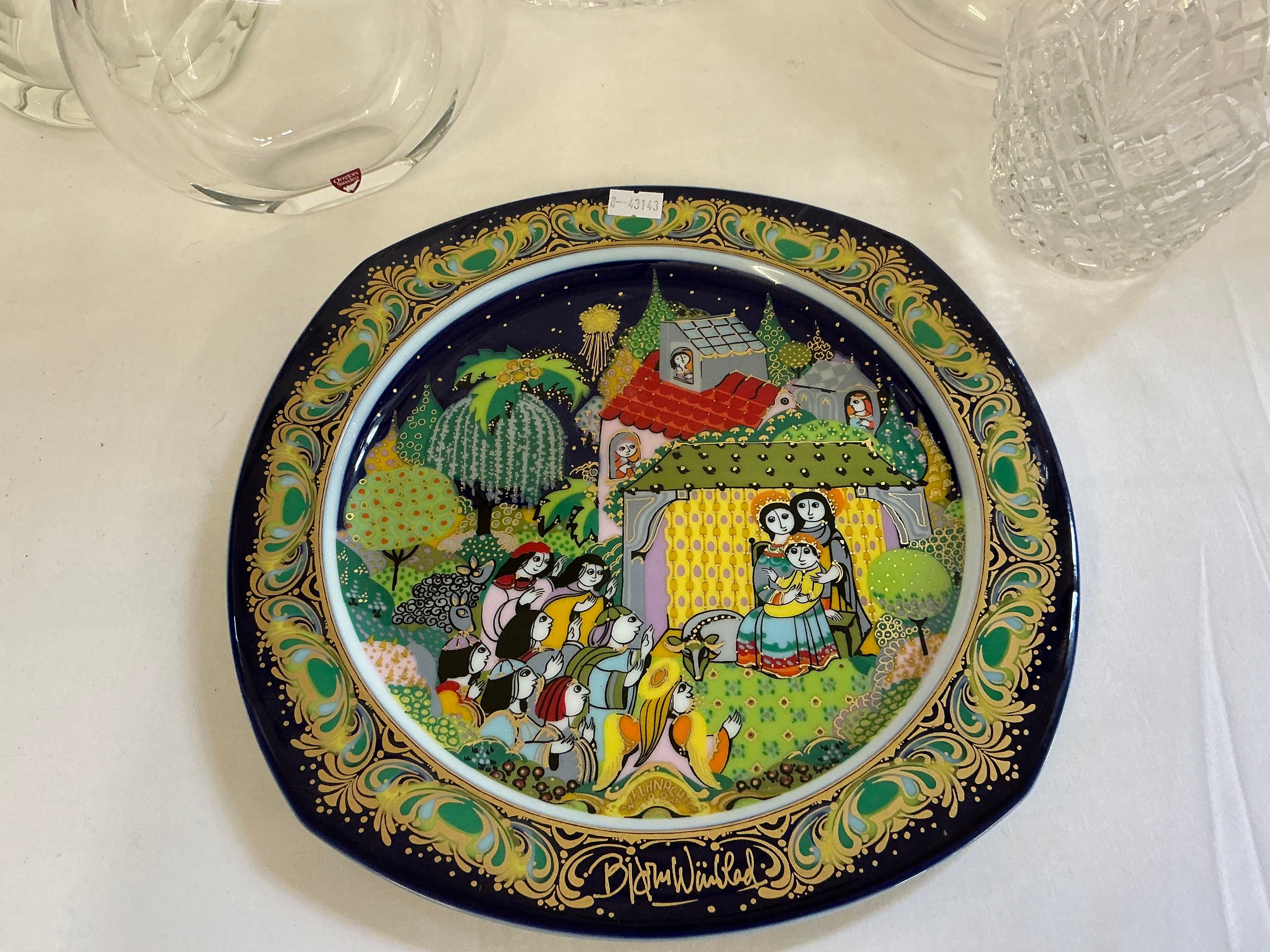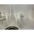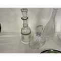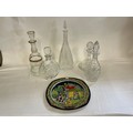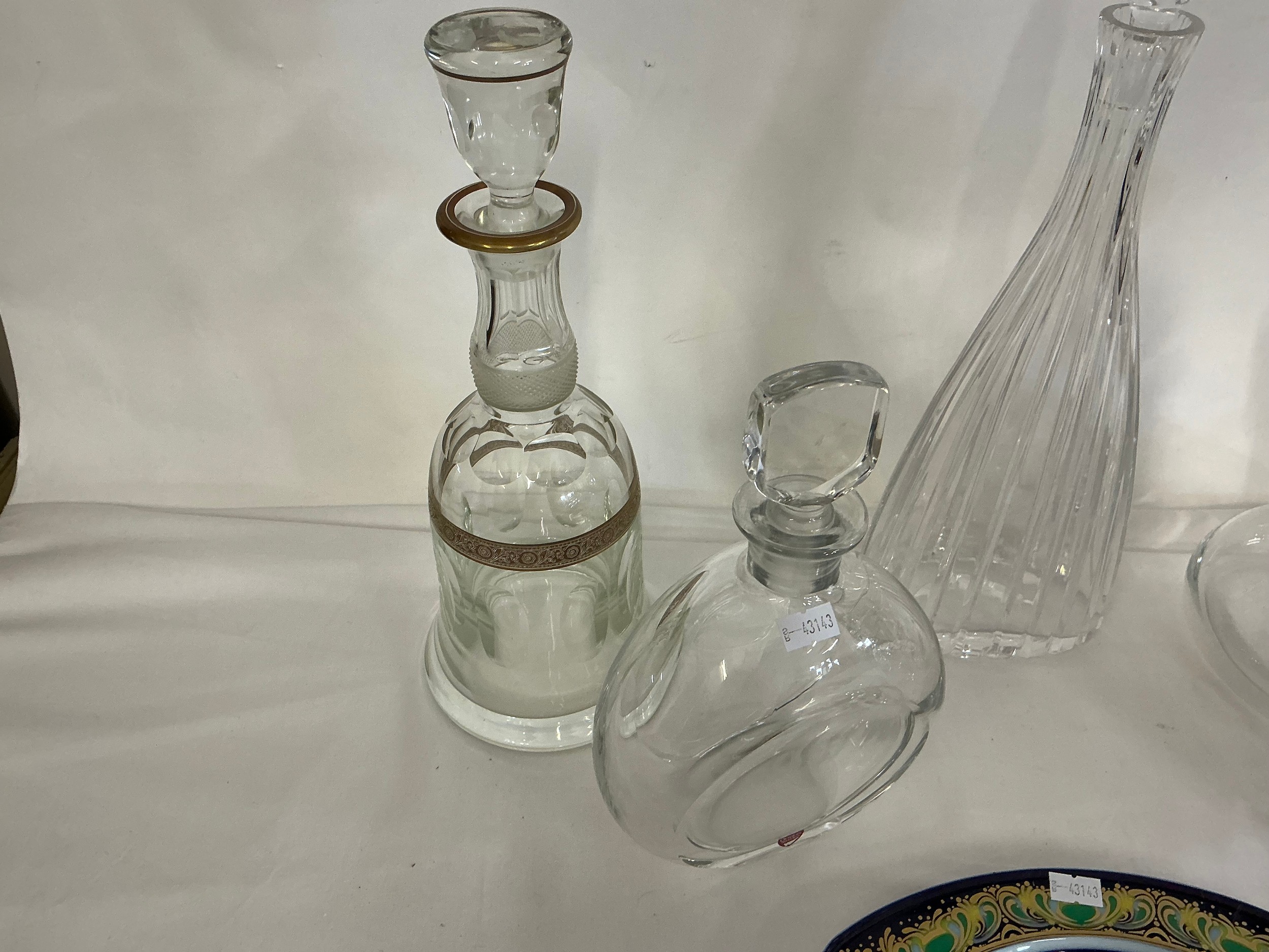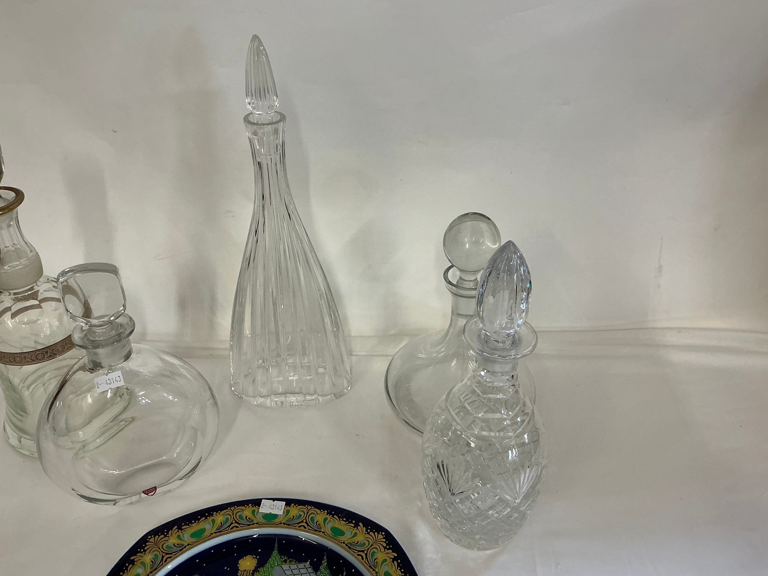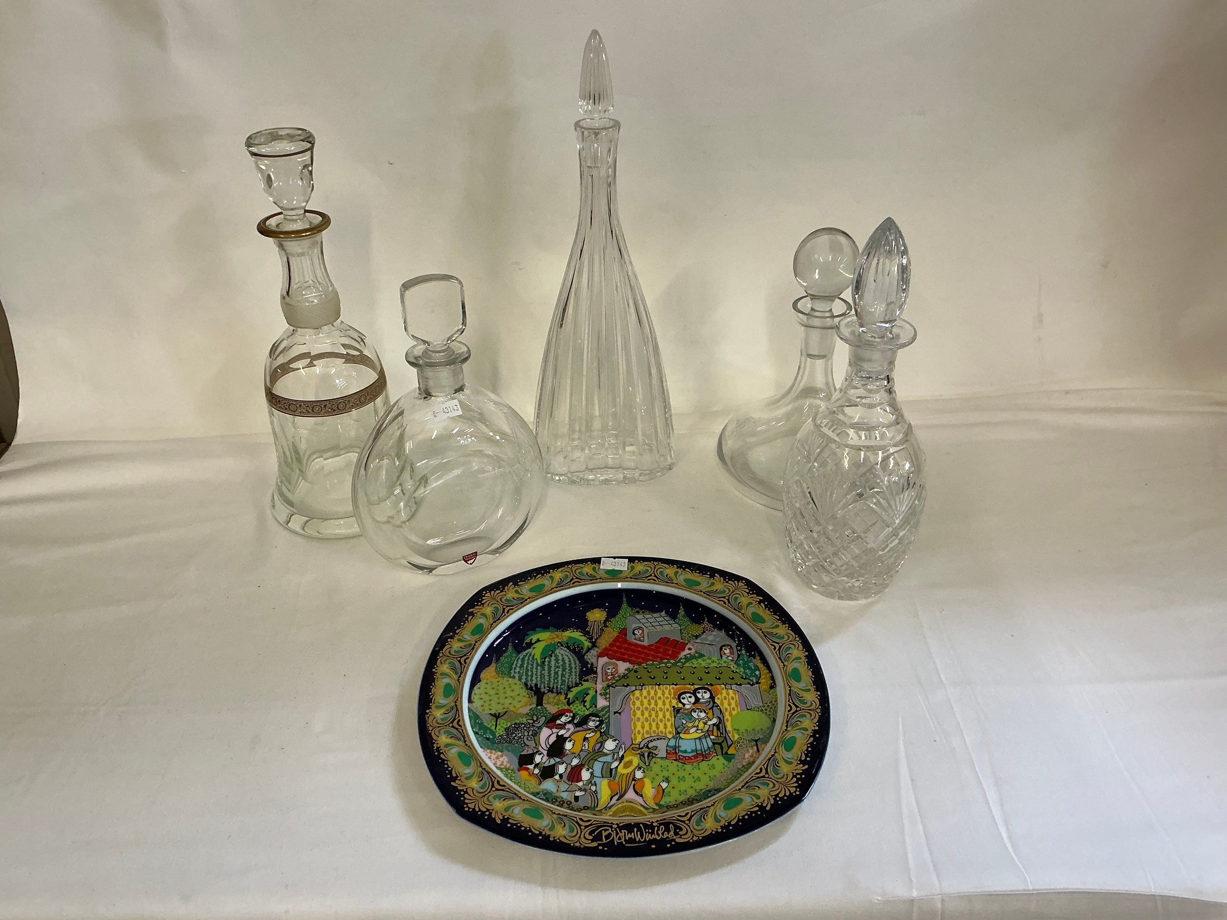 An Orrefors Glass Decanter & Stopper along with Four other Decanters & a Rosenthal Christmas Carol 1983 Plate.