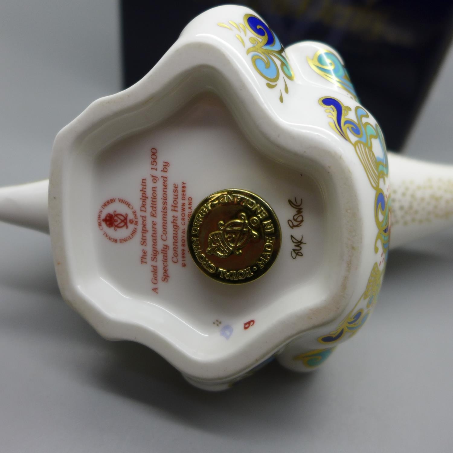 A Royal Crown Derby paperweight - Striped Dolphin, one of a Gold Signature Limited Edition of 1500, commissioned by Connaught House in 1999, signed by designer Sue Rowe, gold stopper and red Royal Crown Derby backstamp, boxed