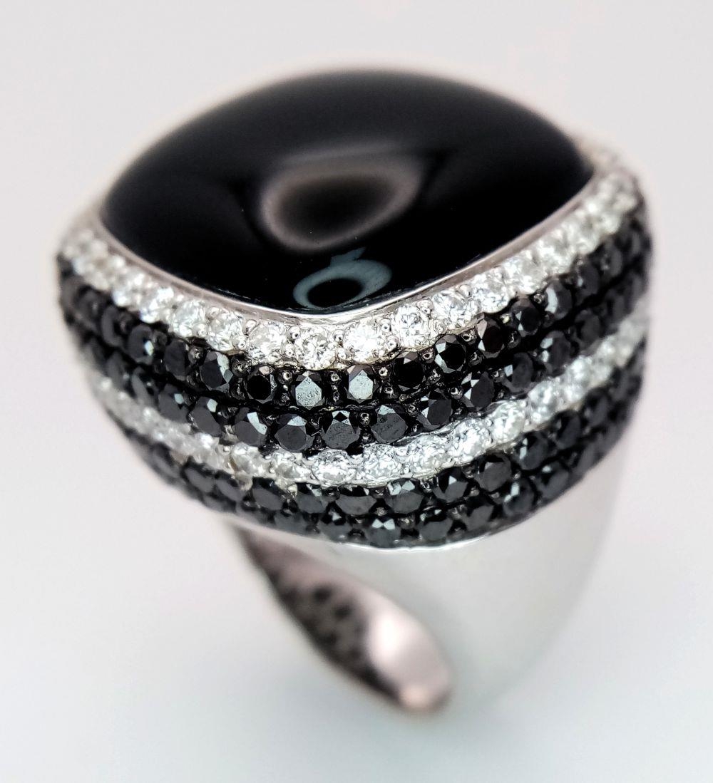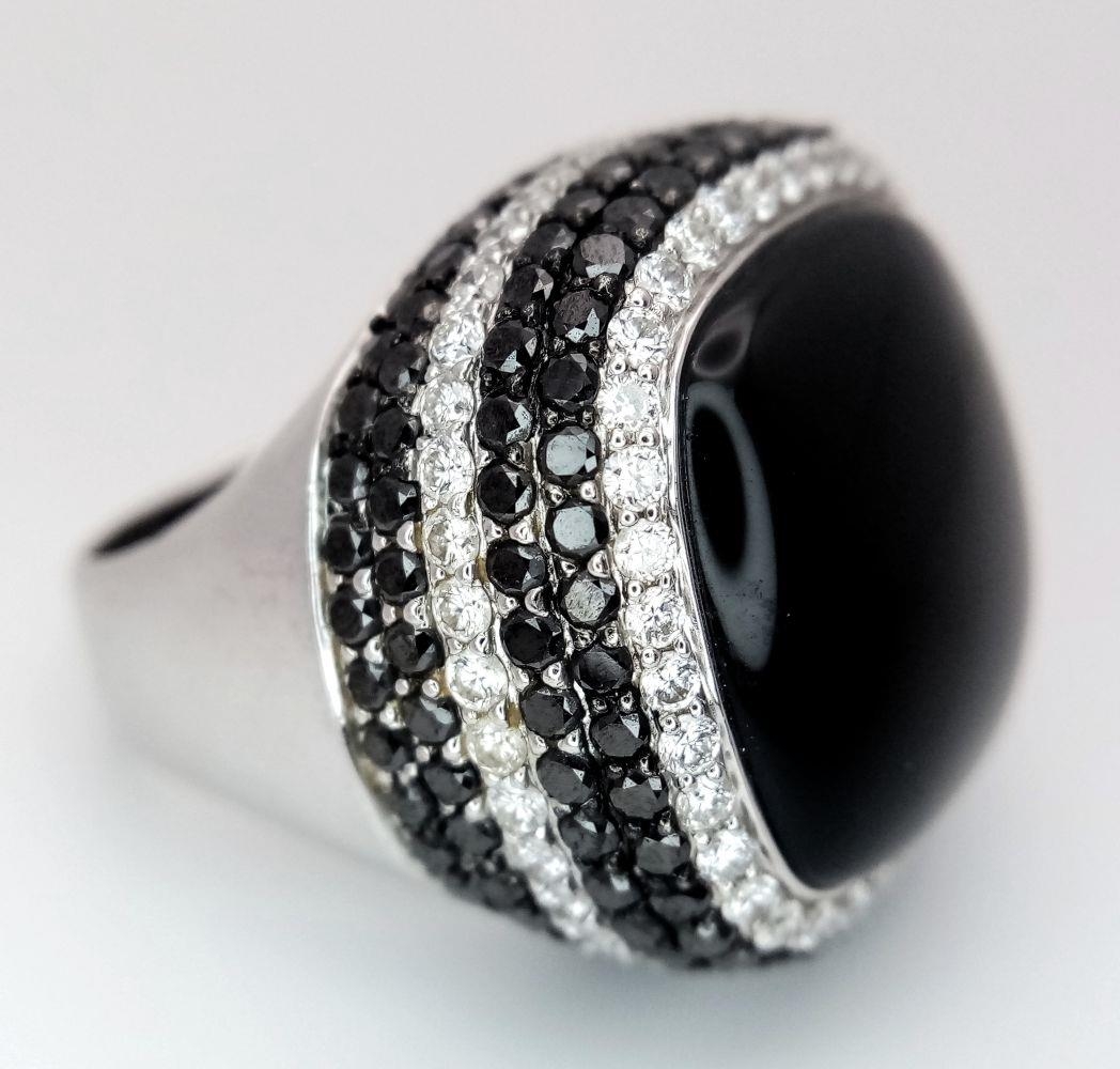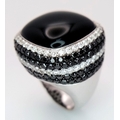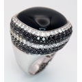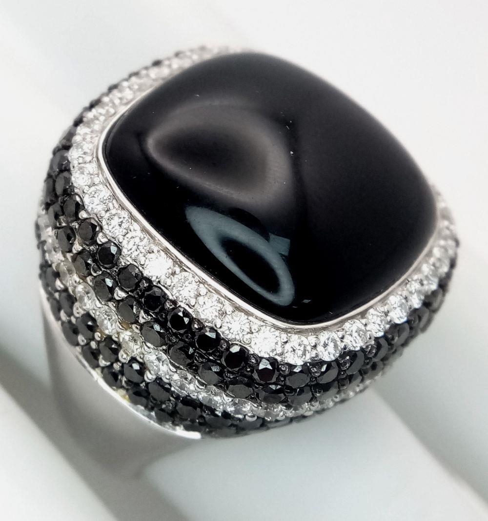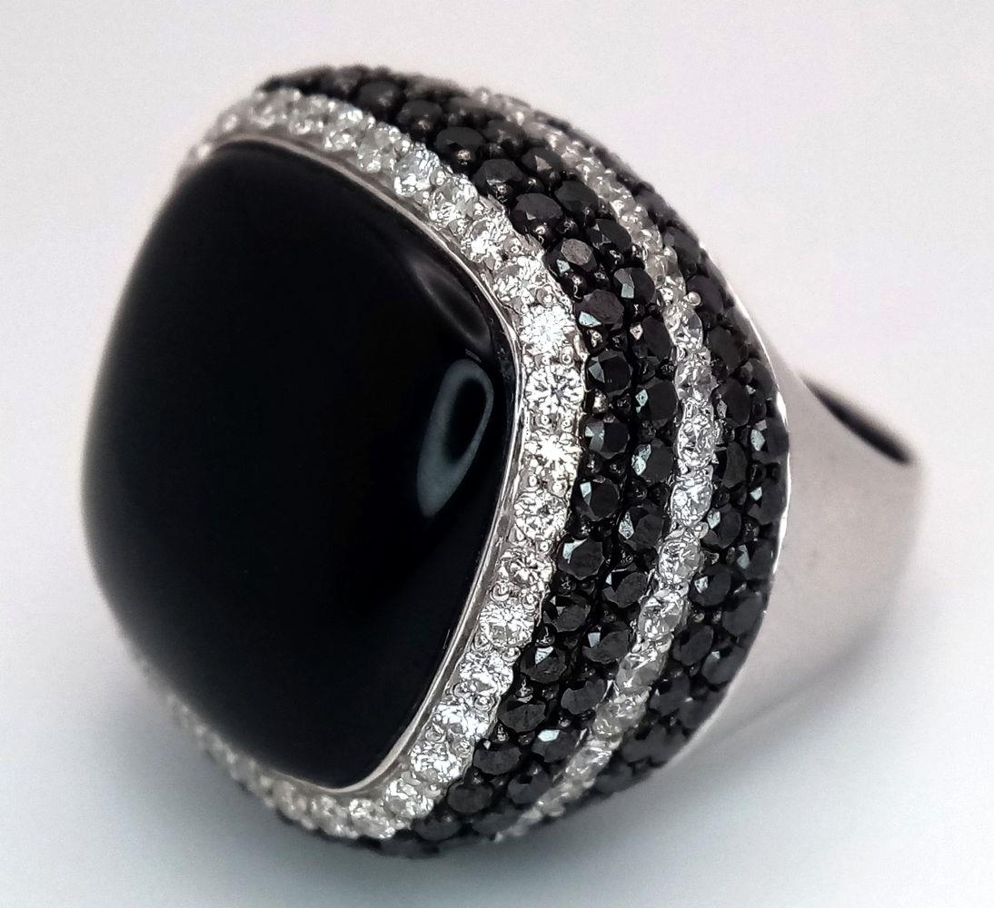 An 18K White Gold, Diamond and Onyx Dress Ring. Make a statement with this rich square of black onyx surrounded by six halos of black and white diamonds! 3ctw approx. Impressive. Ref: 0117217. Size O. 21.7g total weight.
