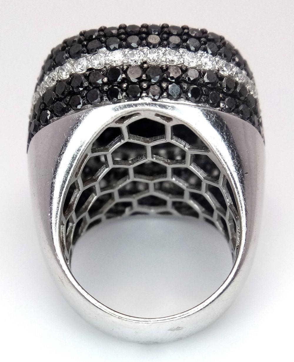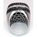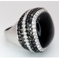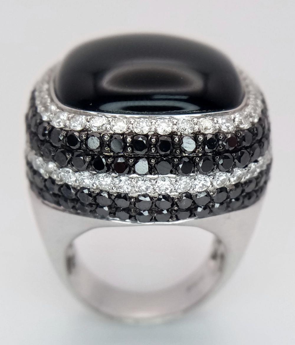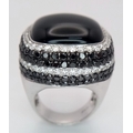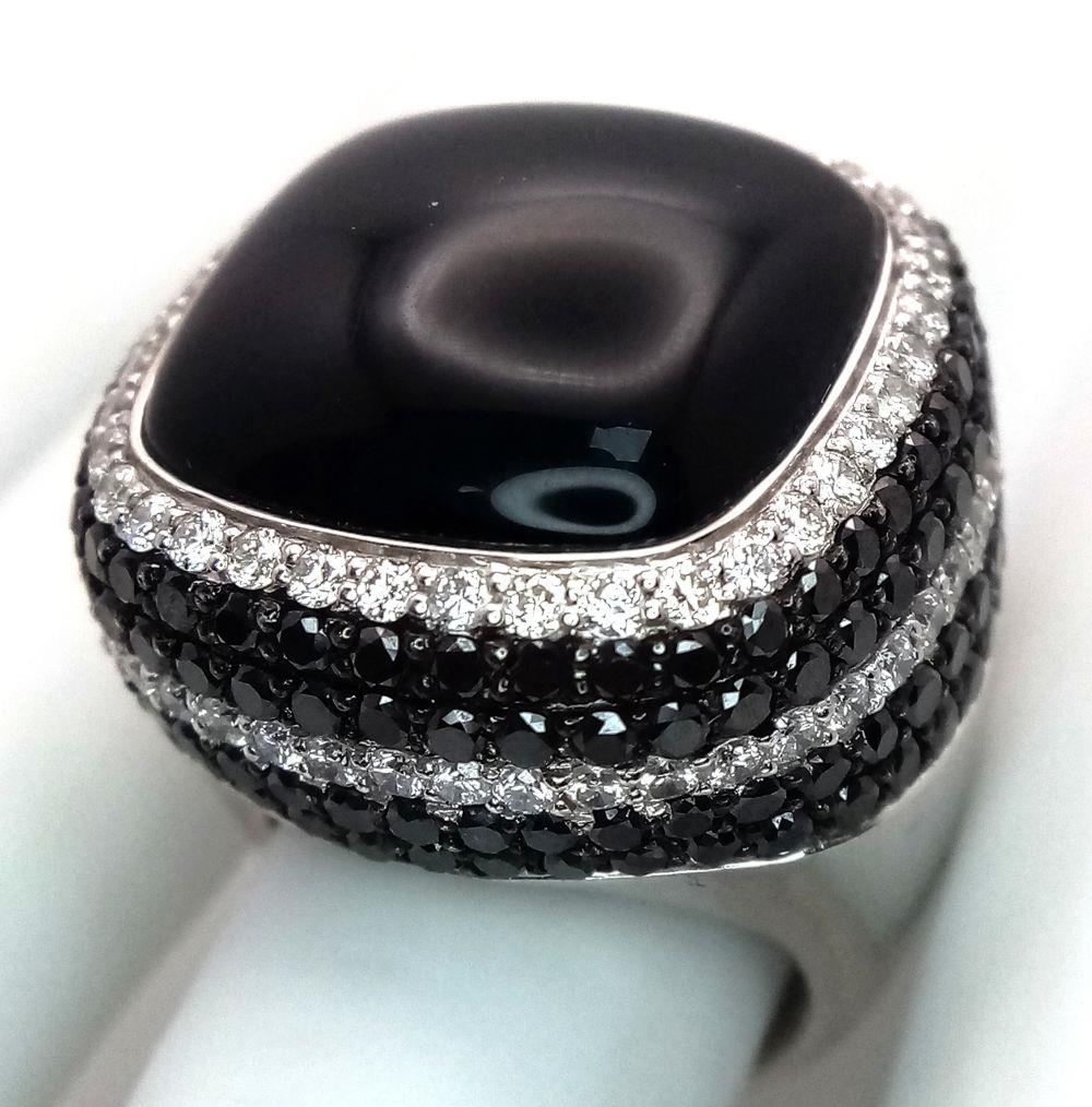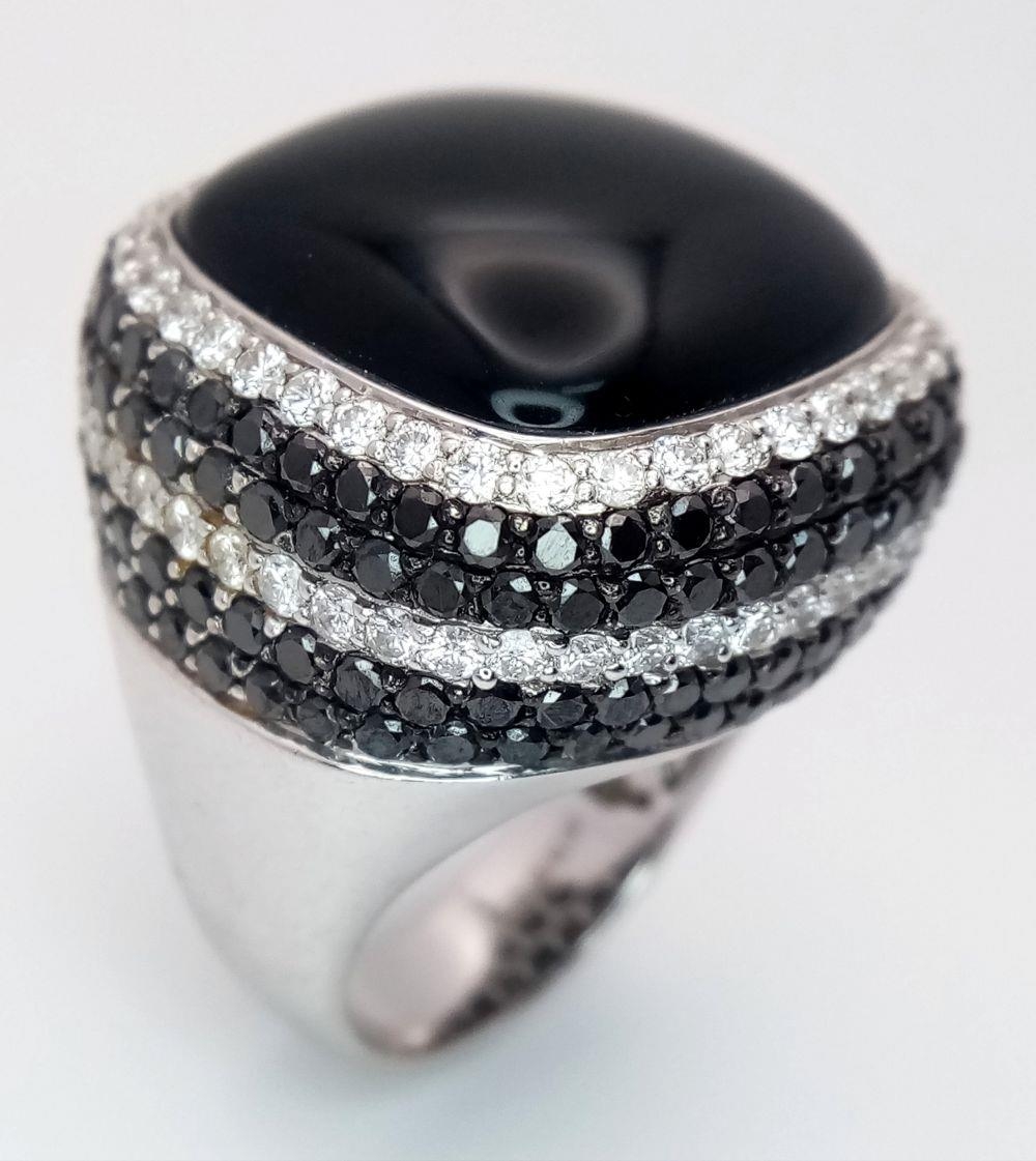 An 18K White Gold, Diamond and Onyx Dress Ring. Make a statement with this rich square of black onyx surrounded by six halos of black and white diamonds! 3ctw approx. Impressive. Ref: 0117217. Size O. 21.7g total weight.